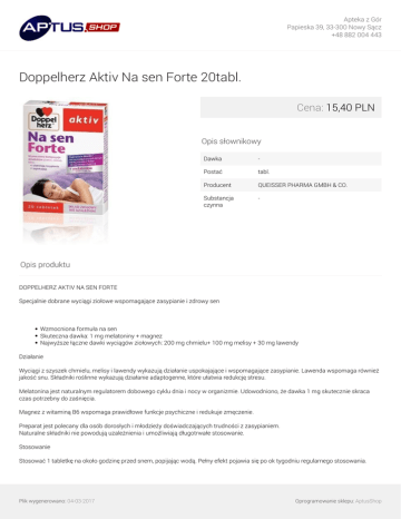 Apteka z Gór Papieska 39, 33-300 Nowy Sącz +48 882 004 443 Doppelherz Aktiv Na sen Forte 20tabl. Cena: 15,40 PLN Opis słownikowy Dawka - Postać tabl. Producent QUEISSER PHARMA GMBH & CO. Substancja czynna - Opis produktu DOPPELHERZ AKTIV NA SEN FORTE Specjalnie dobrane wyciągi ziołowe wspomagające zasypianie i zdrowy sen Wzmocniona formuła na sen Skuteczna dawka: 1 mg melatoniny + magnez Najwyższe łączne dawki wyciągów ziołowych: 200 mg chmielu+ 100 mg melisy + 30 mg lawendy Działanie Wyciągi z szyszek chmielu, melisy i lawendy wykazują działanie uspokajające i wspomagające zasypianie. Lawenda wspomaga również jakość snu. Składniki roślinne wykazują działanie adaptogenne, które ułatwia redukcję stresu. Melatonina jest naturalnym regulatorem dobowego cyklu dnia i nocy w organizmie. Udowodniono, że dawka 1 mg skutecznie skraca czas potrzebny do zaśnięcia. Magnez z witaminą B6 wspomaga prawidłowe funkcje psychiczne i redukuje zmęczenie. Preparat jest polecany dla osób dorosłych i młodzieży doświadczających trudności z zasypianiem. Naturalne składniki nie powodują uzależnienia i umożliwiają długotrwałe stosowanie. Stosowanie Stosować 1 tabletkę na około godzinę przed snem, popijając wodą. Pełny efekt pojawia się po ok tygodniu regularnego stosowania. Plik wygenerowano: 04-03-2017 Oprogramowanie sklepu: AptusShop Apteka z Gór Papieska 39, 33-300 Nowy Sącz +48 882 004 443 Korzystne działanie występuje przy stosowaniu 1 mg melatoniny niedługo przed snem. Nie należy przekraczać zalecanej porcji dziennej. Zasypianiu sprzyjają zdrowy tryb życia i zrównoważona dieta. Suplementy diety nie mogą być stosowane jako substytut (w zastępstwie) zróżnicowanej diety. Nie zaleca się stosowania przez kobiety w ciązy i karmiące piersią oraz w przypadku nadwrażliwości na lawendę oraz inne składniki preparatu. Plik wygenerowano: 04-03-2017 Powered by TCPDF (www.tcpdf.org) Oprogramowanie sklepu: AptusShop