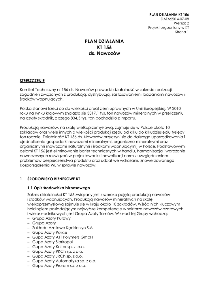 PLAN DZIAŁANIA KT 156 DATA:2014-07-08 Wersja: 2 Projekt uzgodniony w KT Strona 1 PLAN DZIAŁANIA KT 156 ds. Nawozów STRESZCZENIE Komitet Techniczny nr 156 ds. Nawozów prowadzi działalność w zakresie realizacji zagadnień związanych z produkcją, dystrybucją, zastosowaniem i badaniami nawozów i środków wapnujących. Polska stanowi trzeci co do wielkości areał ziem uprawnych w Unii Europejskiej. W 2010 roku na rynku krajowym znalazło się 3317,1 tys. ton nawozów mineralnych w przeliczeniu na czysty składnik, z czego 834,5 tys. ton pochodziło z importu. Produkcją nawozów, na skalę wielkoprzemysłową, zajmuje się w Polsce około 10 zakładów oraz wiele innych o wielkości produkcji rzędu od kilku do kilkudziesięciu tysięcy ton rocznie. Działalność KT 156 ds. Nawozów przyczyni się do dalszego uporządkowania i ujednolicenia gospodarki nawozami mineralnymi, organiczno-mineralnymi oraz organicznymi (nawozami naturalnymi i środkami wapnującymi) w Polsce. Podstawowymi celami KT 156 jest eliminowanie barier technicznych w handlu, harmonizacja i wdrażanie nowoczesnych rozwiązań w projektowaniu i nowelizacji norm z uwzględnieniem problemów bezpieczeństwa produktu oraz udział we wdrażaniu znowelizowanego Rozporządzenia WE w sprawie nawozów. 1 ŚRODOWISKO BIZNESOWE KT 1.1 Opis środowiska biznesowego Zakres działalności KT 156 związany jest z szeroko pojętą produkcją nawozów i środków wapnujących. Produkcją nawozów mineralnych na skalę wielkoprzemysłową zajmuje się w kraju około 10 zakładów. Wśród nich kluczowym holdingiem posiadającym najwyższe kompetencje w sektorze nawozów azotowych i wieloskładnikowych jest Grupa Azoty Tarnów. W skład tej Grupy wchodzą; Grupa Azoty Puławy Grupa Azoty Zakładu Azotowe Kędzierzyn S.A Gupa Azoty Police Gupa Azoty ATT Polymers GmbH Gupa Azoty Siarkopol Gupa Azoty Koltar sp. z o.o. Gupa Azoty PKCh sp. z o.o. Gupa Azoty JRCh sp. z o.o. Gupa Azoty Automatyka sp. z o.o. Gupa Azoty Prorem sp. z o.o. PLAN DZIAŁANIA KT 156 DATA:2014-07-08 Wersja: 2 Projekt uzgodniony w KT Strona 2 Innymi zakładami nawozowymi na polskim rynku są zakłady „Anwil” Włocławek S.A., Luvena S.A. w Lubaniu, Fosfan Szczecin S.A. i ZCh „Alwernia”. Oprócz tych zakładów funkcjonuje wiele innych produkujących środki wapnujące i nawozy specjalistyczne. Do nich można zaliczyć ZCh „Złotniki” S.A., Intermag sp. z o.o., Adipol Sp. z o.o. czy Inco Veritas S.A. Polska jest 3 co do wielkości areałem ziem uprawnych wśród krajów UE, ale wciąż nie tak dużym odbiorcą nawozów jakim być powinna. Stąd perspektywy dla zwiększenia produkcji i sprzedaży. 1.2 Wskaźniki ilościowe dotyczące środowiska biznesowego Na rynku krajowym w latach 2008-2010 znalazło się (wg GUS - Gospodarka materiałowa) odpowiednio 3365,3; 2588,1 i 3317,1 tys. ton nawozów mineralnych w przeliczeniu na czysty składnik. Z tego import stanowił 815,4; 499,8 i 834,5 tys. ton. Na rynku mogą być wyłącznie nawozy spełniające wymagania Rozporządzenia (WE) Parlamentu Europejskiego i Rady nr 2003/2003 z dnia 13 października 2003 r. w sprawie nawozów lub nawozy dopuszczone do obrotu przez Ministra Rolnictwa i Rozwoju Wsi. Aktem obowiązującym w tej sprawie jest „Ustawa o nawozach i nawożeniu” - tekst jednolity z 01.09.2011 r. 2 OCZEKIWANE KORZYŚCI Z REALIZACJI PRAC KT Działalność KT 156 ds. Nawozów przyczyni się do dalszego uporządkowania i ujednolicenia gospodarki nawozami mineralnymi, naturalnymi i środkami wapnującymi w Polsce oraz usprawni stosowanie zasad i wymagań Rozporządzenia (WE) nr 2003/2003 Parlamentu Europejskiego i Rady. Prace KT 156 pozwolą na zwiększenie świadomości społeczeństwa w zakresie potencjalnych zagrożeń związanych ze stosowaniem nawozów i nieumiejętnym postepowaniem z nimi. 3 CZŁONKOSTWO W KT Każdy podmiot krajowy zainteresowany daną tematyką ma prawo zgłosić chęć uczestnictwa w KT i po spełnieniu wymogów proceduralnych (procedura Z2-P3 w powiązaniu z Z2-P1) stać się członkiem KT. Każdy członek KT realizuje zadania KT poprzez swoich reprezentantów. Aktualny skład KT jest podany na stronie www.pkn.pl, w Wykazie OT. 4 CELE KT I STRATEGIA ICH REALIZACJI 4.1. Cele KT 156 Do najważniejszych celów jakie stawia sobie KT 156 można zaliczyć: eliminowanie barier technicznych w handlu – ułatwienie i uporządkowanie zasad obrotu nawozami w kraju i w Europie, harmonizacja i wdrażanie nowoczesnych rozwiązań w opracowywanych projektach norm oraz przy nowelizacji obowiązujących norm dotyczących nawozów, PLAN DZIAŁANIA KT 156 DATA:2014-07-08 Wersja: 2 Projekt uzgodniony w KT Strona 3 uwzględnianie i utrwalanie w normach dotyczących nawozów zagadnień związanych z bezpieczeństwem produktu i zapewnieniem zdrowia użytkownikom nawozów oraz konsumentom produktów rolniczych i ogrodniczych wytworzonych z zastosowaniem nawozów, aktywny udział we wdrażaniu znowelizowanego Rozporządzenia (WE) Parlamentu Europejskiego i Rady w sprawie nawozów. Powyższe cele KT 156 będzie realizował przez: opiniowanie i wdrażanie do PN norm przywołanych w Rozporządzeniu (WE) Parlamentu Europejskiego i Rady w sprawie nawozów, wprowadzanie w języku polskim EN, gromadzenie informacji i opinii krajowych producentów nawozów, za pomocą ankiety, na tematy związane z rolą i znaczeniem norm w produkcji, badaniu i dystrybucji nawozów, rozszerzenie składu KT 156 o podmioty wiodące na rynku nawozów w Polsce. 4.2. Strategia ustalona do osiągnięcia celów KT Dla osiągnięcia wyznaczonych celów KT podejmie następujące działania: aktywny udział w opracowywaniu norm europejskich, nawiązanie współpracy z KT działającymi w obszarze wspólnym z KT 156 aktywne poszukiwanie wykonawców - ekspertów do prac normalizacyjnych, wystąpienie do wiodących producentów nawozów o finansowanie części prac związanych z wprowadzaniem norm europejskich w języku polskim i nowel