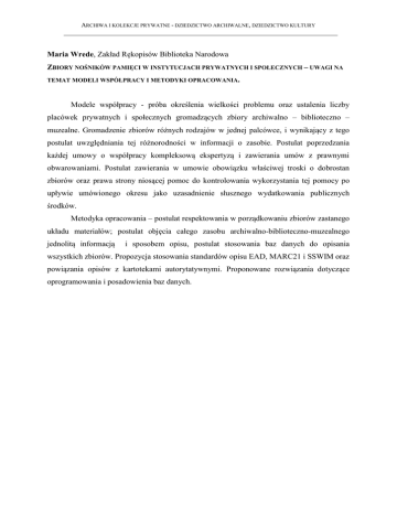 ARCHIWA I KOLEKCJE PRYWATNE - DZIEDZICTWO ARCHIWALNE, DZIEDZICTWO KULTURY Maria Wrede, Zakład Rękopisów Biblioteka Narodowa ZBIORY NOŚNIKÓW PAMIĘCI W INSTYTUCJACH PRYWATNYCH I SPOŁECZNYCH – UWAGI NA TEMAT MODELI WSPÓŁPRACY I METODYKI OPRACOWANIA. Modele współpracy - próba określenia wielkości problemu oraz ustalenia liczby placówek prywatnych i społecznych gromadzących zbiory archiwalno – biblioteczno – muzealne. Gromadzenie zbiorów różnych rodzajów w jednej palcówce, i wynikający z tego postulat uwzględniania tej różnorodności w informacji o zasobie. Postulat poprzedzania każdej umowy o współpracy kompleksową ekspertyzą i zawierania umów z prawnymi obwarowaniami. Postulat zawierania w umowie obowiązku właściwej troski o dobrostan zbiorów oraz prawa strony niosącej pomoc do kontrolowania wykorzystania tej pomocy po upływie umówionego okresu jako uzasadnienie słusznego wydatkowania publicznych środków. Metodyka opracowania – postulat respektowania w porządkowaniu zbiorów zastanego układu materiałów; postulat objęcia całego zasobu archiwalno-biblioteczno-muzealnego jednolitą informacją i sposobem opisu, postulat stosowania baz danych do opisania wszystkich zbiorów. Propozycja stosowania standardów opisu EAD, MARC21 i SSWIM oraz powiązania opisów z kartotekami autorytatywnymi. Proponowane rozwiązania dotyczące oprogramowania i posadowienia baz danych.