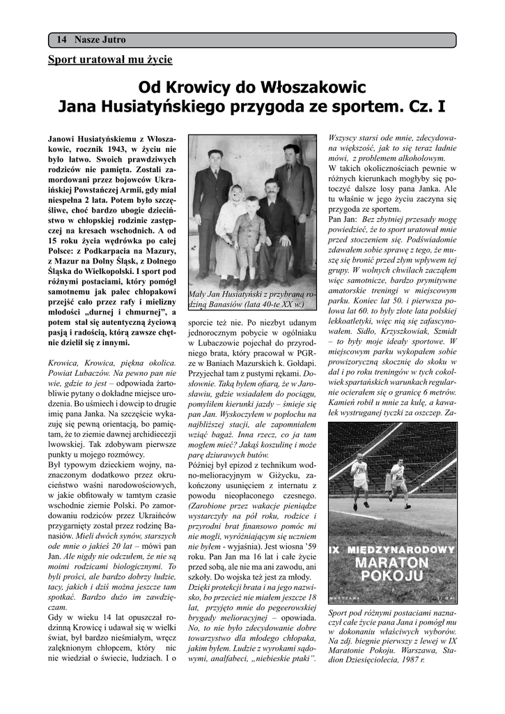 14 NaszeJutro Jutro 14 Nasze ZDROWIE I URODA Sport uratował mu życie Od Krowicy do Włoszakowic Jana Husiatyńskiego przygoda ze sportem. Cz. I Janowi Husiatyńskiemu z Włoszakowic, rocznik 1943, w życiu nie było łatwo. Swoich prawdziwych rodziców nie pamięta. Zostali zamordowani przez bojowców Ukraińskiej Powstańczej Armii, gdy miał niespełna 2 lata. Potem było szczęśliwe, choć bardzo ubogie dzieciństwo w chłopskiej rodzinie zastępczej na kresach wschodnich. A od 15 roku życia wędrówka po całej Polsce: z Podkarpacia na Mazury, z Mazur na Dolny Śląsk, z Dolnego Śląska do Wielkopolski. I sport pod różnymi postaciami, który pomógł samotnemu jak palec chłopakowi przejść cało przez rafy i mielizny młodości „durnej i chmurnej”, a potem stał się autentyczną życiową pasją i radością, którą zawsze chętnie dzielił się z innymi. Krowica, Krowica, piękna okolica. Powiat Lubaczów. Na pewno pan nie wie, gdzie to jest – odpowiada żartobliwie pytany o dokładne miejsce urodzenia. Bo uśmiech i dowcip to drugie imię pana Janka. Na szczęście wykazuję się pewną orientacją, bo pamiętam, że to ziemie dawnej archidiecezji lwowskiej. Tak zdobywam pierwsze punkty u mojego rozmówcy. Był typowym dzieckiem wojny, naznaczonym dodatkowo przez okrucieństwo waśni narodowościowych, w jakie obfitowały w tamtym czasie wschodnie ziemie Polski. Po zamordowaniu rodziców przez Ukraińców przygarnięty został przez rodzinę Banasiów. Mieli dwóch synów, starszych ode mnie o jakieś 20 lat – mówi pan Jan. Ale nigdy nie odczułem, że nie są moimi rodzicami biologicznymi. To byli prości, ale bardzo dobrzy ludzie, tacy, jakich i dziś można jeszcze tam spotkać. Bardzo dużo im zawdzięczam. Gdy w wieku 14 lat opuszczał rodzinną Krowicę i udawał się w wielki świat, był bardzo nieśmiałym, wręcz zalęknionym chłopcem, który nic nie wiedział o świecie, ludziach. I o Mały Jan Husiatyński z przybraną rodziną Banasiów (lata 40-te XX w.) sporcie też nie. Po niezbyt udanym jednorocznym pobycie w ogólniaku w Lubaczowie pojechał do przyrodniego brata, który pracował w PGRze w Baniach Mazurskich k. Gołdapi. Przyjechał tam z pustymi rękami. Dosłownie. Taką byłem ofiarą, że w Jarosławiu, gdzie wsiadałem do pociągu, pomyliłem kierunki jazdy – śmieje się pan Jan. Wyskoczyłem w popłochu na najbliższej stacji, ale zapomniałem wziąć bagaż. Inna rzecz, co ja tam mogłem mieć? Jakąś koszulinę i może parę dziurawych butów. Później był epizod z technikum wodno-melioracyjnym w Giżycku, zakończony usunięciem z internatu z powodu nieopłaconego czesnego. (Zarobione przez wakacje pieniądze wystarczyły na pół roku, rodzice i przyrodni brat finansowo pomóc mi nie mogli, wyróżniającym się uczniem nie byłem - wyjaśnia). Jest wiosna ’59 roku. Pan Jan ma 16 lat i całe życie przed sobą, ale nie ma ani zawodu, ani szkoły. Do wojska też jest za młody. Dzięki protekcji brata i na jego nazwisko, bo przecież nie miałem jeszcze 18 lat, przyjęto mnie do pegeerowskiej brygady melioracyjnej – opowiada. No, to nie było zdecydowanie dobre towarzystwo dla młodego chłopaka, jakim byłem. Ludzie z wyrokami sądowymi, analfabeci, „niebieskie ptaki”. Wszyscy starsi ode mnie, zdecydowana większość, jak to się teraz ładnie mówi, z problemem alkoholowym. W takich okolicznościach pewnie w różnych kierunkach mogłyby się potoczyć dalsze losy pana Janka. Ale tu właśnie w jego życiu zaczyna się przygoda ze sportem. Pan Jan: Bez zbytniej przesady mogę powiedzieć, że to sport uratował mnie przed stoczeniem się. Podświadomie zdawałem sobie sprawę z tego, że muszę się bronić przed złym wpływem tej grupy. W wolnych chwilach zacząłem więc samotnicze, bardzo prymitywne amatorskie treningi w miejscowym parku. Koniec lat 50. i pierwsza połowa lat 60. to były złote lata polskiej lekkoatletyki, więc nią się zafascynowałem. Sidło, Krzyszkowiak, Szmidt – to były moje ideały sportowe. W miejscowym parku wykopałem sobie prowizoryczną skocznię do skoku w dal i po roku treningów w tych cokolwiek spartańskich warunkach regularnie ocierałem się o granicę 6 metrów. Kamień robił u mnie za kulę, a kawałek wystruganej tyczki za oszczep. Za- Sport pod różnymi postaciami naznaczył całe życie pana Jana i pomógł mu w dokonaniu właściwych wyborów. Na zdj. biegnie pierwszy z lewej w IX Maratonie Pokoju. Warszawa, Stadion Dziesięciolecia, 1987 r.