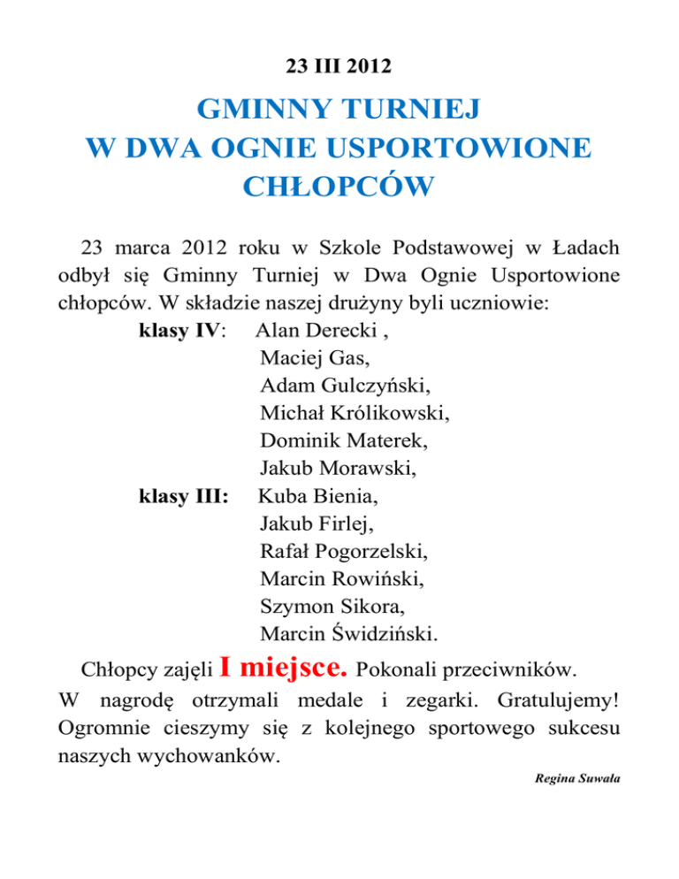 23 III 2012 GMINNY TURNIEJ W DWA OGNIE USPORTOWIONE CHŁOPCÓW 23 marca 2012 roku w Szkole Podstawowej w Ładach odbył się Gminny Turniej w Dwa Ognie Usportowione chłopców. W składzie naszej drużyny byli uczniowie: klasy IV: Alan Derecki , Maciej Gas, Adam Gulczyński, Michał Królikowski, Dominik Materek, Jakub Morawski, klasy III: Kuba Bienia, Jakub Firlej, Rafał Pogorzelski, Marcin Rowiński, Szymon Sikora, Marcin Świdziński. Chłopcy zajęli I miejsce. Pokonali przeciwników. W nagrodę otrzymali medale i zegarki. Gratulujemy! Ogromnie cieszymy się z kolejnego sportowego sukcesu naszych wychowanków. Regina Suwała