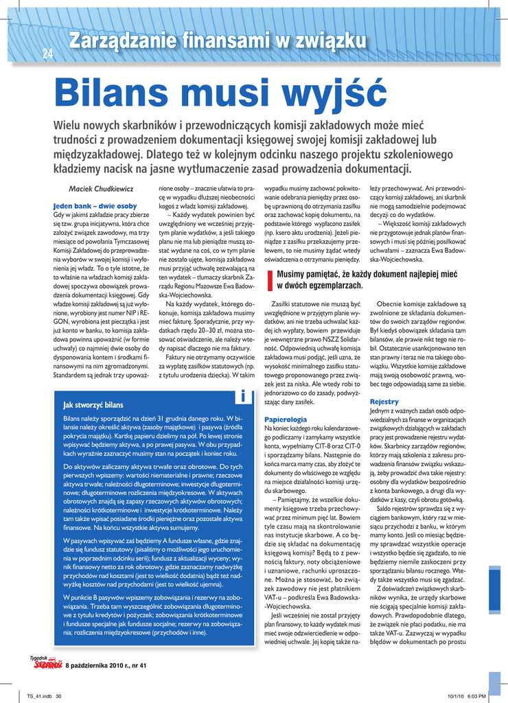 Zarządzanie finansami w związku 24 Bilans musi wyjść Wielu nowych skarbników i przewodniczących komisji zakładowych może mieć trudności z prowadzeniem dokumentacji księgowej swojej komisji zakładowej lub międzyzakładowej. Dlatego też w kolejnym odcinku naszego projektu szkoleniowego kładziemy nacisk na jasne wytłumaczenie zasad prowadzenia dokumentacji. Maciek Chudkiewicz Jeden bank – dwie osoby Gdy w jakimś zakładzie pracy zbierze się tzw. grupa inicjatywna, która chce założyć związek zawodowy, ma trzy miesiące od powołania Tymczasowej Komisji Zakładowej do przeprowadzenia wyborów w swojej komisji i wyłonienia jej władz. To o tyle istotne, że to właśnie na władzach komisji zakładowej spoczywa obowiązek prowadzenia dokumentacji księgowej. Gdy władze komisji zakładowej są już wyłonione, wyrobiony jest numer NIP i REGON, wyrobiona jest pieczątka i jest już konto w banku, to komisja zakładowa powinna upoważnić (w formie uchwały) co najmniej dwie osoby do dysponowania kontem i środkami finansowymi na nim zgromadzonymi. Standardem są jednak trzy upoważ- Jak stworzyć bilans nione osoby – znacznie ułatwia to pracę w wypadku dłuższej nieobecności kogoś z władz komisji zakładowej. – Każdy wydatek powinien być uwzględniony we wcześniej przyjętym planie wydatków, a jeśli takiego planu nie ma lub pieniądze muszą zostać wydane na coś, co w tym planie nie zostało ujęte, komisja zakładowa musi przyjąć uchwałę zezwalającą na ten wydatek – tłumaczy skarbnik Zarządu Regionu Mazowsze Ewa Badowska-Wojciechowska. Na każdy wydatek, którego dokonuje, komisja zakładowa musimy mieć fakturę. Sporadycznie, przy wydatkach rzędu 20–30 zł, można stosować oświadczenie, ale należy wtedy napisać dlaczego nie ma faktury. Faktury nie otrzymamy oczywiście za wypłatę zasiłków statutowych (np. z tytułu urodzenia dziecka). W takim i Bilans należy sporządzić na dzień 31 grudnia danego roku. W bilansie należy określić aktywa (zasoby majątkowe) i pasywa (źródła pokrycia majątku). Kartkę papieru dzielimy na pół. Po lewej stronie wpisywać będziemy aktywa, a po prawej pasywa. W obu przypadkach wyraźnie zaznaczyć musimy stan na początek i koniec roku. Do aktywów zaliczamy aktywa trwałe oraz obrotowe. Do tych pierwszych wpiszemy: wartości niematerialne i prawne; rzeczowe aktywa trwałe; należności długoterminowe; inwestycje długoterminowe; długoterminowe rozliczenia międzyokresowe. W aktywach obrotowych znajdą się zapasy rzeczowych aktywów obrotowych; należności krótkoterminowe i inwestycje krótkoterminowe. Należy tam także wpisać posiadane środki pieniężne oraz pozostałe aktywa finansowe. Na końcu wszystkie aktywa sumujemy. W pasywach wpisywać zaś będziemy A fundusze własne, gdzie znajdzie się fundusz statutowy (pisaliśmy o możliwości jego uruchomienia w poprzednim odcinku serii); fundusz z aktualizacji wyceny; wynik finansowy netto za rok obrotowy, gdzie zaznaczamy nadwyżkę przychodów nad kosztami (jest to wielkość dodatnia) bądź też nadwyżkę kosztów nad przychodami (jest to wielkość ujemna). W punkcie B pasywów wpiszemy zobowiązania i rezerwy na zobowiązania. Trzeba tam wyszczególnić zobowiązania długoterminowe z tytułu kredytów i pożyczek; zobowiązania krótkoterminowe i fundusze specjalne jak fundusze socjalne; rezerwy na zobowiązania; rozliczenia międzyokresowe (przychodów i inne). wypadku musimy zachować pokwitowanie odebrania pieniędzy przez osobę uprawnioną do otrzymania zasiłku oraz zachować kopię dokumentu, na podstawie którego wypłacono zasiłek (np. ksero aktu urodzenia). Jeżeli pieniądze z zasiłku przekazujemy przelewem, to nie musimy żądać wtedy oświadczenia o otrzymaniu pieniędzy. leży przechowywać. Ani przewodniczący komisji zakładowej, ani skarbnik nie mogą samodzielnie podejmować decyzji co do wydatków. – Większość komisji zakładowych nie przygotowuje jednak planów finansowych i musi się później posiłkować uchwałami – zaznacza Ewa Badowska-Wojciechowska. Musimy pamiętać, że każdy dokument najlepiej mieć w dwóch egzemplarzach. Zasiłki statutowe nie muszą być uwzględnione w przyjętym planie wydatków, ani nie trzeba uchwalać każdej ich wypłaty, bowiem przewiduje je wewnętrzne prawo NSZZ Solidarność. Odpowiednią uchwałę komisja zakładowa musi podjąć, jeśli uzna, że wysokość minimalnego zasiłku statutowego proponowanego przez związek jest za niska. Ale wtedy robi to jednorazowo co do zasady, podwyższając dany zasiłek. Papierologia Na koniec każdego roku kalendarzowego podliczamy i zamykamy wszystkie konta, wypełniamy CIT-8 oraz CIT-0 i sporządzamy bilans. Następnie do końca marca mamy czas, aby złożyć te dokumenty do właściwego ze względu na miejsce działalności komisji urzędu skarbowego. – Pamiętajmy, że wszelkie dokumenty księgowe trzeba przechowywać przez minimum pięć lat. Bowiem tyle czasu mają na skontrolowanie nas instytucje skarbowe. A co będzie się składać na dokumentację księgową komisji? Będą to z pewnością faktury, noty obciążeniowe i uznaniowe, rachunki uproszczone. Można je stosować, bo związek zawodowy nie jest płatnikiem VAT-u – podkreśla Ewa Badowska-Wojciechowska. Jeśli wcześniej nie został przyjęty plan finansowy, to każdy wydatek musi mieć swoje odzwierciedlenie w odpowiedniej uchwale. Jej kopię także na- Obecnie komisje zakładowe są zwolnione ze składania dokumentów do swoich zarządów regionów. Był kiedyś obowiązek składania tam bilansów, ale prawie nikt tego nie robił. Ostatecznie usankcjonowano ten stan prawny i teraz nie ma takiego obowiązku. Wszystkie komisje zakładowe mają swoją osobowość prawną, wobec tego odpowiadają same za siebie. Rejestry Jednym z ważnych zadań osób odpowiedzialnych za finanse w organizacjach związkowych działających w zakładach pracy jest