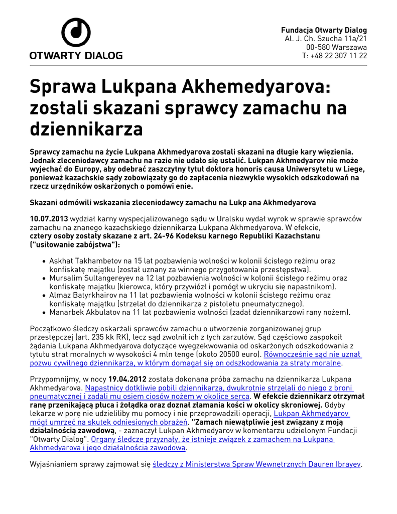 zamachu na znanego kazachskiego dziennikarza Lukpana Akhmedyarova. W efekcie,