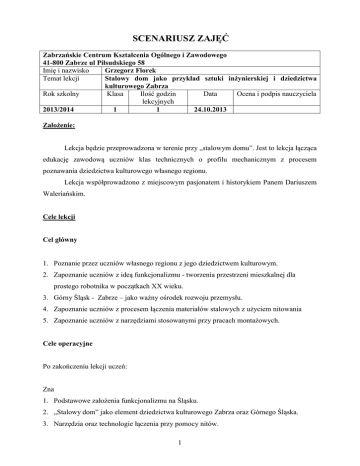 SCENARIUSZ ZAJĘĆ Zabrzańskie Centrum Kształcenia Ogólnego i Zawodowego 41-800 Zabrze ul Piłsudskiego 58 Imię i nazwisko Grzegorz Florek Temat lekcji Stalowy dom jako przykład sztuki inżynierskiej i dziedzictwa kulturowego Zabrza Rok szkolny Klasa Ilość godzin Data Ocena i podpis nauczyciela lekcyjnych 2013/2014 1 1 24.10.2013 Założenie: Lekcja będzie przeprowadzona w terenie przy „stalowym domu”. Jest to lekcja łącząca edukację zawodową uczniów klas technicznych o profilu mechanicznym z procesem poznawania dziedzictwa kulturowego własnego regionu. Lekcja współprowadzono z miejscowym pasjonatem i historykiem Panem Dariuszem Waleriańskim. Cele lekcji Cel główny 1. Poznanie przez uczniów własnego regionu z jego dziedzictwem kulturowym. 2. Zapoznanie uczniów z ideą funkcjonalizmu - tworzenia przestrzeni mieszkalnej dla prostego robotnika w początkach XX wieku. 3. Górny Śląsk - Zabrze – jako ważny ośrodek rozwoju przemysłu. 4. Zapoznanie uczniów z procesem łączenia materiałów stalowych z użyciem nitowania 5. Zapoznanie uczniów z narzędziami stosowanymi przy pracach montażowych. Cele operacyjne Po zakończeniu lekcji uczeń: Zna 1. Podstawowe założenia funkcjonalizmu na Śląsku. 2. „Stalowy dom” jako element dziedzictwa kulturowego Zabrza oraz Górnego Śląska. 3. Narzędzia oraz technologie łączenia przy pomocy nitów. 1 Umie 1. Omówić skrócie proces łączenia stali przy pomocy nitów. 2. Ocenić stan powierzchni elementów stalowych. 3. Rozróżnić sprzęt i narzędzia do procesu nitowania. 4. Scharakteryzować „stalowy dom” oraz jego znaczenie dla regionu i miasta. Metody kształcenia 1. Wycieczka do „stalowego domu”. 2. Prezentacja historyczna Pana Dariusza Waleriańskiego. 3. Prezentacja metody łączenia z użyciem nitów. 4. Praktyczne zapoznanie z elementami nitowanymi występującymi w konstrukcji domu. 5. Praktyczne zapoznanie ze procesem zużycia elementów stalowych. 6. Pogadanka na temat dziedzictwa kulturowego Zabrza oraz regionu Środki dydaktyczne: 1. Prezentacja Pana Dariusza Waleriańskiego omawiająca historię „stalowego domu” 2. Pogadanka Historyk – nauczyciel - uczniowie. 3. Stalowy dom. 4. Nitownice ręczne, nity. 5. Zeszyt przedmiotowy, długopis. 6. Aparaty fotograficzne 2 Ogniwa lekcji Lekcja 1 I. Część organizacyjna Przywitanie uczniów, sprawdzenie obecności, przedstawienie gościa. II. Część wstępna 1. Wprowadzenie do tematu. 2. Podanie tematu lekcji: Stalowy dom jako przykład sztuki inżynierskiej i dziedzictwa kulturowego Zabrza III. Część zasadnicza Cześć zasadnicza stanowi podstawę merytoryczną oraz zawiera materiały dydaktyczne dla uczniów. 1. Prezentacja historyczna Pana Dariusza Waleriańskiego. Założenia historyczne: Stalowy dom jest dziedzictwem kulturowym i przemysłowym Górnego Śląska. Choć w Zabrzu jest ich kilka to jeden wybitnie ukazuje swoje „metalowe” oblicze, to dom przy dawnej ul. Friedhofstrasse, czyli dzisiejszej Cmentarnej. Powstał on w roku 1927 i jest prawdopodobnie najstarszym takim obiektem w Europie. Powstał on jako eksperyment architektoniczny i technologiczny. Sama idea budowy metalowych obiektów zrodziła się w pierwszej połowie XIX wieku w wyobraźni Jamesa Bogardus’a, który chciał stworzyć łatwą do skonstruowania przestrzeń mieszkalną przeznaczoną dla prostego robotnika, natomiast w Europie przejęcie i wdrożenie pomysłu amerykańskiego architekta było efektem rozwoju nowej formy architektonicznej funkcjonalizmu, który na Śląsku zawitał w latach dwudziestych XX wieku. Sukces budowlany zachęcił koncern hutniczy Oberhutten z Gliwic (do którego w tym czasie należała Huta Donnersmarck z Zabrza), do umieszczenia w swoim firmowym katalogu 11 wariantów stalowych domów, jednak w praktyce okazały się one mało komfortowe w eksploatacji. Stalowy dom - w 90 % wykonany jest ze stali - to 8 metalowych ścian połączonych za pomocą spawów i wykończonych za pomocą tynków, czterospadowego dachu i ocieplenia wnętrza ceglanymi ścianami. Zakończenie prac przypadło na 12 sierpnia 1927 roku. 3 Dom powstał bardzo szybko, bo zaledwie w ciągu zaledwie 26 dni nakładem pracy 16 robotników. Dom – jest zbudowany z ośmiu metalowych ścian odlanych w Hucie Donnesmarck posiada piwnicę i składa się z dwóch kondygnacji, na których znajdują się po dwa mieszkania o metrażu do 50 m. kw. W każdym mieszkaniu są dwa pokoje, liczące kolejno 22,35 m. kw. i 11,35 m. kw. oraz 15-metrowa kuchnia. W gotowym budynku mogły zamieszkać cztery rodziny. Początkowo ubikacje były wspólne i znajdowały się przy wejściu do klatki schodowej. W późniejszym okresie, lokatorzy wydzielili toalety z kuchni, a w tym miejscu wygospodarowali komórki. Dom, dawniej w świetnej kondycji, dziś faktycznie przedstawia obraz zużytej puszki po konserwie, niszczeje, a jest jednym z ciekawszych elementów Zabrza warta zobaczenia. 4 5 2. Omówienie stalowej konstrukcji domu wykonanego z użyciem technologii nitowania. Przypomnienie wiadomości na temat połączeń nitowych. Nit – jest metalowym elementem konstrukcyjnym używanym przy nitowaniu, czyli łączeniu ze sobą różnych elementów konstrukcyjnych, najczęściej płaskich m.in.. fragmentów blach, tworzyw sztucznych, materiałów niemetalowych. Nity są elementami pracującymi zwykle na ścinanie. Połączenie nitowe – to nierozłączne połączenia elementów zwykle przy pomocy nitów w postaci trzpienia walcowego z łbami. Proces nitowania przez długi czas był najważniejszą metodą łączenia metalowych elementów konstrukcyjnych. Obecnie, z uwagi na prostszą technologię wykonywania połączenia nitowe zostały wyparte przez połączenia spawane i zgrzewane. Nitowanie stosuje się do łączenia blach, kształtowników, dźwigarów, wsporników, wiązarów a także do nierozłącznych połączeń różnego typu części maszyn. Przy nitowaniu na zakładkę arkus