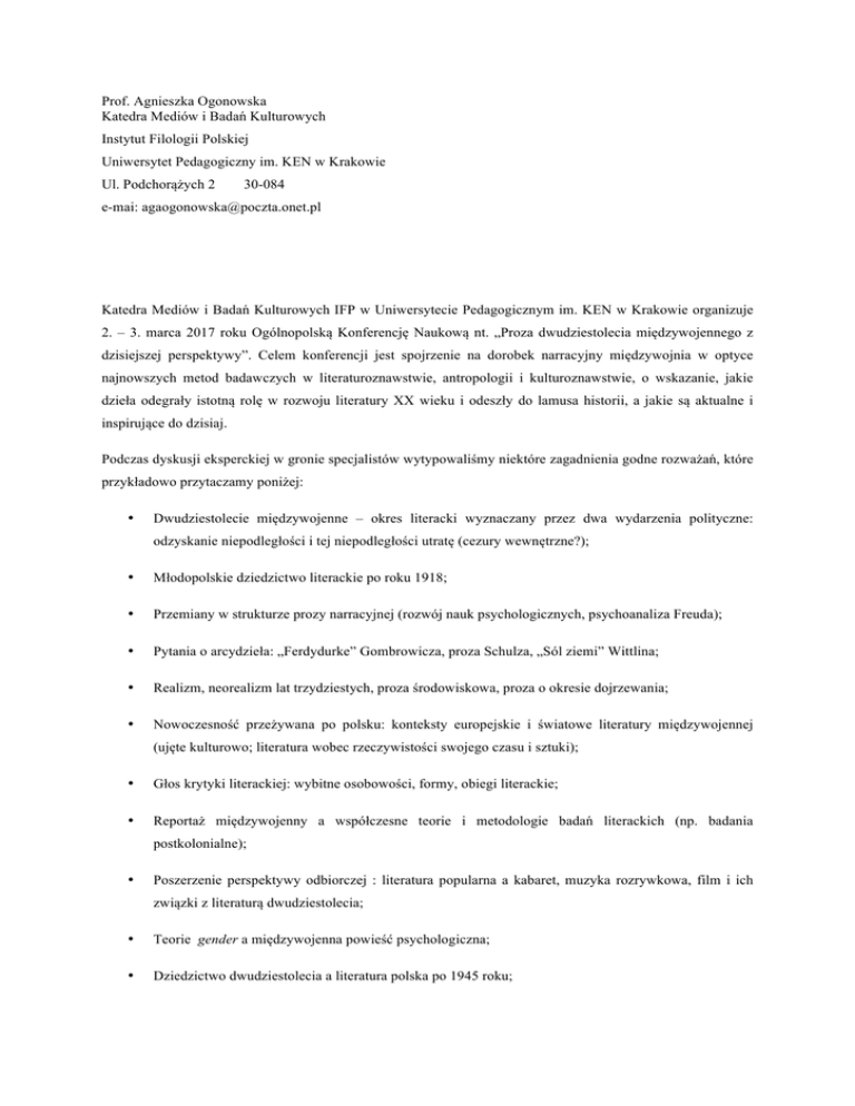 Prof. Agnieszka Ogonowska Katedra Mediów i Badań Kulturowych Instytut Filologii Polskiej Uniwersytet Pedagogiczny im. KEN w Krakowie Ul. Podchorążych 2 30-084 e-mai: [email protected] Katedra Mediów i Badań Kulturowych IFP w Uniwersytecie Pedagogicznym im. KEN w Krakowie organizuje 2. – 3. marca 2017 roku Ogólnopolską Konferencję Naukową nt. „Proza dwudziestolecia międzywojennego z dzisiejszej perspektywy”. Celem konferencji jest spojrzenie na dorobek narracyjny międzywojnia w optyce najnowszych metod badawczych w literaturoznawstwie, antropologii i kulturoznawstwie, o wskazanie, jakie dzieła odegrały istotną rolę w rozwoju literatury XX wieku i odeszły do lamusa historii, a jakie są aktualne i inspirujące do dzisiaj. Podczas dyskusji eksperckiej w gronie specjalistów wytypowaliśmy niektóre zagadnienia godne rozważań, które przykładowo przytaczamy poniżej: • Dwudziestolecie międzywojenne – okres literacki wyznaczany przez dwa wydarzenia polityczne: odzyskanie niepodległości i tej niepodległości utratę (cezury wewnętrzne?); • Młodopolskie dziedzictwo literackie po roku 1918; • Przemiany w strukturze prozy narracyjnej (rozwój nauk psychologicznych, psychoanaliza Freuda); • Pytania o arcydzieła: „Ferdydurke” Gombrowicza, proza Schulza, „Sól ziemi” Wittlina; • Realizm, neorealizm lat trzydziestych, proza środowiskowa, proza o okresie dojrzewania; • Nowoczesność przeżywana po polsku: konteksty europejskie i światowe literatury międzywojennej (ujęte kulturowo; literatura wobec rzeczywistości swojego czasu i sztuki); • Głos krytyki literackiej: wybitne osobowości, formy, obiegi literackie; • Reportaż międzywojenny a współczesne teorie i metodologie badań literackich (np. badania postkolonialne); • Poszerzenie perspektywy odbiorczej : literatura popularna a kabaret, muzyka rozrywkowa, film i ich związki z literaturą dwudziestolecia; • Teorie gender a międzywojenna powieść psychologiczna; • Dziedzictwo dwudziestolecia a literatura polska po 1945 roku; • Syntezy dwudziestolecia; • Międzywojnie w Sieci; • Wydawnictwa współczesne wobec literatury dwudziestolecia; To tylko niektóre, przykładowo podane tutaj tematy. Jesteśmy oczywiście zainteresowani każdą inną propozycją badawczą (związaną z tematyką konferencji). Liczymy na udział w tej konferencji literaturoznawców i kulturoznawców oraz antropologów i socjologów literatury zainteresowanych prozą dwudziestolecia międzywojennego. Zgłoszenia wraz z podaniem tytułu referatu i krótkim abstraktem należy przesyłać do 15 lipca 2016 roku na adres mailowy: [email protected] z dopiskiem „Dwudziestolecie” – w tytule wiadomości. Opłata konferencyjna wynosi 360 zł; należy ją uiścić do 15 grudnia 2016 roku na konto uczelni: 71 1240 4722 1111 0000 4852 4687 (po otrzymaniu od organizatorów informacji zwrotnej o zaakceptowaniu referatu do wygłoszenia).Planujemy wydanie książki pokonferencyjnej. Strona konferencji będzie dostępna pod adresem: http://badania-media.up.krakow.pl/index.php/pl/ (w zakładce; Dwudziestolecie Międzywojenne). Serdecznie zapraszamy! W imieniu Komitetu Organizacyjnego Prof. dr hab. Agnieszka Ogonowska