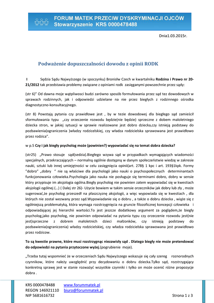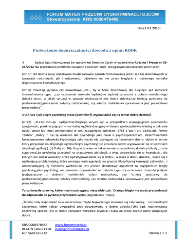 Dnia1.03.2015r. Podważenie dopuszczalności dowodu z opinii RODK I Sędzia Sądu Najwyższego (w spoczynku) Bronisłw Czech w kwartalniku Rodzina i Prawo nr 2021/2012 tak przedstawia problemy związane z opiniami rodk zasięganymi powszechnie przez sądy: (str 6)” Od dawna moje wątpliwosci budzi zarówno sposób formułowania przez sąd tez dowodowych w sprawach rodzinnych, jak i odpowiedzi udzielane na nie przez biegłych z rodzinnego ośrodka diagnostyczno-konsultacyjnego. (str 8) Powstają pytania czy prawidłowe jest , by w tezie dowodowej dla biegłego sąd zamieścił sformułowania typu „czy orzeczenie rozwodu będzie(nie będzie) sprzeczne z dobem maloletniego dziecka stron, w jakiej sytuacji w sprawie realizowane jest dobro dziecka,czy istnieją podstawy do pozbawienia(ograniczenia )władzy rodzicelskiej, czy władza rodzicielska sprawowana jest prawidłowo przez rodzica”. w p.5 Czy i jak biegły psycholog może (powinien?) wypowiadać się na temat dobra dziecka? (str25) „Prawo stosuje sąd(sedzia).Biegłego wzywa sąd w przypadkach wymagających wiadomości specjalnych, przekraczających – normalną ogólnie dostępną w danym społeczeństwie wiedzę w zakresie nauki, sztuki lub innej umiejętności w celu zasięgnięcia opinii(art. 278§ 1 kpc i art. 193§1kpk. Formy ”dobro” „dobry ” nie są właściwe dla psychologii jako nauki o psychospołecznych determinantach funkcjonowania człowieka.Psychologia jako nauka nie posługuje się terminami dobro, dobry w sensie który przypisuje im aksjologia ogólna.Biegły psycholog nie powinien zatem wypowiadać się w kwestiach aksjologii ogólnej (…) ( Dalej str 26)- Użycie bowiem w takim sensie orzeczników jak dobry lub zły , może sugerować,że psycholog przeszedł na płaszczyznę aksjologii, a więc wypowiada się w kwestiach , dla których nie zostal wezwany przez sąd.Wypowiadanie się o dobru , a także o dobru dziecka , wiąże się z ogólniejszą problematyką, która wymaga rozstrzygnięcia na gruncie filozoficznej koncepcji człowieka i odpowiadającej jej hierarchii wartości.To jest jeszcze dodatkowy argument za poglądem,że biegły psycholog,jako psycholog, nie powinien odpowiadać na pytania typu czy orzeczenie rozwodu jest(nie jest)sprzeczne z dobrem małoletnich dzieci małżonków, czy istnieją podstawy do pozbawienia(ograniczenia) władzy rodzicielskiej, czy władza rodzicielska sprawowana jest prawidłowo przez rodzicow. To są kwestie prawne, które musi rozstrzygnąc niezawisły sąd . Dlatego biegły nie może pretendować do odpowiedzi na pytania przytoczone wyżej.(pogrubienie moje). „Trzeba tutaj wspomnieć że w orzeczeniach Sądu Najwyższego wskazuje się cały szereg roznorodnych czynnikow, które należy uwzględnić przy decydowaniu o dobru dziecka.Tylko sąd, rozstrzygający konkretną sprawę jest w stanie rozważyć wszystkie czynniki i tylko on może ocenić różne propozycje dobra . KRS 0000478488 REGON 146921110 NIP 5681616732 www.forummatek.pl [email protected] Strona 1 z 3 str 28(6.1) Pytania sądu kierowane do biegłego psychologa typu: czy orzeczenie rozwodu będzie(nie będzie) sprzeczne z dobrem dziecka, czy istnieją podstawy do pozbawienia (ograniczenia) władzy rodzicielskiej, czy władza rodzicielska sprawowana jest prawidłowo przez rodzica- są niedopuszczalne.(podkr.moje) To niezawisły sąd rozstrzyga samodzielnie te kwestie , jako kwestie prawne, biorac pod uwagę wszystkie zebrane w sprawie dowody( podkr. moje) Biegły psycholog nie jest kompetentny, by odpowiadać na tego rodzaju pytania, jeśli zaś odpowiada, to przekracza swoje kompetencje(podkr. moje) Niech sędzia nie zadaje biegłemu psychologowi niestosownych pytań, a biegły niech nie bawi się w sędziego, każdy z nich niech pełni rolę przypisaną mu przez prawo. Stosowanie przez sędziego przytoczonych pytań i odpowiadanie na nie przez biegłego psychologa, zasygnalizowany sposób rozstrzygania spraw rozwodowych przez niektórych sędziów,posługiwanie się w orzecznictwie”prywatnymi” poglądami sprzecznymi z powszechnie przyjmowanymi zapatrywaniami , może budzić wątpliwości co do kwalifikacji tych osób oraz poczucia zdrowego rozsądku.” ******* II Art. 193 Konstytucji brzmi: Każdy sąd może przedstawić Trybunałowi Konstytucyjnemu pytanie prawne co do zgodności aktu normatywnego z Konstytucją. Nadal na podstawie rozporządzenia Ministra Sprawiedliwosci sąd kieruje uczestników na badania w rodk, traktując wnioski z tych opinii i opinie jako wytyczne dla sądu. ProkuratorGeneralny skierował wniosek do Trybunalu Konstytucyjnego , który na stronie TK zarejestrowny jest pod nr U6/13 ******** III. Z opinii zleconej przez Biuro Analiz Sejmowych do druku sejmowego nr 3058 dot umocowania rodk w strukturach sądowych. dr Jerzy Słyk –Katedra Prawa Rodzinnego i Prawa Nieletnich UKSW oraz IWS zawarł następujące zastrzeżenia: Kodeks postępowania cywilnego nie zawiera unormowania odnoszącego się bezpośrednio do dowodu z opinii RODK. Art.282 kpc wymaga złożenia przez biegłego przyrzeczenia przed wszczęciem przez niego czynności. Od rodk sądy tego nie wymagają , bo nie jest to biegły w rozumieniu regulacji prawnych.Sądy nie określaja konkretnych osób sporzadzających opinię. Obowiązujące przepisy nie wymagają aby pracownicy ośrodka wpisani byli na listę biegłych sądowych.Dowód z opinii osrodka nie podlega unormowaniu art. 290 kpc(opinia instytutu naukowego) Watpliwości dotyczące charakteru i możliwości wykorzystania opinii rodk wzmacnia teza zawarta w wyroku SN z 22 lutego 2008r VCSK432/07 o brzmieniu:”ustalenia wymagające wiadomości specjalnych, aby mogły stać się skladnikiem materiału dowodowego poddawanego ocenie,muszą przybrać formę określoną w art. 278 kpc i nast. to znaczy postać opinii biegłego(biegłych)lub odpowiedniego instytutu” „Dowód z opinii biegłego nie ma uprzywilejowanej pozycji z punktu widzenia oceny jego