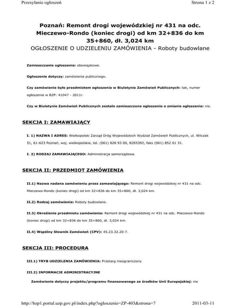 Przesyłanie ogłoszeń Strona 1 z 2 Poznań: Remont drogi wojewódzkiej nr 431 na odc. Mieczewo-Rondo (koniec drogi) od km 32+836 do km 35+860, dł. 3,024 km OGŁOSZENIE O UDZIELENIU ZAMÓWIENIA - Roboty budowlane Zamieszczanie ogłoszenia: obowiązkowe. Ogłoszenie dotyczy: zamówienia publicznego. Czy zamówienie było przedmiotem ogłoszenia w Biuletynie Zamówień Publicznych: tak, numer ogłoszenia w BZP: 41047 - 2011r. Czy w Biuletynie Zamówień Publicznych zostało zamieszczone ogłoszenie o zmianie ogłoszenia: nie. SEKCJA I: ZAMAWIAJĄCY I. 1) NAZWA I ADRES: Wielkopolski Zarząd Dróg Wojewódzkich Wydział Zamówień Publicznych, ul. Wilczak 51, 61-623 Poznań, woj. wielkopolskie, tel. (061) 828 93 00, 8265392, faks (061) 852 01 31. I. 2) RODZAJ ZAMAWIAJĄCEGO: Administracja samorządowa. SEKCJA II: PRZEDMIOT ZAMÓWIENIA II.1) Nazwa nadana zamówieniu przez zamawiającego: Remont drogi wojewódzkiej nr 431 na odc. Mieczewo-Rondo (koniec drogi) od km 32+836 do km 35+860, dł. 3,024 km. II.2) Rodzaj zamówienia: Roboty budowlane. II.3) Określenie przedmiotu zamówienia: Remont drogi wojewódzkiej nr 431 na odc. Mieczewo-Rondo (koniec drogi) od km 32+836 do km 35+860, dł. 3,024 km. II.4) Wspólny Słownik Zamówień (CPV): 45.23.32.20-7. SEKCJA III: PROCEDURA III.1) TRYB UDZIELENIA ZAMÓWIENIA: Przetarg nieograniczony III.2) INFORMACJE ADMINISTRACYJNE Zamówienie dotyczy projektu/programu finansowanego ze środków Unii Europejskiej: nie http://bzp1.portal.uzp.gov.pl/index.php?ogloszenie=ZP-403&strona=7 2011-03-11 Przesyłanie ogłoszeń Strona 2 z 2 SEKCJA IV: UDZIELENIE ZAMÓWIENIA IV.1) DATA UDZIELENIA ZAMÓWIENIA: 11.03.2011. IV.2) LICZBA OTRZYMANYCH OFERT: 6. IV.3) LICZBA ODRZUCONYCH OFERT: 0. IV.4) NAZWA I ADRES WYKONAWCY, KTÓREMU UDZIELONO ZAMÓWIENIA: Przedsiębiorstwo Drogowo-Mostowe DROMOST Sp. z o.o., śabno 2A, 63-112 Brodnica, kraj/woj. wielkopolskie. IV.5) Szacunkowa wartość zamówienia (bez VAT): 1089428,31 PLN. IV.6) INFORMACJA O CENIE WYBRANEJ OFERTY ORAZ O OFERTACH Z NAJNIśSZĄ I NAJWYśSZĄ CENĄ Cena wybranej oferty: 1081505,35 Oferta z najniŜszą ceną: 1081505,35 / Oferta z najwyŜszą ceną: 1299987,89 Waluta: PLN. http://bzp1.portal.uzp.gov.pl/index.php?ogloszenie=ZP-403&strona=7 2011-03-11