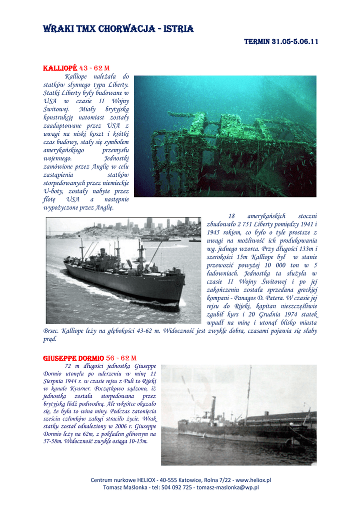 WRAKI TMX CHORWACJA - ISTRIA TeRMIn 31.05-5.06.11 KALLIOPÉ 43 - 62 m Kalliope należała do statków słynnego typu Liberty. Statki Liberty były budowane w USA w czasie II Wojny Świtowej. Miały brytyjską konstrukcję natomiast zostały zaadaptowane przez USA z uwagi na niski koszt i krótki czas budowy, stały się symbolem amerykańskiego przemysłu wojennego. Jednostki zamówione przez Anglię w celu zastąpienia statków storpedowanych przez niemieckie U-boty, zostały nabyte przez flotę USA a następnie wypożyczone przez Anglię. 18 amerykańskich stoczni zbudowało 2 751 Liberty pomiędzy 1941 i 1945 rokiem, co było o tyle prostsze z uwagi na możliwość ich produkowania wg. jednego wzorca. Przy długości 133m i szerokości 15m Kalliope był w stanie przewozić powyżej 10 000 ton w 5 ładowniach. Jednostka ta służyła w czasie II Wojny Świtowej i po jej zakończeniu została sprzedana greckiej kompani - Panagos D. Patera. W czasie jej rejsu do Rijeki, kapitan nieszczęśliwie zgubił kurs i 20 Grudnia 1974 statek wpadł na minę i utonął blisko miasta Brsec. Kalliope leży na głębokości 43-62 m. Widoczność jest zwykle dobra, czasami pojawia się słaby prąd. GIUSePPe DORMIO 56 - 62 m 72 m długości jednostka Giuseppe Dormio utonęła po uderzeniu w minę 11 Sierpnia 1944 r. w czasie rejsu z Puli to Rijeki w kanale Kvarner. Początkowo sądzono, iż jednostka została storpedowana przez brytyjską łódź podwodną. Ale wkrótce okazało się, że była to wina miny. Podczas zatonięcia sześciu członków załogi straciło życie. Wrak statku został odnaleziony w 2006 r. Giuseppe Dormio leży na 62m, z pokładem głównym na 57-58m. Widoczność zwykle osiąga 10-15m. Centrum nurkowe HELIOX - 40-555 Katowice, Rolna 7/22 - www.heliox.pl Tomasz Maślonka - tel: 504 092 725 - [email protected] ..::WRAKI TmX CHORWACJA – ISTRIA::.. VIS 45 - 65 m VIS był parowym statkiem transportowym o długości 120m, zbudowanym w Wielkiej Brytanii w 1921 r., należącym do kompanii z siedzibą w Chorwacji. Początek II Wojny Światowej zastał go na podróży przez Atlantyk i został odkomenderowany jako statek transportowy w alianckich konwojach wojennych. Po wojnie służył jako statek transportowy w Anglii, północnej Afryce oraz pływał z pomocą humanitarną do Jugosławii. W lutym 1946 płynął z Rijeki w kierunku Rasy w celu zabrania ładunku węgla. Jego droga wiodła przez stosunkowo niebezpieczny w tym okresie, kanał pomiędzy wyspami Cres i Istria, zaminowany przez miny podwodne. Wczesnym rankiem jednostka uderzyła dziobem od strony sterburty w jedną z takich min i zatonęła tylko 400m od wejścia do zatoki Plomin. Ten wrak należy do jednego z najlepiej zachowanych w Adriatyku i leży na głębokości od 47 do 63m. Z uwagi na tą lokalizację, wrak jest dostępny dla nurków posiadających sprzęt odpowiedni do wykonywania nurkowania poniżej 40m. TA 36 STeLLA POLARe 45 - 65 m Włoski niszczyciel Stella Polare został przejęty przez niemiecką marynarkę po włoskiej kapitulacji i otrzymał nazwę TA 36. Został zbudowany w Rijece, rozpoczął służbą w 1944 r. Służył jako statek eskortujący dla statków transportowych i zgarniaczy min wzdłuż brzegów Adriatyku. 18 Marca 1944 r. po błędzie nawigacji zrobionym przez kapitana, niszczyciel uderzył w stare włoskie pole minowe, kiedy próbował złożyć swoje wlane miny koło portu Brestova. Wrak Elzy w pozycji pionowej na głębokości 4565m. Przednia część statku leży ok.150m dalej od reszty wraku, jednak główna część jest prawie nienaruszona. Można spotkać tu bomby głębinowe oraz działa. Centrum nurkowe HELIOX - 40-555 Katowice, Rolna 7/22 - www.heliox.pl Tomasz Maślonka - tel: 504 092 725 - [email protected] ..::WRAKI TmX CHORWACJA – ISTRIA::.. LInA 22m -55m AOWD Włoski statek handlowy zatonął w 1912 roku podczas silnej zamieci blisko przylądka Pecenj na wyspie Cres. Z powodu trudności w nawigacji, mgły i sztormowych warunków, statek osiadł na mieliźnie i zatonął natychmiast blisko brzegu, naprzeciw lądu. Jego dziób leży na głębokości 28m, podczas gdy rufa na 55m. Kadłub ma 70m długości i maksymalnej szerokości pokładu 9m. Jest zachowany w dobrym stanie, prócz drewnianego pokładu który uległ całkowitemu spróchnieniu co pozwala na ujrzenie pojemności ładowni. Z powodu głębokości jest on polecany doświadczonym nurkom, jednakże z powodu bardzo dobrej widoczności, jest dostępny do obejrzenia przez początkujących z bezpiecznej odległości. Centrum nurkowe HELIOX - 40-555 Katowice, Rolna 7/22 - www.heliox.pl Tomasz Maślonka - tel: 504 092 725 - [email protected]