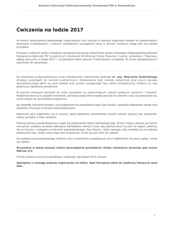 Biuletyn Informacji Publicznej Komendy Powiatowej PSP w Świebodzinie Ćwiczenia na lodzie 2017 W ramach doskonalenia zawodowego rozpoczęliśmy cykl ćwiczeń w zakresie organizacji działań na zamarzniętych akwenach śródlądowych, z których umiejętności szczególnie teraz w okresie zimowym mogą stać się bardzo przydatne. Pierwsze, w których oprócz strażaków specjalistycznej grupy ratownictwa wodno-nurkowego świebodzińskiej Jednostki Ratowniczo-Gaśniczej PSP uczestniczyli członkowie Ochotniczej Straży Pożarnej z Lubrzy, Jemiołowa i Toporowa, odbyły się w dniu 4 lutego 2017 r. na pokrytym lodem Jeziorze Trześniowskim w Łagowie. W sumie zaangażowanych było blisko 30 ratowników. Po instruktażu przeprowadzonym przez koordynatora ratownictwa wodnego st. asp. Wojciecha Dudzińskiego strażacy przystąpili do ćwiczeń praktycznych. Doskonalone były metody ratownicze przy użyciu sprzętu specjalistycznego jakim są sanie lodowe oraz sprzętu zastępczego typu deska ortopedyczna, drabina czy wąż pożarniczy napełniony powietrzem. W sezonie zimowym dochodzi do wielu wypadków na zamarzniętych ciekach wodnych, jeziorach i stawach. Niejednokrotnie są to wypadki śmiertelne, ponieważ osoba która wpadła pod lód ma niewiele czasu na wydostanie się, zanim dojdzie do wychłodzenia organizmu. Jak dowiodły ćwiczenia strażacy są przygotowani do prowadzenia tego typu działań, posiadają odpowiedni sprzęt oraz skafandry chroniące ich przed niską temperaturą. Natomiast jeśli znajdziemy się w sytuacji, gdzie będziemy samodzielnie musieli udzielić pomocy bez strażaków, należy pamiętać o kilku zasadach. Podczas pomocy poszkodowanemu nigdy nie podchodźmy blisko załamanego lodu. W tym miejscu lód jest już mocno naruszony i podatny na dalsze pęknięcia. Pamiętajmy również o tym, aby podczas akcji nie stać na nogach, połóżmy się na brzuchu i czołgajmy w kierunku poszkodowanego. Gdy leżymy, ciężar naszego ciała rozkłada się na większej powierzchni lodu, dzięki czemu daje nam to pewność, że lód się pod nami nie załamie. Do wydobycia poszkodowanego możemy użyć przedmiotów znajdujących się w najbliższym otoczeniu gałęzi, sanek czy szalika. Oczywiście w takiej sytuacji należy bezwzględnie powiadomić służby ratownicze dzwoniąc pod numer 998 lub 112. Termin szkolenia nie był przypadkowy, rozpoczęły się bowiem ferie zimowe. Apelujemy o rozwagę podczas wypoczynku na lodzie. Apel kierujemy także do wędkarzy łowiących spod lodu. 1
