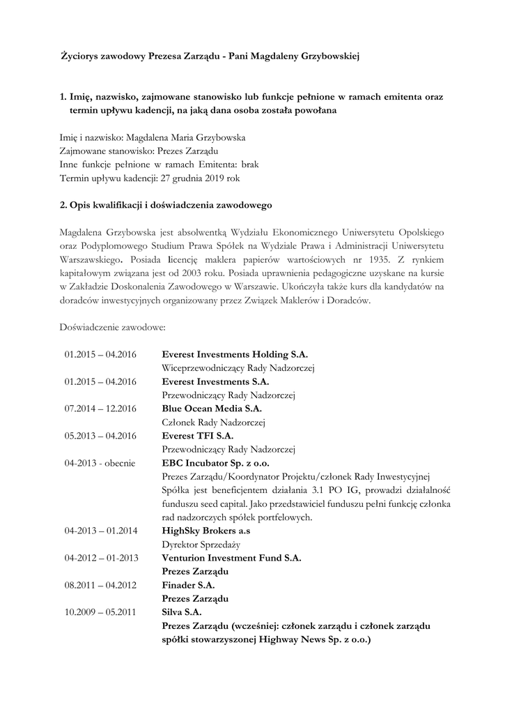 Życiorys zawodowy Prezesa Zarządu - Pani Magdaleny Grzybowskiej 1. Imię, nazwisko, zajmowane stanowisko lub funkcje pełnione w ramach emitenta oraz termin upływu kadencji, na jaką dana osoba została powołana Imię i nazwisko: Magdalena Maria Grzybowska Zajmowane stanowisko: Prezes Zarządu Inne funkcje pełnione w ramach Emitenta: brak Termin upływu kadencji: 27 grudnia 2019 rok 2. Opis kwalifikacji i doświadczenia zawodowego Magdalena Grzybowska jest absolwentką Wydziału Ekonomicznego Uniwersytetu Opolskiego oraz Podyplomowego Studium Prawa Spółek na Wydziale Prawa i Administracji Uniwersytetu Warszawskiego. Posiada licencję maklera papierów wartościowych nr 1935. Z rynkiem kapitałowym związana jest od 2003 roku. Posiada uprawnienia pedagogiczne uzyskane na kursie w Zakładzie Doskonalenia Zawodowego w Warszawie. Ukończyła także kurs dla kandydatów na doradców inwestycyjnych organizowany przez Związek Maklerów i Doradców. Doświadczenie zawodowe: 01.2015 – 04.2016 01.2015 – 04.2016 07.2014 – 12.2016 05.2013 – 04.2016 04-2013 - obecnie 04-2013 – 01.2014 04-2012 – 01-2013 08.2011 – 04.2012 10.2009 – 05.2011 Everest Investments Holding S.A. Wiceprzewodniczący Rady Nadzorczej Everest Investments S.A. Przewodniczący Rady Nadzorczej Blue Ocean Media S.A. Członek Rady Nadzorczej Everest TFI S.A. Przewodniczący Rady Nadzorczej EBC Incubator Sp. z o.o. Prezes Zarządu/Koordynator Projektu/członek Rady Inwestycyjnej Spółka jest beneficjentem działania 3.1 PO IG, prowadzi działalność funduszu seed capital. Jako przedstawiciel funduszu pełni funkcję członka rad nadzorczych spółek portfelowych. HighSky Brokers a.s Dyrektor Sprzedaży Venturion Investment Fund S.A. Prezes Zarządu Finader S.A. Prezes Zarządu Silva S.A. Prezes Zarządu (wcześniej: członek zarządu i członek zarządu spółki stowarzyszonej Highway News Sp. z o.o.) 05.2008 – 06.2009 09.2005 – 09.2007 Lighthouse Consultants sp. z o. o. Financial PR Manager GM Communication sp. z o.o. Wiceprezes Zarządu Expander sp. z o. o. Analityk Rynków Finansowych Dom Maklerski X-Trade Brokers S.A. Makler Papierów Wartościowych; Senior Dealer Związek Maklerów i Doradców Dyrektor Biura; Członek Zarządu Warszawska Grupa Medialna sp. z o.o. Specjalista ds. Marketingu Wyższa Szkoła Cła i Logistyki 01.2004 – 12.2007 Związek Maklerów i Doradców, Gazeta Giełdy Parkiet 10.2003 – 01.2006 Wyższa Szkoła Techniczno-Ekonomiczna w Warszawie 07.2007 – 05.2008 02.2007 – 07.2007 11.2005 – 02.2007 09.2003 – 11.2005 03.2001 – 10.2001 Dodatkowe doświadczenie: Pełniła funkcje Członka Rad Nadzorczych: Internetowy Dom Handlowy S.A. (e-commerce) Biomax S.A. Nutri – Pharmax S.A. Polskie Jadło S.A. 3. Wskazanie działalności wykonywanej przez daną osobę poza emitentem, gdy działalność ta ma istotne znaczenie dla emitenta Pani Magdalena Grzybowska nie prowadzi działalności mającej istotne znaczenie dla Emitenta. 4. Wskazanie wszystkich spółek prawa handlowego, w których, w okresie co najmniej ostatnich trzech lat, dana osoba była członkiem organów zarządzających lub nadzorczych albo wspólnikiem, ze wskazaniem, czy dana osoba nadal pełni funkcje w organach lub jest nadal wspólnikiem Obecnie - Prezes Zarządu w EBC Incubator sp. z o.o.; Poprzednio - Finader S.A - Prezes Zarzadu, Venturion Investment Fund S.A. - Prezes Zarządu (obecnie - Equitier S.A.), Polskie Jadło S.A., Sharky Investments sp. z o.o., Blue Ocean Media S.A. - Członek Rady Nadzorczej, Everest Investemets S.A. - Przewodniczący Rady Nadzorczej, Everest Investments Holding S.A.- Wiceprzewodniczący Rady Nadzorczej. 5. Informacje na temat prawomocnych wyroków, na mocy których dana osoba została skazana za przestępstwa oszustwa w okresie co najmniej ostatnich pięciu lat oraz wskazanie, czy w okresie co najmniej ostatnich pięciu lat osoba taka otrzymała sądowy zakaz działania jako członek organów zarządzających lub nadzorczych w spółkach prawa handlowego W okresie ostatnich pięciu lat Pani Magdalena Grzybowska nie została skazany za przestępstwo oszustwa. W okresie ostatnich pięciu lat Pani Magdalena Grzybowska nie otrzymała sądowego zakazu działania jako członek organów zarządzających lub nadzorczych w spółkach prawa handlowego. 6. Szczegóły wszystkich przypadków upadłości, zarządu komisarycznego lub likwidacji, w okresie co najmniej ostatnich pięciu lat, w odniesieniu do podmiotów, w których dana osoba pełniła funkcje członka organu zarządzającego lub nadzorczego W okresie ostatnich pięciu lat miała miejsce upadłość, zarząd komisaryczny lub likwidacja podmiotu, w którym Pani Magdalena Grzybowska pełniła funkcje członka Rady Nadzorczej (Polskie Jadło S.A.) 7. Informacje, czy dana osoba prowadzi działalność, która jest konkurencyjna w stosunku do działalności emitenta, oraz czy jest wspólnikiem konkurencyjnej spółki cywilnej lub osobowej albo członkiem organu spółki kapitałowej lub członkiem organu jakiejkolwiek konkurencyjnej osoby prawnej Pani Magdalena Grzybowska nie prowadzi konkurencyjnej działalności w stosunku do działalności Emitenta, ani nie jest wspólnikiem konkurencyjnej spółki cywilnej lub osobowej albo członkiem organu spółki kapitałowej lub członkiem organu jakiejkolwiek konkurencyjnej osoby prawnej. 8. Informacje, czy dana osoba figuruje w rejestrze dłużników niewypłacalnych, prowadzonym na podstawie ustawy z dnia 20 sierpnia 1997 r. o Krajowym Rejestrze Sądowym Pani Magdalena Grzybowska nie figuruje w rejestrze dłużników niewypłacalnych prowadzonym na podstawie ustawy z dnia 20 sierpnia 1997 r. o Krajowym Rejestrze Sądowym.