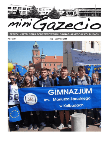 Nr 5 (147) Maj - Czerwiec 2016 Z życia szkoły P Pola Nadziei o raz kolejny nasz Szkolny Klub Wolontariusza wziął udział w akcji charytatywnej Pola Nadziei. 28 uczniów gimnazjum w dniu 24 kwietnia 2016 r. zbierało datki do puszek na rzecz pomorskich hospicjów przed kościołami w Kolbudach, Lublewie i Czapielsku. Łącznie zebraliśmy na ten cel ponad 4,6 tys.zł. (Kolbudy – ponad 3,1 tys. zł, Lublewo – ponad -1 tys. zł, Czapielsk - ponad 500 zł.). W akcji uczestniczyło też 18 nauczycieli, którzy sprawowali opiekę nad wolontariuszami. Dziękujemy wszystkim ofiarodawcom za ogromny dar serca, a księżom za pomoc w organizacji tej akcji. Do zobaczenia za rok! WYCIECZKA NA WILEŃSZCZYZNĘ J Pani Anna Moskal uż po raz drugi w ramach podpisanej współpracy naszej gminy z miastem Niemenczyn na Litwie 29 kwietnia rozpoczęła się kilkudniowa wycieczka na Wileńszczyznę. Udział w niej wzięli uczniowie starszych klas gimnazjum, którzy na lekcjach języka polskiego i historii poznali zagadnienia związane z epoką romantyzmu oraz stosunków polsko – litewskich na przestrzeni wieków. Pokonaliśmy w sumie około 1300 km przekraczając dwukrotnie granicę w Ogrodnikach. Współczesna Litwa jest niewielkim państwem nadbałtyckim liczącym zaledwie 4 miliony mieszkańców, wśród których znaczny procent stanowi ludność polskiego pochodzenia, ciesząca się niezależnością kulturową. Nocleg oraz wyżywienie zapewniło nam polskie gimnazjum im. Konstantego Parczewskiego (powstaniec listopadowy) w Niemenczynie, oddalonym od stolicy zaledwie o 25 km. W sobotę rano w Wilnie wzięliśmy udział w paradzie zorganizowanej z okazji Dnia Polonii i Polaków za Granicą oraz upamiętniającej 1050 rocznicę Chrztu Polski. Zachwyciła nas tak liczna obecność rodaków i bogactwo strojów narodowych. Przemarsz odbywał się głównymi ulicami miasta – długą ulicą Giedymi- 2 sytet Wileński, Archikatedrę z kaplicą św. Kazimierza (Patrona), Celę Konrada oraz Kaplicę Matki Boskiej Ostrobramskiej z cudownym obrazem, przed którym spędziliśmy kilka chwil w modlitewnej zadumie. Na placu przed ratuszem uczestniczyliśmy w koncercie braci Golców. W na, przez plac katedralny aż pod Ostrą Bramę. Następnie z licencjonowanym przewodnikiem zwiedzaliśmy miasto – Cmentarz na Rossie, Górę Zamkową, Dom Muzeum Adama Mickiewicza, Uniwer- niedzielę udaliśmy się do Zułowa – miejsca urodzenia Józefa Piłsudskiego, gdzie z inicjatywy Związku Polaków na Litwie odsłonięto dwie kolejne stelle i zasadzono dęby upamiętniające Żołnierzy Wyklętych (dziś Niezłomnych) oraz 1050 rocznicę Chrztu Polski. W uroczystości uczestniczyli Konsul RP, posłowie na Sejm RP i Wicemarszałek Senatu RP. W części mniej oficjalnej skosztowaliśmy gorącej żołnierskiej grochówki. W drodze do Wilna zatrzymaliśmy się w malutkiej wsi o pięknej nazwie Powiewiórka, w której w malutkim kościółku ochrzczony został malutki Ziuk – późniejszy marszałek. Drugą część dnia przeznaczyliśmy na dalsze zwiedzanie stolicy. Tym razem byliśmy w kościele św. Piotra i Pawła – perle wileńskiego baroku, wewnątrz Na okładce: Reprezentacja gimnazjalistów na pochodzie z okazji Święta Europy w Warszawie Gazeta Zespołu Kształcenia Podstawowego i Gimnazjalnego w Kolbudach. Redagują uczniowie naszej szkoły; opieka: A. M o r a w s k a , M . S z e n k i n - C h m i e l e w s k a , M . Wo j c i e c h o w s k a ; z d j ę c i a : Ż . Wi s o w a t a , w w w. w i k i p e d i a . p l , w w w. g o o g l e . c o m Wy daw ca: ZKPiG 83-050 Kol bu dy, ul. Wy bic kie go 33, tel. (058) 682 72 78, e-ma il redakcji:[email protected], http://www.zkpigkolbudy.edu.pl którego znajduje się kilka tysięcy rzeźb i płaskorzeźb ze stiuku, a następnie w Zgromadzeniu Sióstr Miłosierdzia Bożego, które kilka lat temu założyło i prowadzi jedyne jak dotąd hospicjum na Litwie i gdzie w 1934 roku powstał oryginalny obraz pędzla Eugeniusza Kazimirowskiego Jezu Ufam Tobie. Obecnie oryginał znajduje się w kaplicy niedaleko polskiego kościoła św. Ducha. Tam naturalnie też byliśmy. Długo. W ciszy. Spacerem w dzielnicy artystów na Zarzeczu zakończyliśmy zwiedzanie miasta. Napisana w dwudziestu kilku językach Konstytucja Zarzeczańska ubawiła nas, ale i sprowokowała do myślenia. C ały poniedziałek spędziliśmy w zaprzyjaźnionym gimnazjum wśród rówieśników. Najpierw grupami (pięcioosobowymi) wzięliśmy czynny (!) udział w dwóch dowolnie wybranych lekcjach (polskiego, chemii, obrony cywilnej, angielskiego, informatyki, biologii, muzyki, fizyki). Początek był trudny – odczuwaliśmy skrępowanie, podobnie jak niemenczyńscy uczniowie. Podczas przerw przełamaliśmy lody. I było super! Następnie podczas warsztatów teatralnych odgrywaliśmy scenki wg fragmentów literatury Szekspira, Fredry i Brzechwy. W czasie zajęć plastycznych wykonywaliśmy węglem i kredą na szarym papierze plakaty pro- W Z życia szkoły wości uczestniczenia w próbie zespołu tanecznego „Jutrzenka”, który gościł niedawno u nas w szkole. Dzień pełen wrażeń zakończyliśmy dyskoteką. W mujące Polskę za granicą. Po obiedzie przyszedł czas na zajęcia ruchowe, a więc rozgrywki w drużynach miesza- nych w piłkę nożną i siatkówkę oraz ćwiczenia sprawnościowe. W miejskim domu kultury skorzystaliśmy z możli- Akademia 3 maja piątek 29.04.2016 r. w naszej szkole odbyła się uroczysta akademia z okazji uchwalenia Konstytucji 3 Maja. Publiczność została przeniesiona do czasów obrad Sejmu Czteroletniego, zwanego też Wielkim, w latach 1788 – 1792. Najbardziej zaskoczył zebranych król Stanisław August Poniatowski (wspaniale zagrany przez Wiktora Murglina z kl. 1 B gimnazjum), który ubrany w królewskie szaty z epoki oświecenia, przypomniał o największych zmianach, które miały uzdrowić rządzenie w naszym kraju, co zapisano właśnie w konstytucji e wtorek przy M