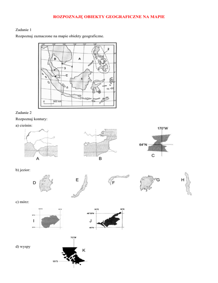 ROZPOZNAJĘ OBIEKTY GEOGRAFICZNE NA MAPIE Zadanie 1 Rozpoznaj zaznaczone na mapie obiekty geograficzne. Zadanie 2 Rozpoznaj kontury: a) cieśnin: A C B b) jezior: D E F c) mórz: I J d) wyspy K G H
