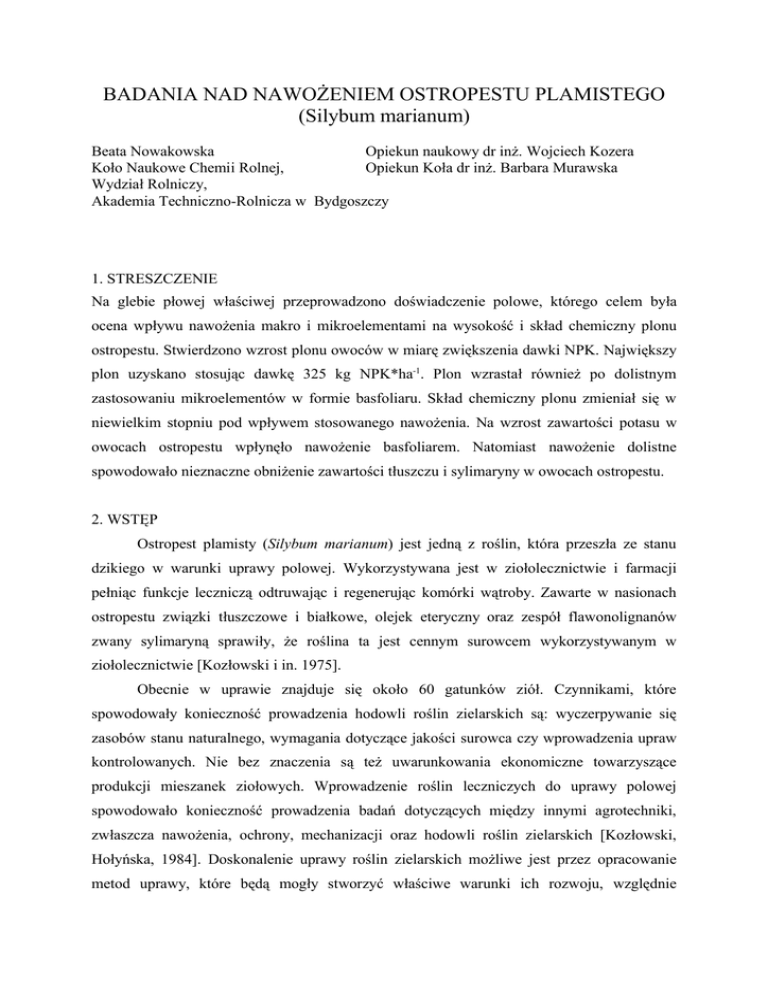 BADANIA NAD NAWOŻENIEM OSTROPESTU PLAMISTEGO (Silybum marianum) Beata Nowakowska Opiekun naukowy dr inż. Wojciech Kozera Koło Naukowe Chemii Rolnej, Opiekun Koła dr inż. Barbara Murawska Wydział Rolniczy, Akademia Techniczno-Rolnicza w Bydgoszczy 1. STRESZCZENIE Na glebie płowej właściwej przeprowadzono doświadczenie polowe, którego celem była ocena wpływu nawożenia makro i mikroelementami na wysokość i skład chemiczny plonu ostropestu. Stwierdzono wzrost plonu owoców w miarę zwiększenia dawki NPK. Największy plon uzyskano stosując dawkę 325 kg NPK*ha-1. Plon wzrastał również po dolistnym zastosowaniu mikroelementów w formie basfoliaru. Skład chemiczny plonu zmieniał się w niewielkim stopniu pod wpływem stosowanego nawożenia. Na wzrost zawartości potasu w owocach ostropestu wpłynęło nawożenie basfoliarem. Natomiast nawożenie dolistne spowodowało nieznaczne obniżenie zawartości tłuszczu i sylimaryny w owocach ostropestu. 2. WSTĘP Ostropest plamisty (Silybum marianum) jest jedną z roślin, która przeszła ze stanu dzikiego w warunki uprawy polowej. Wykorzystywana jest w ziołolecznictwie i farmacji pełniąc funkcje leczniczą odtruwając i regenerując komórki wątroby. Zawarte w nasionach ostropestu związki tłuszczowe i białkowe, olejek eteryczny oraz zespół flawonolignanów zwany sylimaryną sprawiły, że roślina ta jest cennym surowcem wykorzystywanym w ziołolecznictwie [Kozłowski i in. 1975]. Obecnie w uprawie znajduje się około 60 gatunków ziół. Czynnikami, które spowodowały konieczność prowadzenia hodowli roślin zielarskich są: wyczerpywanie się zasobów stanu naturalnego, wymagania dotyczące jakości surowca czy wprowadzenia upraw kontrolowanych. Nie bez znaczenia są też uwarunkowania ekonomiczne towarzyszące produkcji mieszanek ziołowych. Wprowadzenie roślin leczniczych do uprawy polowej spowodowało konieczność prowadzenia badań dotyczących między innymi agrotechniki, zwłaszcza nawożenia, ochrony, mechanizacji oraz hodowli roślin zielarskich [Kozłowski, Hołyńska, 1984]. Doskonalenie uprawy roślin zielarskich możliwe jest przez opracowanie metod uprawy, które będą mogły stworzyć właściwe warunki ich rozwoju, względnie pozwolić wyhodować odmiany odpowiednie do warunków glebowo-klimatycznych oraz czynników agrotechnicznych. Zakłada się, że cele te można osiągnąć między innymi poprzez kontrolowane nawożenie, które przyczyni się do wzrostu plonu oraz poprawy jego jakości. Należy nadmienić, że w literaturze naukowej niewiele jest informacji dotyczących tego zagadnienia. W związku z powyższym podjęto badania, których celem była ocena wpływu nawożenia makro i mikroelementami na wysokość plonu ostropestu i jego skład chemiczny. 3. MATERIAŁ I METODY Badania przeprowadzono w 2003 roku w oparciu o ścisłe doświadczenie mikropoletkowe. Doświadczenie zostało założone w Stacji Badawczej ATR w Wierzchucinku, miejscowości położonej na północny-zachód od Bydgoszczy, na skraju Pojezierza Krajeńskiego. Poletka doświadczenia zlokalizowano na glebie płowej właściwej wytworzonej z gliny zwałowej i zaliczanej do kompleksu żytniego dobrego. Gleba charakteryzowała się średnią zawartością przyswajalnych form fosforu, potasu, cynku, manganu, molibdenu i boru, a niską zasobnością w miedź i manganu. Doświadczenie polowe wytyczono według metody losowanych podbloków split-plot jako dwuczynnikowe, z czterema replikacjami. Czynnikiem pierwszego rzędu (A) było zróżnicowane nawożenie NPK (n=3), które zastosowano w następujących dawkach i fazach rozwojowych roślin: NPK-1 ( 86kg N + 26 kg P+ 75 kg K ·ha-1) – w polifosce 6 przedsiewnie i w saletrze amonowej pogłównie w fazie rozety liściowej. NPK-2 ( 126 kg N + 35 kg P + 100 kg K ·ha-1) – w polifosce 6 przedsiewnie i w saletrze amonowej pogłównie w fazie rozety liściowej. NPK-3 ( 166 kg N + 44 kg P + 125 kg K ·ha-1) – w polifosce 6 przedsiewnie i w saletrze amonowej pogłównie w fazie rozety liściowej. Czynnikiem drugiego rzędu (B) było zastosowane nawożenie dolistne. Basfoliar 36 Ex stosowano poczynając od fazy rozety liściowej, co dwa tygodnie w ilości 10+10+10 dm3·ha-1 w 400 dm3 wody. Na poletkach nie nawożonych mikroelementami stosowano opryskiwanie równoważną ilością wody. Przedmiotem badań była podselekcjonowana populacja ostropestu plamistego (Silybum marianum) uprawianego w kraju [Kaźmierczak, Seidler–Łożyskowa, 1997]. Ostropest uprawiano po selerze, w drugim roku po oborniku. Zabiegi uprawowopielęgnacyjne i ochronne przeprowadzono według zaleceń agrotechnicznych dla tej rośliny. Zbioru owoców dokonano dwuetapowo z powierzchni poletka równej 3 m2. Z uzyskanych prób polowych pobrano średnie próby laboratoryjne, w których po uprzednim zmieleniu i mineralizacji na mokro w kwasie siarkowym oznaczono: zawartość azotu ogólnego metodą Kjeldahla, zawartość fosforu metodą molibdenowo wanadową, zawartość potasu metodą spektroskopii emisyjnej. W zmielonym materiale roślinnym oznaczono: zawartości tłuszczu metodą wagową po ekstrakcji eterowej w aparacie Soxleta, zawartości sylimaryny metodą kolorymetryczną według PN 91/R-87019. Analizę statystyczną wyników przeprowadzono, wykonując obliczenia analizy wariancji dla metody split-plot w układzie doświadczenia dwuczynnikowego; dla oceny istotności różnic wykorzystano test Tukey´a przy α =0,05, obliczając odpowiednie różnice graniczne. 4. WYNIKI I DYSKUSJA Kozłowski i Hołyńska [1985], na podstawie wieloletnich badań wskazują, że plon ostropestu plamistego jest w dużym stopniu determinowany czynnikami meteorologicznymi. Na te uwarunkowania wskazuje też Czabajska i in. [1988]. Autorzy Ci wskazują, że w korzystnym dla wegetacji ostropestu plamistego roku uprawy można uzyskać nawet do 2 t owoców, chociaż zwykle plon ten jest znacznie niższy. Średni plon owoców ostropestu 