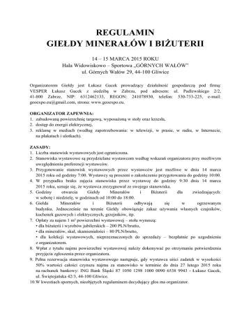 REGULAMIN GIEŁDY MINERAŁÓW I BIŻUTERII 14 – 15 MARCA 2015 ROKU Hala Widowiskowo – Sportowa „GÓRNYCH WAŁÓW” ul. Górnych Wałów 29, 44-100 Gliwice Organizatorem Giełdy jest Łukasz Gacek prowadzący działalność gospodarczą pod firmą: VESPER Łukasz Gacek z siedzibą w Zabrzu, pod adresem: ul. Padlewskiego 2/2, 41-800 Zabrze, NIP: 6312462133, REGON: 241078930, telefon: 530-733-225, e-mail: [email protected], strona: www.geoexpo.eu. ORGANIZATOR ZAPEWNIA: 1. zabudowaną powierzchnię targową, wyposażoną w stoły oraz krzesła, 2. dostęp do energii elektrycznej, 3. reklamę w mediach (według zapotrzebowania: w telewizji, w prasie, w radiu, w Internecie, na plakatach i ulotkach). ZASADY: 1. Liczba stanowisk wystawowych jest ograniczona. 2. Stanowiska wystawowe są przydzielane wystawcom według wskazań organizatora przy możliwym uwzględnieniu preferencji wystawców. 3. Przygotowanie stanowisk wystawowych przez wystawców jest możliwe w dniu 14 marca 2015 roku od godziny 7:00. Wystawcy są proszeni o zakończenie przygotowania do godziny 10:00. 4. W przypadku braku zajęcia stanowiska przez wystawcę do godziny 9:30 dnia 14 marca 2015 roku, uznaje się, że wystawca zrezygnował ze swojego stanowiska. 5. Godziny otwarcia Giełdy Minerałów i Biżuterii dla zwiedzających: w sobotę i niedzielę, w godzinach od 10:00 do 18:00. 6. Giełda Minerałów i Biżuterii odbywają się w ogrzewanym budynku. Jednocześnie na terenie Giełdy obowiązuje zakaz używania własnych czajników, kuchenek gazowych i elektrycznych, grzejników, itp. 7. Opłaty za najem 1 m² powierzchni wystawowej – stołu wynoszą: • dla biżuterii i wyrobów jubilerskich – 200 PLN/brutto, • dla minerałów, skał, skamieniałości – 80 PLN/brutto, • dla kolekcji wystawowych, nieprzeznaczonych do sprzedaży – bezpłatnie po uzgodnieniu z organizatorem. 8. Wpłat z tytułu najmu powierzchni wystawowej należy dokonywać po otrzymaniu potwierdzenia przyjęcia zgłoszenia przez organizatora. 9. Pełna rezerwacja stanowiska wystawowego następuje, gdy wystawca uiści zadatek w wysokości 50% wartości całości czynszu najmu za stanowisko w terminie do dnia 27 lutego 2015 roku na rachunek bankowy: ING Bank Śląski 87 1050 1298 1000 0090 6538 9943 - Łukasz Gacek, ul. Świętojańska 42/3, 44-100 Gliwice. 10.W kwestiach spornych, nieobjętych regulaminem decydujący głos ma organizator.