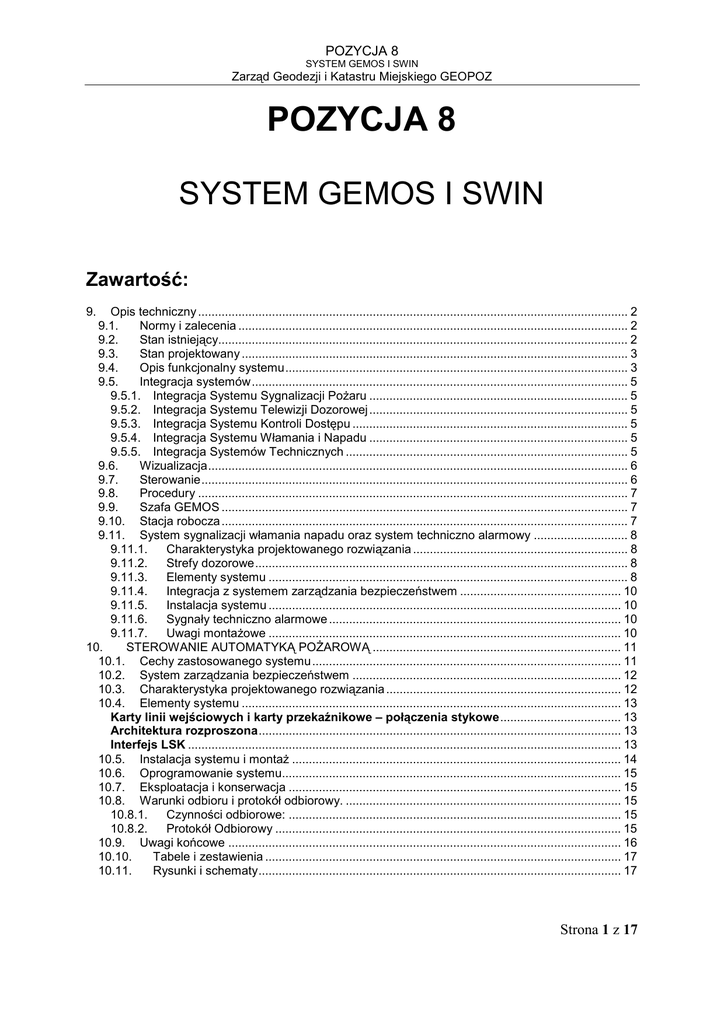 POZYCJA 8 SYSTEM GEMOS I SWIN Zarząd Geodezji i Katastru Miejskiego GEOPOZ POZYCJA 8 SYSTEM GEMOS I SWIN Zawartość: 9. Opis techniczny ................................................................................................................................ 2 9.1. Normy i zalecenia .................................................................................................................... 2 9.2. Stan istniejący.......................................................................................................................... 2 9.3. Stan projektowany ................................................................................................................... 3 9.4. Opis funkcjonalny systemu ...................................................................................................... 3 9.5. Integracja systemów ................................................................................................................ 5 9.5.1. Integracja Systemu Sygnalizacji PoŜaru ............................................................................. 5 9.5.2. Integracja Systemu Telewizji Dozorowej ............................................................................. 5 9.5.3. Integracja Systemu Kontroli Dostępu .................................................................................. 5 9.5.4. Integracja Systemu Włamania i Napadu ............................................................................. 5 9.5.5. Integracja Systemów Technicznych .................................................................................... 5 9.6. Wizualizacja ............................................................................................................................. 6 9.7. Sterowanie ............................................................................................................................... 6 9.8. Procedury ................................................................................................................................ 7 9.9. Szafa GEMOS ......................................................................................................................... 7 9.10. Stacja robocza ......................................................................................................................... 7 9.11. System sygnalizacji włamania napadu oraz system techniczno alarmowy ............................ 8 9.11.1. Charakterystyka projektowanego rozwiązania ................................................................ 8 9.11.2. Strefy dozorowe ............................................................................................................... 8 9.11.3. Elementy systemu ........................................................................................................... 8 9.11.4. Integracja z systemem zarządzania bezpieczeństwem ................................................ 10 9.11.5. Instalacja systemu ......................................................................................................... 10 9.11.6. Sygnały techniczno alarmowe ....................................................................................... 10 9.11.7. Uwagi montaŜowe ......................................................................................................... 10 10. STEROWANIE AUTOMATYKĄ POśAROWĄ .......................................................................... 11 10.1. Cechy zastosowanego systemu ............................................................................................ 11 10.2. System zarządzania bezpieczeństwem ................................................................................ 12 10.3. Charakterystyka projektowanego rozwiązania ...................................................................... 12 10.4. Elementy systemu ................................................................................................................. 13 Karty linii wejściowych i karty przekaźnikowe – połączenia stykowe .................................... 13 Architektura rozproszona ............................................................................................................ 13 Interfejs LSK ................................................................................................................................. 13 10.5. Instalacja systemu i montaŜ .................................................................................................. 14 10.6. Oprogramowanie systemu..................................................................................................... 15 10.7. Eksploatacja i konserwacja ................................................................................................... 15 10.8. Warunki odbioru i protokół odbiorowy. .................................................................................. 15 10.8.1. Czynności odbiorowe: ................................................................................................... 15 10.8.2. Protokół Odbiorowy ....................................................................................................... 15 10.9. Uwagi końcowe ..................................................................................................................... 16 10.10. Tabele i zestawienia .......................................................................................................... 17 10.11. Rysunki i schematy ............................................................................................................ 17 Strona 1 z 17 POZYCJA 8 SYSTEM GEMOS I SWIN Zarząd Geodezji i Katastru Miejskiego GEOPOZ 9. Opis techniczny 9.1. Normy i zalecenia 1. Ustawa "Prawo Budowlane" 1994 Dz.U. Nr 89 poz.414 2. Polska Norma „Systemy Alarmowe” PN-E-0839: Arkusze 11, 12, 14, 20, 30, 22-36 3. Polska Norma PN-EN-45014 4. Normy Międzynarodowe i Zalecane Procedury - Aneks 17 do Konwencji o Międzynarodowym Lotnictwie Cy