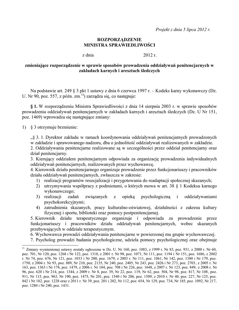 Projekt z dnia 5 lipca 2012 r. ROZPORZĄDZENIE MINISTRA SPRAWIEDLIWOŚCI z dnia 2012 r. zmieniające rozporządzenie w sprawie sposobów prowadzenia oddziaływań penitencjarnych w zakładach karnych i aresztach śledczych Na podstawie art. 249 § 3 pkt 1 ustawy z dnia 6 czerwca 1997 r. – Kodeks karny wykonawczy (Dz. U. Nr 90, poz. 557, z późn. zm.1)) zarządza się, co następuje: § 1. W rozporządzeniu Ministra Sprawiedliwości z dnia 14 sierpnia 2003 r. w sprawie sposobów prowadzenia oddziaływań penitencjarnych w zakładach karnych i aresztach śledczych (Dz. U Nr 151, poz. 1469) wprowadza się następujące zmiany: 1) § 3 otrzymuje brzmienie: „§ 3. 1. Dyrektor zakładu w ramach koordynowania oddziaływań penitencjarnych prowadzonych w zakładzie i sprawowanego nadzoru, dba o jednolitość oddziaływań realizowanych w zakładzie. 2. Oddziaływania penitencjarne realizowane są w szczególności przez oddział penitencjarny oraz dział penitencjarny. 3. Kierujący oddziałem penitencjarnym odpowiada za organizację prowadzenia indywidualnych oddziaływań penitencjarnych, realizowanych przez wychowawcę. 4. Kierownik działu penitencjarnego organizuje prowadzenie przez funkcjonariuszy i pracowników działu oddziaływań penitencjarnych, zwłaszcza w zakresie: 1) realizacji programów resocjalizacji i przygotowania do readaptacji społecznej skazanych; 2) utrzymywania współpracy z podmiotami, o których mowa w art. 38 § 1 Kodeksu karnego wykonawczego; 3) realizacji zadań związanych z opieką psychologiczną i oddziaływaniami psychokorekcyjnymi; 4) zatrudnienia skazanych, pracy kulturalno-oświatowej, działalności z zakresu kultury fizycznej i sportu, biblioteki oraz pomocy postpenitencjarnej. 5. Kierownik działu terapeutycznego organizuje i odpowiada za prowadzenie przez funkcjonariuszy i pracowników działu oddziaływań penitencjarnych, wobec skazanych przebywających w oddziale terapeutycznym. 6. Wychowawca prowadzi oddziaływania penitencjarne w powierzonej mu grupie wychowawczej. 7. Psycholog prowadzi badania psychologiczne, udziela pomocy psychologicznej oraz obejmuje 1) Zmiany wymienionej ustawy zostały ogłoszone w Dz. U. Nr 160, poz. 1083, z 1999 r. Nr 83, poz. 931, z 2000 r. Nr 60, poz. 701, Nr 120, poz. 1268 i Nr 122, poz. 1318, z 2001 r. Nr 98, poz. 1071, Nr 111, poz. 1194 i Nr 151, poz. 1686, z 2002 r. Nr 74, poz. 676, Nr 121, poz. 1033 i Nr 200, poz. 1679, z 2003 r. Nr 111, poz. 1061, Nr 142, poz. 1380 i Nr 179, poz. 1750, z 2004 r. Nr 93, poz. 889, Nr 210, poz. 2135, Nr 240, poz. 2405, Nr 243, poz. 2426 i Nr 273, poz. 2703 , z 2005 r. Nr 163, poz. 1363 i Nr 178, poz. 1479, z 2006 r. Nr 104, poz. 708 i Nr 226, poz. 1648, z 2007 r. Nr 123, poz. 849, z 2008 r. Nr 96, poz. 620 i Nr 214, poz. 1344, z 2009 r. Nr 8, poz. 39, Nr 22, poz. 119, Nr 62, poz. 504, Nr 98, poz. 817, Nr 108 , poz. 911, Nr 115, poz. 963, Nr 190, poz. 1475, Nr 201, poz. 1540 i Nr 206, poz. 1589, z 2010 r. Nr 40, poz. 227, Nr 125, poz. 842 i Nr 182, poz. 1228 oraz z 2011 r. Nr 39, poz. 201 i 202, Nr 112, poz. 654, Nr 129, poz. 734, Nr 185, poz. 1092, Nr 217, poz. 1280 i Nr 240, poz. 1431. skazanych odpowiednimi oddziaływaniami psychokorekcyjnymi lub terapeutycznymi. 8. Pozostali funkcjonariusze i pracownicy zakładu prowadzą oddziaływania penitencjarne w zakresie wynikającym z powierzonych im zadań.”; 2) w § 7 w ust. 2: a) uchyla się pkt 6, b) pkt 13 otrzymuje brzmienie: „13) wspieraniu kontaktów skazanych z osobami najbliższymi;”; 3) w § 11: a) pkt 3 otrzymuje brzmienie: „3) co do którego zachodzi podejrzenie konieczności stosowania oddziaływań w warunkach oddziału terapeutycznego dla skazanych z niepsychotycznymi zaburzeniami psychicznymi lub upośledzonych umysłowo;”, b) po pkt 4 kropkę zastępuje się średnikiem i dodaje się pkt 5 w brzmieniu: „5) za przestępstwo określone w art. 197-203 ustawy z dnia 6 czerwca 1997 r. – Kodeks karny (Dz. U. Nr 88, poz. 553, z późn. zm.2)), zwanej dalej „Kodeksem karnym”, popełnione w związku z zaburzeniami preferencji seksualnych.”; 4) § 12 otrzymuje brzmienie: „§ 12. Opinie psychologiczne sporządza się o skazanym: 1) przed sporządzeniem wniosku o zakwalifikowanie skazanego uzależnionego od alkoholu albo środków odurzających lub substancji psychotropowych do odbywania kary w systemie terapeutycznym; 2) na karę dożywotniego pozbawienia wolności, a także na karę 25 lat pozbawienia wolności przed podjęciem decyzji przez komisję penitencjarną o skierowaniu do zakładu typu półotwartego; 3) przed podjęciem decyzji o złożeniu wniosku, do sądu opiekuńczego, o zgodę na oddzielenie dziecka od matki odbywającej karę, przebywającej z dzieckiem w domu dla matki i dziecka, lub o przedłużenie albo skrócenie okresu przebywania dziecka z matką; 4) przed podjęciem decyzji o złożeniu wniosku do sądu penitencjarnego, o wydanie orzeczenia o obciążeniu skazanego kosztami związanymi z leczeniem spowodowanego u siebie uszkodzenia ciała lub rozstroju zdrowia; 2) Zmiany tekstu wymienionej ustawy zostały ogłoszone w Dz. U. Nr 128, poz. 840, z 1999 r. Nr 64, poz. 729 i Nr 83, poz. 931, z 2000 r. Nr 48, poz. 548, Nr 93, poz. 1027 i Nr 116, poz. 1216, z 2001 r. Nr 98, poz. 1071, z 2003 r . Nr 111, poz. 1061, Nr 121, poz. 1142, Nr 179, poz. 1750, Nr 199, poz. 1935 i Nr 228, poz. 2255, z 2004 r. Nr 25, poz. 219, Nr 69, poz. 626, Nr 93, poz. 889 i Nr 243, poz. 2426, z 2005 r. Nr 86, poz. 732, Nr 90, poz. 757, Nr 132, poz. 1109, Nr 163, poz. 1363, Nr 178, poz. 1479 i Nr 180, poz. 1493, z 2006 r. Nr 190, poz. 1409, Nr 218, poz. 1592 i Nr 226, poz. 1648, z 2007 r. Nr 89, poz. 589, Nr 123, poz. 850, Nr 124, poz. 859 i Nr 192, poz. 1378, z 2008 r. Nr 90, poz. 560, Nr 122, poz. 782, Nr 171, poz. 1056, Nr 173, poz. 1080 i Nr 214, poz. 1344, z 2009 r. Nr 62, poz. 504, Nr 63, poz. 533, Nr 166, poz. 1317, Nr 168, poz. 1323, Nr 190, poz. 1474, Nr 201, poz. 1540 i Nr 206, poz. 1589, z 2010 r. Nr 7,