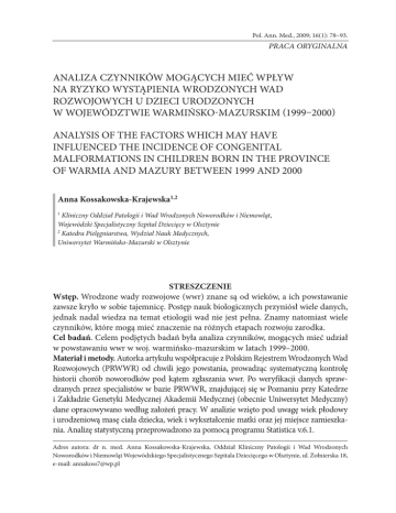 Pol. Ann. Med., 2009; 16(1): 78–93. PRACA ORYGINALNA ANALIZA CZYNNIKÓW MOGĄCYCH MIEĆ WPŁYW NA RYZYKO WYSTĄPIENIA WRODZONYCH WAD ROZWOJOWYCH U DZIECI URODZONYCH W WOJEWÓDZTWIE WARMIŃSKO-MAZURSKIM (1999–2000) ANALYSIS OF THE FACTORS WHICH MAY HAVE INFLUENCED THE INCIDENCE OF CONGENITAL MALFORMATIONS IN CHILDREN BORN IN THE PROVINCE OF WARMIA AND MAZURY BETWEEN 1999 AND 2000 Anna Kossakowska-Krajewska1,2 1 Kliniczny Oddział Patologii i Wad Wrodzonych Noworodków i Niemowląt, Wojewódzki Specjalistyczny Szpital Dziecięcy w Olsztynie 2 Katedra Pielęgniarstwa, Wydział Nauk Medycznych, Uniwersytet Warmińsko-Mazurski w Olsztynie STRESZCZENIE Wstęp. Wrodzone wady rozwojowe (wwr) znane są od wieków, a ich powstawanie zawsze kryło w sobie tajemnicę. Postęp nauk biologicznych przyniósł wiele danych, jednak nadal wiedza na temat etiologii wad nie jest pełna. Znamy natomiast wiele czynników, które mogą mieć znaczenie na różnych etapach rozwoju zarodka. Cel badań. Celem podjętych badań była analiza czynników, mogących mieć udział w powstawaniu wwr w woj. warmińsko-mazurskim w latach 1999–2000. Materiał i metody. Autorka artykułu współpracuje z Polskim Rejestrem Wrodzonych Wad Rozwojowych (PRWWR) od chwili jego powstania, prowadząc systematyczną kontrolę historii chorób noworodków pod kątem zgłaszania wwr. Po weryfikacji danych sprawdzanych przez specjalistów w bazie PRWWR, znajdującej się w Poznaniu przy Katedrze i Zakładzie Genetyki Medycznej Akademii Medycznej (obecnie Uniwersytet Medyczny) dane opracowywano według założeń pracy. W analizie wzięto pod uwagę wiek płodowy i urodzeniową masę ciała dziecka, wiek i wykształcenie matki oraz jej miejsce zamieszkania. Analizę statystyczną przeprowadzono za pomocą programu Statistica v.6.1. Adres autora: dr n. med. Anna Kossakowska-Krajewska, Oddział Kliniczny Patologii i Wad Wrodzonych Noworodków i Niemowląt Wojewódzkiego Specjalistycznego Szpitala Dziecięcego w Olsztynie, ul. Żołnierska 18, e-mail: [email protected] Analiza czynników mogących mieć wpływ na ryzyko wystąpienia wrodzonych wad rozwojowych u dzieci … 79 Wyniki. Wrodzone wady rozwojowe (wwr) odnotowano u 276 chłopców, co wyraża się współczynnikiem występowania wad (www) 166,8/10 000 urodzonych chłopców i u 212 dziewczynek, www 136,2/10 000 urodzonych dziewczynek. Na wyższą częstość występowania wwr u chłopców rzutowała prawie 10-krotnie większa częstość występowania wad układu moczowego. Noworodki urodzone przez matki zamieszkałe w mieście stanowiły 132,9/10000 noworodków matek zamieszkałych w mieście, a noworodki matek zamieszkałych na wsi 141,9/10 000 noworodków matek zamieszkałych na wsi. Stwierdzono również, że u dzieci z małą urodzeniową masą ciała wwr występowały 2–3 razy częściej niż w ogólnej populacji. Największą częstość występowania wwr stwierdzono u dzieci matek, które w chwili urodzenia miały 35 i więcej lat, a największy wpływ zaawansowanego wieku matki zaobserwowano dla wad spowodowanych aberracjami chromosomowymi. Mapa rozmieszczenia wad na poziomie poszczególnych powiatów może stanowić pierwszy krok do dalszych badań regionów o podwyższonym ryzyku występowania wwr. Największą częstość występowania wwr, niezależnie od rodzaju wady, stwierdzono w powiatach mrągowskim, ostródzkim i braniewskim, a najmniejszą w powiatach ełckim, olecko-gołdapskim i giżyckim. Wnioski. Po analizie wszystkich uzyskanych danych stwierdzono: 1. Istnieje związek miedzy płcią męską a częstością występowania wwr narządów płciowych. 2. Istnieje związek niskiej masy urodzeniowej z podwyższoną częstością występowania wwr. ABSTRACT Introduction. Congenital malformations have been known about for ages, but the reasons for their development have always been shrouded in mystery. All efforts to explain such reasons as to relating to the natural forces of God’s revenge have not stood the test of time. Still, the knowledge concerning the aetiology of malformations is not complete; we know, however, about many factors which may contribute to their development during various stages of embryogenesis. Aim. The aim of this paper is the analysis of specific factors which may have contributed to the development of congenital malformations in children born in the Province of Warmia and Mazury between the years 1999 and 2000. Materials and methods. The author of this paper, who is involved in the creation of the Polish Register of Congenital Malformations (PRCM), evaluated case records of newborns who had been reported to have been born with congenital malformations. The data recorded in this Register, maintained by the Chair and Department of Medical Genetics at the Medical Academy (at present Medical University) in Poznań, was verified by specialists, and later analysed according to the methodologi- 80 A. Kossakowska-Krajewska cal principles of this work. The analysis included: fetal age and birth weight, mother’s age and education, as well as mother’s place of residence. Statistical analysis was carried out by means of Statistica v.6.1 software. Results and discussion. Congenital malformations were found in 276 boys, with a malformations incidence factor of 166.8/10000 for boys, and in 212 girls, the malformations incidence factor being 136.2/10000 for girls. The higher incidence of congenital malformations in boys was caused by a nearly 10 times higher incidence of urinary system defects. The incidence of congenital malformations in newborns whose mothers resided in cities amounted to 132.9/10000 of newborns born in cities. The incidence of congenital malformations in newborns of mothers residing in the country was 141.9/10 000 of newborns born in the country. It was also noted that the incidence of congenital malformations was 2–3 times higher in children with low birth weight in comparison to the general population. The highest i