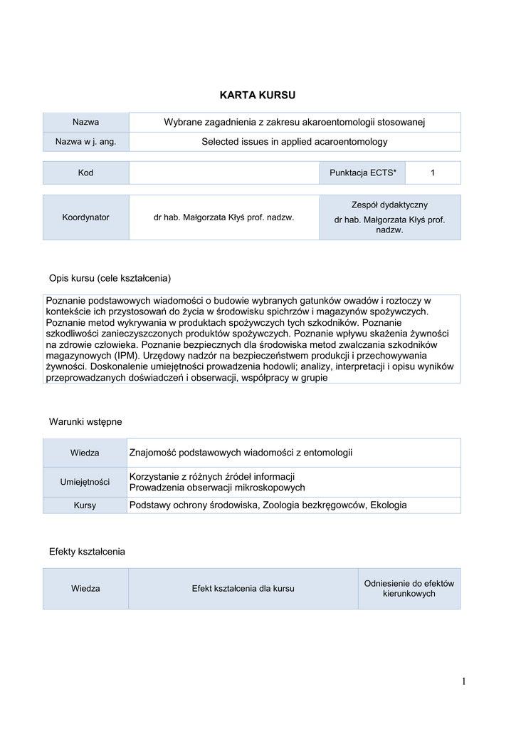 KARTA KURSU Nazwa Wybrane zagadnienia z zakresu akaroentomologii stosowanej Nazwa w j. ang. Selected issues in applied acaroentomology Kod Punktacja ECTS* 1 Zespół dydaktyczny Koordynator dr hab. Małgorzata Kłyś prof. nadzw. dr hab. Małgorzata Kłyś prof. nadzw. Opis kursu (cele kształcenia) Poznanie podstawowych wiadomości o budowie wybranych gatunków owadów i roztoczy w kontekście ich przystosowań do życia w środowisku spichrzów i magazynów spożywczych. Poznanie metod wykrywania w produktach spożywczych tych szkodników. Poznanie szkodliwości zanieczyszczonych produktów spożywczych. Poznanie wpływu skażenia żywności na zdrowie człowieka. Poznanie bezpiecznych dla środowiska metod zwalczania szkodników magazynowych (IPM). Urzędowy nadzór na bezpieczeństwem produkcji i przechowywania żywności. Doskonalenie umiejętności prowadzenia hodowli; analizy, interpretacji i opisu wyników przeprowadzanych doświadczeń i obserwacji, współpracy w grupie Warunki wstępne Wiedza Umiejętności Kursy Znajomość podstawowych wiadomości z entomologii Korzystanie z różnych źródeł informacji Prowadzenia obserwacji mikroskopowych Podstawy ochrony środowiska, Zoologia bezkręgowców, Ekologia Efekty kształcenia Wiedza Efekt kształcenia dla kursu Odniesienie do efektów kierunkowych 1 W01 Zna podstawowe pojęcia z akaroentomologii i potrafi je zinterpretować K_W13 W02 Zna wybrane gatunki szkodników magazynowych i ich stadia rozwojowe K_W13 W03 Zna podstawowe metody wykrywania szkodliwych owadów i roztoczy w produktach spożywczych K_W18 W04 Zna budowę owadów i roztoczy magazynowych i ich K_W13 przystosowania do życia w środowisku spichrzów i magazynów spożywczych W05 Charakteryzuje szkodliwość owadów i roztoczy magazynowych W06 Zna metody zwalczania szkodników magazynowych W07 Zna cel i główne elementy integrowanego zwalczania szkodników (IPM); integrowanej ochrony roślin Efekt kształcenia dla kursu Umiejętności K_W14 K_W26 K_W26 Odniesienie do efektów kierunkowych U01 Rozpoznaje wybrane gatunki szkodników magazynowych i ich stadia rozwojowe K_U13 U02 Dostrzega zagrożenia wynikające z zanieczyszczenia produktów żywnościowych szkodliwymi organizmami K_U15, K_U08 U03 Rozumie i wdraża w życie integrowaną ochronę roślin, w tym roślinnych produktów spożywczych K_U20, K_U19 U 04 Samodzielnie wyszukuje i korzysta z różnych źródeł informacji biologicznej K_U19 U05 Wykonuje doświadczenia i obserwacje K_U24, K_U18, laboratoryjne U06 Stosuje zasady bezpiecznego przechowywania żywności K_U22 2 Odniesienie do efektów kierunkowych Efekt kształcenia dla kursu Kompetencje społeczne K01 Sprawnie organizuje wspólne wykonywanie doświadczeń i pracę w grupie K_K10, K_K08, K_K12 K02 Postępuje zgodnie z obowiązującymi procedurami z powierzonym sprzętem laboratoryjnym K_K11 K03 Jest wrażliwy na przestrzeganie zasad związanych z bezpieczeństwem żywności K_K02 Organizacja Forma zajęć Ćwiczenia w grupach Wykład (W) A Liczba godzin K L 8 S P E 10 Opis metod prowadzenia zajęć Wykłady prezentacja multimedialna - graficzna i filmowa Ćwiczenia obserwacje mikroskopowe, zakładanie i prowadzenie hodowli masowych owadów magazynowych, doświadczenia laboratoryjne: ograniczanie liczebności owadów magazynowych W01 W02 W03 Inne Egzamin pisemny Egzamin ustny Praca pisemna (esej) Referat Udział w dyskusji Projekt grupowy Projekt indywidualny Praca laboratoryjna Zajęcia terenowe Ćwiczenia w szkole Gry dydaktyczne E – learning Formy sprawdzania efektów kształcenia x x x 3 x W04 W05 W06 W07 U01 U02 U03 U04 U05 U06 K01 K02 K03 Kryteria oceny x x x x x x x x x x x x Ocena końcowa obejmuje oceny wykonanych doświadczeń, oraz pisemny sprawdzian z treści wykładów Uwagi Treści merytoryczne (wykaz tematów) 1. Akaroentomologia stosowana a ekologia. 2. Przystosowania owadów i roztoczy magazynowych do życia w środowisku spichrzów i magazynów spożywczych. 3. Metody wykrywania szkodników w przechowywanych produktach spożywczych. 4. Różne aspekty szkodliwości stawonogów występujących w magazynowanych produktach spożywczych. 5. Integrowane metody ochrony magazynowanych zbóż i produktów spożywczych przed szkodnikami (IPM). 6. Rozpoznawanie szkodników magazynowych i ich stadiów rozwojowych. 7. Zakładanie i prowadzenie hodowli masowych owadów magazynowych. 8. Próby ograniczenia liczebności szkodliwych owadów – doświadczenia laboratoryjne. Wykaz literatury podstawowej 1. J. Nawrot – Owady – szkodniki magazynowe Wyd. Themar 2. J. Boczek, B. Czajkowska – Roztocze – magazynowe i kurzu domowego. Wyd. Themar 2003. 3. J. Boczek - Zarys akarologii rolniczej. Wyd. Naukowe PWN Warszawa 1999. 4. J. Nawrot – Klucz do rozpoznawania stadiów larwalnych szkodników magazynowych. Wyd. Themar 2003. 4 Wykaz literatury uzupełniającej 1. J. Boczek – Nauka o szkodnikach roślin uprawnych. Wyd. SGGW Warszawa 1998 2. J. Boczek, Cz. Błaszak. Roztocze (Acari). Znaczenie w życiu i gospodarce człowieka. Wyd. SGGW Warszawa 2005. Bilans godzinowy zgodny z CNPS (Całkowity Nakład Pracy Studenta) Ilość godzin w kontakcie z prowadzącymi Ilość godzin pracy studenta bez kontaktu z prowadzącymi Wykład 8 Konwersatorium (ćwiczenia, laboratorium itd.) 10 Pozostałe godziny kontaktu studenta z prowadzącym 2 Lektura w ramach przygotowania do zajęć 3 Przygotowanie krótkiej pracy pisemnej lub referatu po zapoznaniu się z niezbędną literaturą przedmiotu 2 Przygotowanie projektu lub prezentacji na podany temat (praca w grupie) 2 Przygotowanie do egzaminu 3 Ogółem bilans czasu pracy 30 Ilość punktów ECTS w zależności od przyjętego przelicznika 1 5