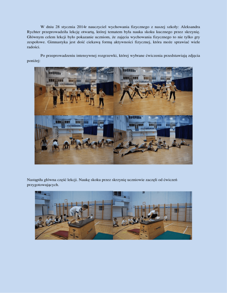 W dniu 28 stycznia 2014r nauczyciel wychowania fizycznego z naszej szkoły: Aleksandra Rychter przeprowadziła lekcję otwartą, której tematem była nauka skoku kucznego przez skrzynię. Głównym celem lekcji było pokazanie uczniom, że zajęcia wychowania fizycznego to nie tylko gry zespołowe. Gimnastyka jest dość ciekawą formą aktywności fizycznej, która może sprawiać wiele radości. Po przeprowadzeniu intensywnej rozgrzewki, której wybrane ćwiczenia przedstawiają zdjęcia poniżej: Nastąpiła główna część lekcji. Naukę skoku przez skrzynię uczniowie zaczęli od ćwiczeń przygotowujących. W dalszej kolejności uczniowie wykonywali pełny skok przez skrzynię. Uczniowie klasy 4 byli zadowoleni z przeprowadzonej lekcji. Chętnie w niej uczestniczyli, a nawet pod koniec zajęć zaczęli ze sobą rywalizować . Na koniec zajęć klasa zrobiła sobie pamiątkowe zdjęcie.