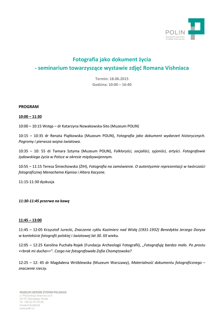 Fotografia jako dokument życia - seminarium towarzyszące wystawie zdjęć Romana Vishniaca Termin: 18.06.2015 Godzina: 10:00 – 16:40 PROGRAM 10:00 – 11:30 10:00 – 10:15 Wstęp – dr Katarzyna Nowakowska-Sito (Muzeum POLIN) 10:15 – 10:35 dr Renata Piątkowska (Muzeum POLIN), Fotografia jako dokument wydarzeń historycznych. Pogromy i pierwsza wojna światowa. 10:35 – 10: 55 dr Tamara Sztyma (Muzeum POLIN), Folkloryści, socjaliści, syjoniści, artyści. Fotografowie żydowskiego życia w Polsce w okresie międzywojennym. 10:55 – 11:15 Teresa Śmiechowska (ŻIH), Fotografia na zamówienie. O autentyzmie reprezentacji w twórczości fotograficznej Menachema Kipnisa i Altera Kacyzne. 11:15-11:30 dyskusja 11:30-11:45 przerwa na kawę 11:45 – 13:00 11:45 – 12:05 Krzysztof Jurecki, Znaczenie cyklu Kazimierz nad Wisłą (1931-1932) Benedykta Jerzego Dorysa w kontekście fotografii polskiej i światowej lat 30. XX wieku. 12:05 – 12:25 Karolina Puchała-Rojek (Fundacja Archeologii Fotografii), „Fotografuję bardzo mało. Po prostu <<brak mi ducha>>”. Czego nie fotografowała Zofia Chomętowska? 12:25 – 12: 45 dr Magdalena Wróblewska (Muzeum Warszawy), Materialność dokumentu fotograficznego – znaczenie rzeczy. 12:45 – 13:00 dyskusja 13:00 – 14:00 przerwa na lunch 14:00 – 14:55 14:00 – 14:20 dr Artur Tanikowski (Muzeum POLIN), Świat dipisów w fotografiach Romana Vishniaca a narracja Galerii Powojnie. 14: 20– 14:40 Danuta Jackiewicz (MNW), Fotografia uliczna Jana Kosidowskiego, fotoreportera tygodnika ilustrowanego „Świat” (1951-1969). 14:40 – 15:00 dr Kamila Leśniak (KUL), Niewidoczne centrum? The Family of Man a Zagłada. 15:00 – 15:15 dyskusja 15:15 – 15:30 przerwa na kawę 15:30 – 16:40 15:30 – 15:50 Tomasz Strug (Muzeum Galicja) Ostatni rozdział? Spojrzenie na projekty fotograficzne poświęcone Żydom w Europie Środkowej i Wschodniej w latach 70. i 80. XX wieku. 15:50 – 16:10 dr Adam Mazur, Od Bram tragedii do Niewinne oko nie istnieje. Powojenna polska książka fotograficzna wobec pamięci o polskich Żydach. 16:10-16:20 Komunikat: Ewa Małkowska-Bieniek (Muzeum POLIN) Obywatel wyznania mojżeszowego i jego otoczenie na fotografiach Tadeusza Przypkowskiego ze zbiorów muzeum POLIN. 16:20- 16:40 dyskusja