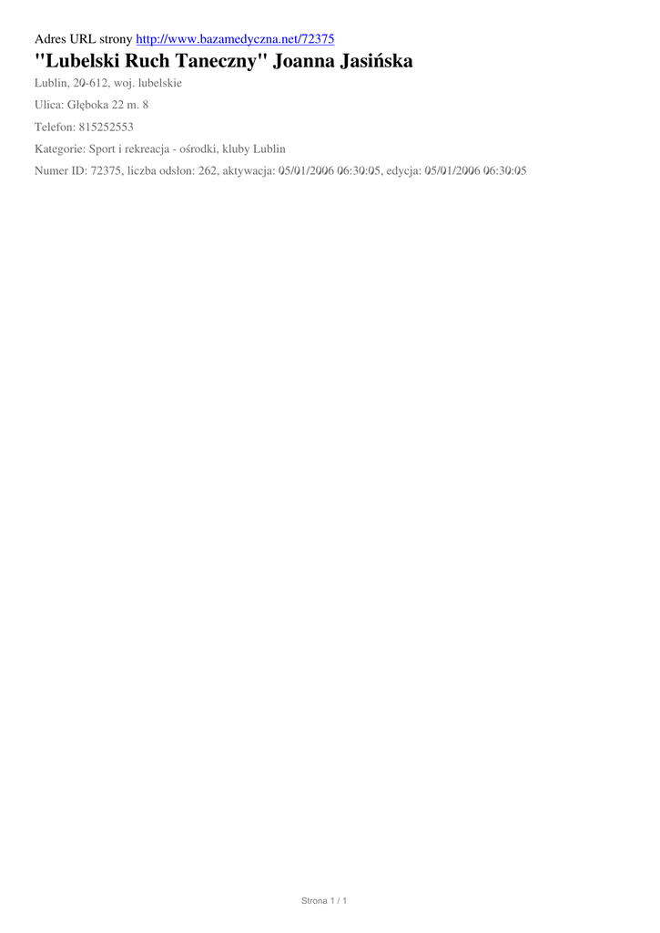 Adres URL strony http://www.bazamedyczna.net/72375 "Lubelski Ruch Taneczny" Joanna Jasińska Lublin, 20-612, woj. lubelskie Ulica: Głęboka 22 m. 8 Telefon: 815252553 Kategorie: Sport i rekreacja - ośrodki, kluby Lublin Numer ID: 72375, liczba odsłon: 262, aktywacja: 05/01/2006 06:30:05, edycja: 05/01/2006 06:30:05 Strona 1 / 1