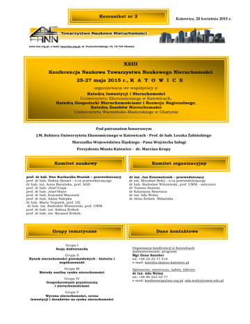 Komunikat nr 2 Katowice, 20 kwietnia 2015 r. www.tnn.org.pl, e-mail: [email protected], ul. Prawocheńskiego 15, 10-724 Olsztyn XXIII Konferencja Naukowa Towarzystwa Naukowego Nieruchomości 25-27 maja 2015 r., K A T O W I C E organizowana we współpracy z: Katedrą Inwestycji i Nieruchomości Uniwersytetu Ekonomicznego w Katowicach, Katedrą Gospodarki Nieruchomościami i Rozwoju Regionalnego, Katedrą Zasobów Nieruchomości Uniwersytetu Warmińsko-Mazurskiego w Olsztynie Podpatronatemhonorowym J.M.RektoraUniwersytetuEkonomicznegowKatowicach‐Prof.drhab.LeszkaŻabińskiego MarszałkaWojewództwaŚląskiego‐PanaWojciechaSaługi PrezydentaMiastaKatowice‐dr.MarcinaKrupy Komitet naukowy prof. dr hab. Ewa Kucharska-Stasiak – przewodniczący prof. dr hab. Halina Henzel – z-ca przewodniczącego dr hab. inż. Anna Barańska, prof. AGH prof. dr hab. Józef Czaja prof. dr hab. Józef Hozer prof. dr hab. Krzysztof Marcinek prof. dr hab. Adam Nalepka dr hab. Maria Trojanek, prof. UE dr hab. inż. Radosław Wiśniewski, prof. UWM prof. dr hab. inż. Sabina Źróbek prof. dr hab. inż. Ryszard Źróbek Grupy tematyczne Grupa I Sesja doktorancka Grupa II Rynek nieruchomości przemysłowych - historia i współczesność Grupa III Metody analizy rynku nieruchomości Grupa IV Gospodarowanie przestrzenią i nieruchomościami Grupa V Wycena nieruchomości, ocena inwestycji i doradztwo na rynku nieruchomości Komitet organizacyjny dr inż. Jan Konowalczuk – przewodniczący dr inż. Mirosław Bełej – z-ca przewodniczącego dr hab. Radosław Wiśniewski, prof. UWM - sekretarz dr Tomasz Ramian dr Katarzyna Śmietana dr inż. Ada Wolny dr Alina Źróbek -Różańska Dane kontaktowe Organizacja konferencji w Katowicach (zakwaterowanie, program) Mgr Ilona Sznober tel. +48 32 25 77 510 e-mail: [email protected] Zgłoszenia, rejestracja, opłaty, faktury dr inż. Ada Wolny tel. +48 89 523 42 77 e-mail: [email protected], [email protected] Informacje szczegółowe I. MIEJSCE OBRAD: Centrum Informacji Naukowej i Biblioteka Akademicka (CINiBA) Katowice, ul. Bankowa 11a REJESTRACJA UCZESTNIKÓW: 25 maja 2015 roku o godz. 14.15 - 15.00 (CINiBA – hol przy Sali Konferencyjnej) ROZPOCZĘCIE KONFERENCJI: 25 maja 2015 roku o godz. 15.00 (CINiBA - Sala Konferencyjna) ZAKOŃCZENIE KONFERENCJI: 27 maja 2015 roku o godz. 14.00 (CINiBA - Sala Konferencyjna) II. ZAKWATEROWANIE: NOVOTEL Katowice Centrum, al. Roździeńskiego 16, 40-202 Katowice, od 14.00 (250 m od CINiBA, parking przy hotelu bezpłatny dla osób korzystających z noclegów) III. REFERATY: Wszystkie zgłoszone i zaakceptowane referaty będą wygłoszone na konferencji w formie 15 min. wystąpień lub 5 min. Komunikatów wraz z posterem. Rada Programowa Konferencji dokona wyboru referatów do poszczególnych form wystąpienia. IV. Uprzejmie przypominamy o konieczności dokonaniu opłaty konferencyjnej zgodnie z zasadami przedstawionymi w Komunikacie nr 1 na konto Towarzystwa Naukowego Nieruchomości PKO BP S.A. Oddział Centrum w Olsztynie NR 22 1020 3541 0000 5502 0011 1963 „XXIII Konferencja TNN”- imię i nazwisko Jednocześnie informujemy, iż zgłoszony referat nie zostanie opublikowany w przypadku nie uiszczenia opłaty konferencyjnej lub opłaty za publikację Ramowy Program Konferencji 25 maja 2015 r. (poniedziałek) 14.15 - 15.00 Rejestracja uczestników – CINiBA - Sala Konferencyjna na parterze 15.00 - 15.15 Powitanie – CINiBA - Sala Konferencyjna na parterze 15.15 - 15.45 Prezentacja działalności naukowo-dydaktycznej Katedry Inwestycji i Nieruchomości UE Katowice – CINiBA Sala Konferencyjna na parterze 15.45 - 16.45 Sesja doktorancka – CINiBA - Sala Konferencyjna na parterze 16.45 - 17.00 Przerwa na kawę – CINiBA - hol przy Sali Konferencyjnej 17.00 - 18.15 Zebranie sprawozdawczo - wyborcze TNN CINiBA - Sala Konferencyjna na parterze 19.00 - 22.00 Kolacja z niespodzianką - Restauracja „Cadenza”w budynku NOSPR - Narodowej Orkiestry Symfonicznej Polskiego Radia w Katowicach, Plac Wojciecha Kilara 1 (350 m od CINiBA i 500 m od hotelu NOVOTEL CENTRUM – przejście kładką nad Aleją Roździeńskiego) 26 maja 2015 r. (wtorek) 9.00 - 10.30 Uroczyste otwarcie konferencji, wykład inauguracyjny „Współczesne oblicze Katowic – przemiany poprzemysłowego centrum” oraz sesja plenarna – CINiBA - Sala Konferencyjna na parterze 10.30 - 10.45 Przerwa na kawę – CINiBA - hol przy Sali Konferencyjnej 10.45 - 12.30 Sesja plenarna – CINiBA - Sala Konferencyjna na parterze 12.30 - 12.45 Przerwa na kawę – CINiBA - hol przy Sali Konferencyjnej 12.45 - 14.30 Sesja plenarna - CINiBA Sala Konferencyjna na parterze 14.30 - 15.15 Obiad - CINiBA - salka restauracyjna i hol przy Sali Konferencyjnej 15.15 - 16.15 Sesja plenarna - CINiBA Sala Konferencyjna na parterze 17.15 - 18.00 przejazd autokarem z Katowic (przez Giszowiec i Nikoszowiec) do Zabrza, Muzeum Górnictwa Węglowego w Zabrzu, Zabytkowa Kopalnia GUIDO – wyjazd z parkingu hotelu NOVOTEL 18.15 - 19.15 Zjazd („szolą”) na poziom 320, krótkie zwiedzanie zabytkowej kopalni 19.30 - 24.00 Kolacja w Sali Kompresorów na poziomie 320, wyjazd „szolą” i powrót autokarami na parking hotelu NOVOTEL CENTRUM 27 maja 2015 r. (środa) – całość obrad CINiBA Sala Konferencyjna na parterze 9.00 - 10.30 Sesja plenarna 10.30 - 10.45 Przerwa kawowa - hol przy Sali Konferencyjnej na parterze 10.45 - 12.30 Sesja plenarna 12.30 - 13.00 Zakończenie konferencji 13.00 - 14.00 Obiad - CINiBA hol przy Sali Konferencyjnej Z poważaniem dr inż. Jan Konowalczuk Przewodniczący Komitetu Organizacyjnego