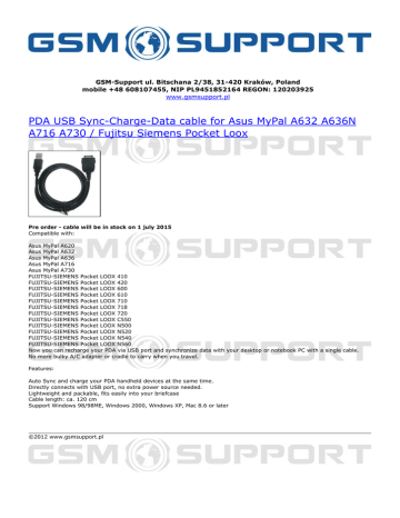 GSM-Support ul. Bitschana 2/38, 31-420 Kraków, Poland mobile +48 608107455, NIP PL9451852164 REGON: 120203925 www.gsmsupport.pl PDA USB Sync-Charge-Data cable for Asus MyPal A632 A636N A716 A730 / Fujitsu Siemens Pocket Loox Pre order - cable will be in stock on 1 july 2015 Compatible with: Asus MyPal A620 Asus MyPal A632 Asus MyPal A636 Asus MyPal A716 Asus MyPal A730 FUJITSU-SIEMENS Pocket LOOX 410 FUJITSU-SIEMENS Pocket LOOX 420 FUJITSU-SIEMENS Pocket LOOX 600 FUJITSU-SIEMENS Pocket LOOX 610 FUJITSU-SIEMENS Pocket LOOX 710 FUJITSU-SIEMENS Pocket LOOX 718 FUJITSU-SIEMENS Pocket LOOX 720 FUJITSU-SIEMENS Pocket LOOX C550 FUJITSU-SIEMENS Pocket LOOX N500 FUJITSU-SIEMENS Pocket LOOX N520 FUJITSU-SIEMENS Pocket LOOX N540 FUJITSU-SIEMENS Pocket LOOX N560 Now you can recharge your PDA via USB port and synchronize data with your desktop or notebook PC with a single cable. No more bulky A/C adapter or cradle to carry when you travel. Features: Auto Sync and charge your PDA handheld devices at the same time. Directly connects with USB port, no extra power source needed. Lightweight and packable, fits easily into your briefcase Cable length: ca. 120 cm Support Windows 98/98ME, Windows 2000, Windows XP, Mac 8.6 or later ©2012 www.gsmsupport.pl Powered by TCPDF (www.tcpdf.org)