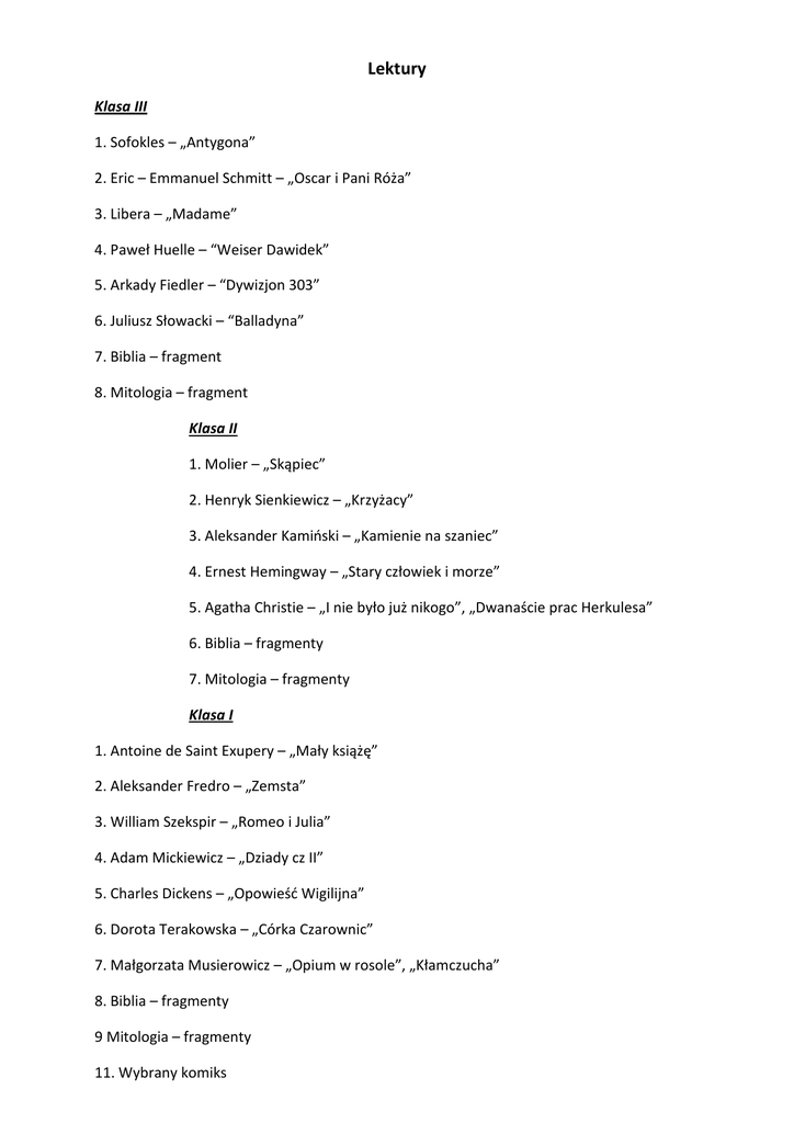Lektury Klasa III 1. Sofokles – „Antygona” 2. Eric – Emmanuel Schmitt – „Oscar i Pani Róża” 3. Libera – „Madame” 4. Paweł Huelle – “Weiser Dawidek” 5. Arkady Fiedler – “Dywizjon 303” 6. Juliusz Słowacki – “Balladyna” 7. Biblia – fragment 8. Mitologia – fragment Klasa II 1. Molier – „Skąpiec” 2. Henryk Sienkiewicz – „Krzyżacy” 3. Aleksander Kamiński – „Kamienie na szaniec” 4. Ernest Hemingway – „Stary człowiek i morze” 5. Agatha Christie – „I nie było już nikogo”, „Dwanaście prac Herkulesa” 6. Biblia – fragmenty 7. Mitologia – fragmenty Klasa I 1. Antoine de Saint Exupery – „Mały książę” 2. Aleksander Fredro – „Zemsta” 3. William Szekspir – „Romeo i Julia” 4. Adam Mickiewicz – „Dziady cz II” 5. Charles Dickens – „Opowieść Wigilijna” 6. Dorota Terakowska – „Córka Czarownic” 7. Małgorzata Musierowicz – „Opium w rosole”, „Kłamczucha” 8. Biblia – fragmenty 9 Mitologia – fragmenty 11. Wybrany komiks