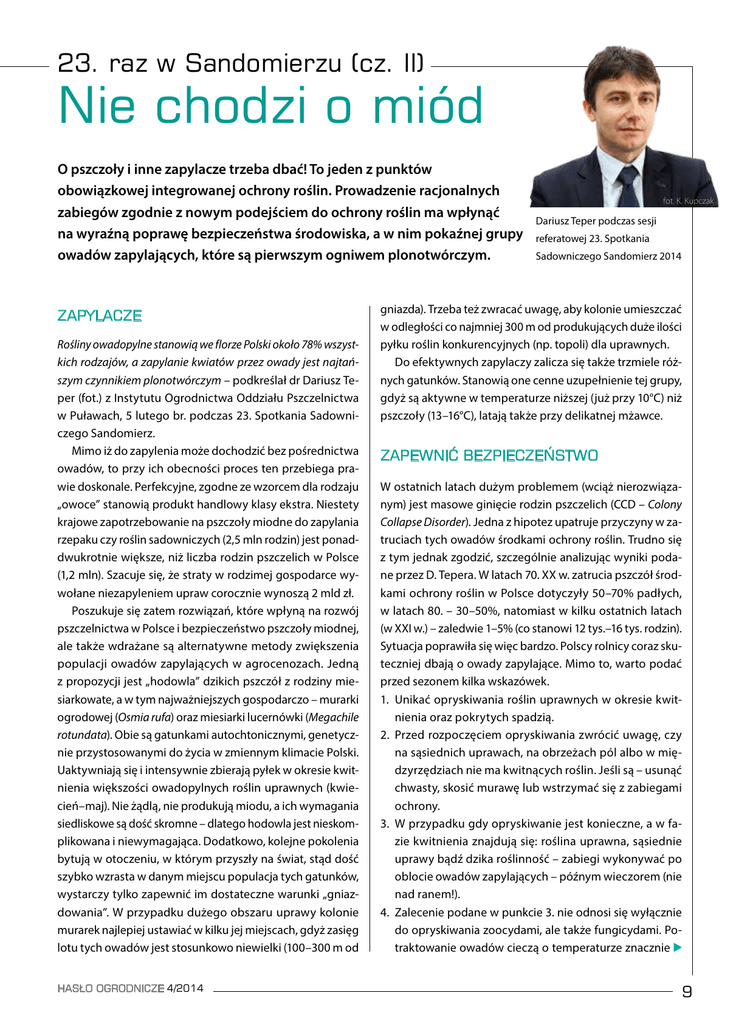 23. raz w Sandomierzu (cz. II) Nie chodzi o miód O pszczoły i inne zapylacze trzeba dbać! To jeden z punktów obowiązkowej integrowanej ochrony roślin. Prowadzenie racjonalnych zabiegów zgodnie z nowym podejściem do ochrony roślin ma wpłynąć na wyraźną poprawę bezpieczeństwa środowiska, a w nim pokaźnej grupy owadów zapylających, które są pierwszym ogniwem plonotwórczym. ZAPYLACZE Rośliny owadopylne stanowią we florze Polski około 78% wszystkich rodzajów, a zapylanie kwiatów przez owady jest najtańszym czynnikiem plonotwórczym – podkreślał dr Dariusz Teper (fot.) z Instytutu Ogrodnictwa Oddziału Pszczelnictwa w Puławach, 5 lutego br. podczas 23. Spotkania Sadowniczego Sandomierz. Mimo iż do zapylenia może dochodzić bez pośrednictwa owadów, to przy ich obecności proces ten przebiega prawie doskonale. Perfekcyjne, zgodne ze wzorcem dla rodzaju „owoce” stanowią produkt handlowy klasy ekstra. Niestety krajowe zapotrzebowanie na pszczoły miodne do zapylania rzepaku czy roślin sadowniczych (2,5 mln rodzin) jest ponaddwukrotnie większe, niż liczba rodzin pszczelich w Polsce (1,2 mln). Szacuje się, że straty w rodzimej gospodarce wywołane niezapyleniem upraw corocznie wynoszą 2 mld zł. Poszukuje się zatem rozwiązań, które wpłyną na rozwój pszczelnictwa w Polsce i bezpieczeństwo pszczoły miodnej, ale także wdrażane są alternatywne metody zwiększenia populacji owadów zapylających w agrocenozach. Jedną z propozycji jest „hodowla” dzikich pszczół z rodziny miesiarkowate, a w tym najważniejszych gospodarczo – murarki ogrodowej (Osmia rufa) oraz miesiarki lucernówki (Megachile rotundata). Obie są gatunkami autochtonicznymi, genetycznie przystosowanymi do życia w zmiennym klimacie Polski. Uaktywniają się i intensywnie zbierają pyłek w okresie kwitnienia większości owadopylnych roślin uprawnych (kwiecień–maj). Nie żądlą, nie produkują miodu, a ich wymagania siedliskowe są dość skromne – dlatego hodowla jest nieskomplikowana i niewymagająca. Dodatkowo, kolejne pokolenia bytują w otoczeniu, w którym przyszły na świat, stąd dość szybko wzrasta w danym miejscu populacja tych gatunków, wystarczy tylko zapewnić im dostateczne warunki „gniazdowania”. W przypadku dużego obszaru uprawy kolonie murarek najlepiej ustawiać w kilku jej miejscach, gdyż zasięg lotu tych owadów jest stosunkowo niewielki (100–300 m od HASŁO OGRODNICZE 4/2014 fot. K. Kupczak Dariusz Teper podczas sesji referatowej 23. Spotkania Sadowniczego Sandomierz 2014 gniazda). Trzeba też zwracać uwagę, aby kolonie umieszczać w odległości co najmniej 300 m od produkujących duże ilości pyłku roślin konkurencyjnych (np. topoli) dla uprawnych. Do efektywnych zapylaczy zalicza się także trzmiele różnych gatunków. Stanowią one cenne uzupełnienie tej grupy, gdyż są aktywne w temperaturze niższej (już przy 10°C) niż pszczoły (13–16°C), latają także przy delikatnej mżawce. ZAPEWNIĆ BEZPIECZEŃSTWO W ostatnich latach dużym problemem (wciąż nierozwiązanym) jest masowe ginięcie rodzin pszczelich (CCD – Colony Collapse Disorder). Jedna z hipotez upatruje przyczyny w zatruciach tych owadów środkami ochrony roślin. Trudno się z tym jednak zgodzić, szczególnie analizując wyniki podane przez D. Tepera. W latach 70. XX w. zatrucia pszczół środkami ochrony roślin w Polsce dotyczyły 50–70% padłych, w latach 80. – 30–50%, natomiast w kilku ostatnich latach (w XXI w.) – zaledwie 1–5% (co stanowi 12 tys.–16 tys. rodzin). Sytuacja poprawiła się więc bardzo. Polscy rolnicy coraz skuteczniej dbają o owady zapylające. Mimo to, warto podać przed sezonem kilka wskazówek. 1. Unikać opryskiwania roślin uprawnych w okresie kwitnienia oraz pokrytych spadzią. 2. Przed rozpoczęciem opryskiwania zwrócić uwagę, czy na sąsiednich uprawach, na obrzeżach pól albo w międzyrzędziach nie ma kwitnących roślin. Jeśli są – usunąć chwasty, skosić murawę lub wstrzymać się z zabiegami ochrony. 3. W przypadku gdy opryskiwanie jest konieczne, a w fazie kwitnienia znajdują się: roślina uprawna, sąsiednie uprawy bądź dzika roślinność – zabiegi wykonywać po oblocie owadów zapylających – późnym wieczorem (nie nad ranem!). 4. Zalecenie podane w punkcie 3. nie odnosi się wyłącznie do opryskiwania zoocydami, ale także fungicydami. Potraktowanie owadów cieczą o temperaturze znacznie 9 zaprosili nas niższej niż ich ciała spowodować może paraliż, w efekcie nawet śmierć. Poza tym owad potraktowany roztworem, nawet niegroźnego środka, pachnie chemikaliami, dlatego nierozpoznany przez strażniczki jako osobnik społeczności, nie zostaje wpuszczony do ula i ginie poza nim. 5. Do zabiegów zoocydowych wykorzystywać środki selektywne, bezpieczne dla organizmów pożytecznych, w tym dla zapylaczy. 6. Zakładać i chronić skupienia dzikiej roślinności śródpolnej, która stanowi źródło pokarmu, schronienia, bytowania i zimowania dla m.in. wolno żyjących zapylaczy. 7. Zabezpieczyć (poprzez założenie specjalnych osłon) ule i „domki” murarek znajdujące się w obszarze zabiegu, aby nie osiadała na nich bezpośrednio ciecz użytkowa (robocza). 8. Dbać o bioróżnorodność środowiska. Katarzyna Kupczak Fungicyd + efekt fizjologiczny Podczas konferencji prasowej, która wzmożeniu syntezy prozdrowotnych dla Retengo® Plus, Systiva®, Adexar® Plus, Ca- odbyła się 3 lutego w Warszawie, firma BASF (fot.) przedstawiła globalną markę produktów AgCelence. Na razie w tej grupie ponadprzeciętnych, jak twierdzi Mariusz Chojecki (m.in. odpowiedzialny za tę markę koncernu), środków ochrony roślin znalazło się 6 fungicydów. Ich specyfiką ma być wykraczające poza standardową ochronę działanie poprawiające fizjologię traktowanej rośliny. Lata doświadczeń z cząsteczkami aktywnymi stworzonymi przez BASF oraz tysiące przebadanych prób ro