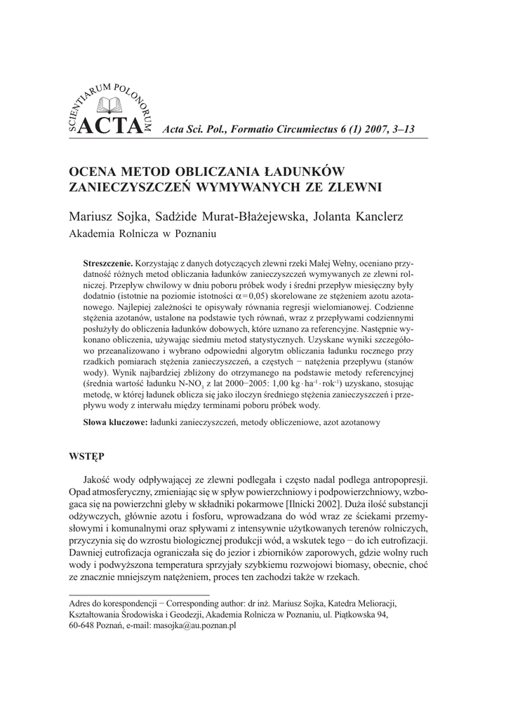 Acta Sci. Pol., Formatio Circumiectus 6 (1) 2007, 3–13 OCENA METOD OBLICZANIA ŁADUNKÓW ZANIECZYSZCZEŃ WYMYWANYCH ZE ZLEWNI Mariusz Sojka, Sadżide Murat-Błażejewska, Jolanta Kanclerz Akademia Rolnicza w Poznaniu Streszczenie. Korzystając z danych dotyczących zlewni rzeki Małej Wełny, oceniano przydatność różnych metod obliczania ładunków zanieczyszczeń wymywanych ze zlewni rolniczej. Przepływ chwilowy w dniu poboru próbek wody i średni przepływ miesięczny były dodatnio (istotnie na poziomie istotności A = 0,05) skorelowane ze stężeniem azotu azotanowego. Najlepiej zależności te opisywały równania regresji wielomianowej. Codzienne stężenia azotanów, ustalone na podstawie tych równań, wraz z przepływami codziennymi posłużyły do obliczenia ładunków dobowych, które uznano za referencyjne. Następnie wykonano obliczenia, używając siedmiu metod statystycznych. Uzyskane wyniki szczegółowo przeanalizowano i wybrano odpowiedni algorytm obliczania ładunku rocznego przy rzadkich pomiarach stężenia zanieczyszczeń, a częstych − natężenia przepływu (stanów wody). Wynik najbardziej zbliżony do otrzymanego na podstawie metody referencyjnej (średnia wartość ładunku N-NO3 z lat 2000−2005: 1,00 kg ⋅ ha-1 ⋅ rok-1) uzyskano, stosując metodę, w której ładunek oblicza się jako iloczyn średniego stężenia zanieczyszczeń i przepływu wody z interwału między terminami poboru próbek wody. Słowa kluczowe: ładunki zanieczyszczeń, metody obliczeniowe, azot azotanowy WSTĘP Jakość wody odpływającej ze zlewni podlegała i często nadal podlega antropopresji. Opad atmosferyczny, zmieniając się w spływ powierzchniowy i podpowierzchniowy, wzbogaca się na powierzchni gleby w składniki pokarmowe [Ilnicki 2002]. Duża ilość substancji odżywczych, głównie azotu i fosforu, wprowadzana do wód wraz ze ściekami przemysłowymi i komunalnymi oraz spływami z intensywnie użytkowanych terenów rolniczych, przyczynia się do wzrostu biologicznej produkcji wód, a wskutek tego − do ich eutrofizacji. Dawniej eutrofizacja ograniczała się do jezior i zbiorników zaporowych, gdzie wolny ruch wody i podwyższona temperatura sprzyjały szybkiemu rozwojowi biomasy, obecnie, choć ze znacznie mniejszym natężeniem, proces ten zachodzi także w rzekach. Adres do korespondencji − Corresponding author: dr inż. Mariusz Sojka, Katedra Melioracji, Kształtowania Środowiska i Geodezji, Akademia Rolnicza w Poznaniu, ul. Piątkowska 94, 60-648 Poznań, e-mail: [email protected] 4 M. Sojka, S. Murat-Błażejewska, J. Kanclerz Szczególne znaczenie nie tylko dla ochrony wód płynących, ale również dla oceny tempa ich eutrofizacji ma prawidłowe określenie wnoszonych do tych wód ładunków związków azotu i fosforu. Wyniki obliczeń wykonywanych z użyciem modeli bilansu biogenów są wrażliwe na wprowadzanie do modelu danych pochodzących z rzadkich pomiarów stężenia zanieczyszczeń i częstych pomiarów natężenia przepływu wody [Mukhopadhyay i Smith 2000]. Praca miała na celu ocenę różnych metod obliczania ładunków zanieczyszczeń wymywanych ze zlewni rolniczej. MATERIAŁ I METODY Zlewnia rzeki Małej Wełny leży w środkowej części Niziny Wielkopolsko-Kujawskiej (makroregion Pojezierze Wielkopolskie, mezoregion Pojezierze Gnieźnieńskie) [Kondracki 2001]. Pole powierzchni zlewni do przekroju Kiszkowo wynosi 342 km2, a spadek podłużny rzeki – 0,57‰. Mała Wełna przepływa przez osiem jezior o sumarycznej powierzchni lustra wody 392,8 ha i przez kompleks stawów rybnych o powierzchni 235 ha. Łączna powierzchnia lustra wód stojących (19 jezior i kompleksu stawów rybnych) w zlewni wynosi 780,5 ha, co w odniesieniu do pola powierzchni zlewni daje wskaźnik jeziorności 2,3%. Zlewnia Małej Wełny ma charakter rolniczy: użytki rolne zajmują 82,7% (grunty orne – 75,2%, użytki zielone – 7,2%), lasy – 6,0%, sady – 0,3% i nieużytki – 9,0% jej powierzchni. Substratem gleb są utwory mineralne o składzie mechanicznym glin piaszczystych i piasków gliniastych. Badania i obserwacje terenowe prowadzono w latach hydrologicznych 2000−2005. Obejmowały one m.in. codzienne pomiary wysokości opadów atmosferycznych na posterunku opadowym w Kiszkowie i stanów wody w przekroju zamykającym zlewnię Małej Wełny. Próbki wody z przekroju pobierano raz w miesiącu; łącznie w okresie badań pobrano i poddano analizie fizykochemicznej 52 próbki. W dniach poboru próbek wody wykonywano także pomiary hydrometryczne: przekroju poprzecznego (głębokości i szerokości) koryta rzeki oraz prędkości przepływu wody przez ten przekrój. Badania laboratoryjne próbek wody obejmowały oznaczenie 20 wskaźników i składników charakteryzujących jej właściwości fizyczne (pH, temperatura), chemiczne (Ca, Mg, Na, K, Fe, Cl, SO4) i tlenowe (tlen rozpuszczony, BZT5, ChZT) oraz obecność w niej biogenów (azotany, azotyny, azot amonowy, fosforany). Analizy próbek wody wykonano zgodnie z obowiązującymi normami [Wykaz… 1993]. Podstawą oceny jakości wody było odnośne Rozporządzenie Ministra Środowiska [Rozporządzenie… 2004]. Do oceny metod obliczania ładunków zanieczyszczeń wybrano azot azotanowy (N-NO3), który oznaczano metodą spektrofotometryczną z zastosowaniem testu Spectroquant. Charakteryzując warunki meteorologiczne w okresie badań, wzięto pod uwagę opady atmosferyczne i temperaturę. Pomiary opadów wykonywano na własnym posterunku opadowym w Kiszkowie, a dane z wielolecia 1989−1999 uzyskano ze stacji IMGW w Gnieźnie. Dane dotyczące średniej dobowej temperatury powietrza pochodziły ze stacji Leśnego Zakładu Doświadczalnego „Arboretum Zielonka” Akademii Rolniczej w Poznaniu. Warunki hydrologiczne określono na podstawie codziennych pomiarów stanów wody i okresowych pomiarów hydrometrycznych. Wyniki pomiarów hydrometrycznych posłużyły do wyznaczenia równania krzywej natę