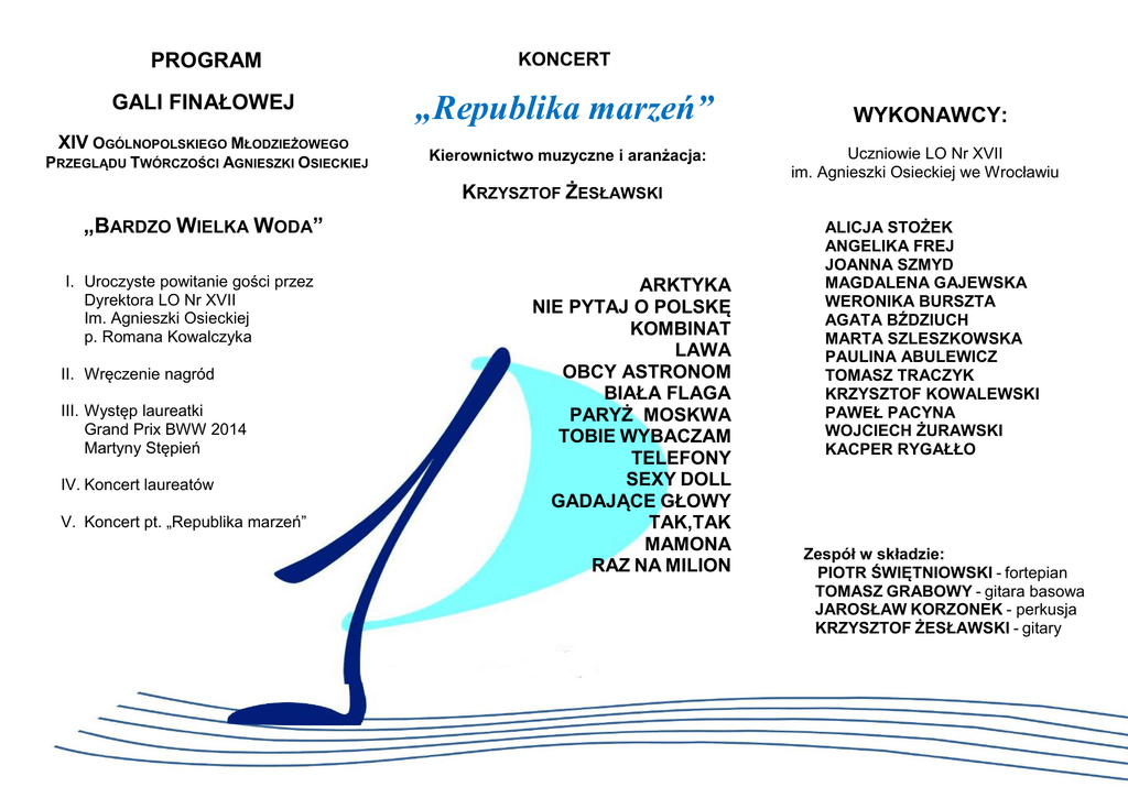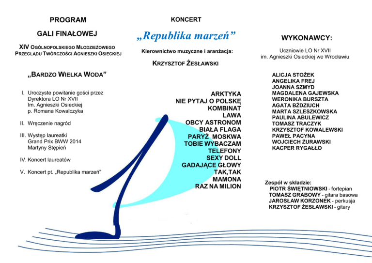 PROGRAM KONCERT GALI FINAŁOWEJ „Republika marzeń” XIV OGÓLNOPOLSKIEGO MŁODZIEŻOWEGO PRZEGLĄDU TWÓRCZOŚCI AGNIESZKI OSIECKIEJ Kierownictwo muzyczne i aranżacja: KRZYSZTOF ŻESŁAWSKI „BARDZO WIELKA WODA” I. Uroczyste powitanie gości przez Dyrektora LO Nr XVII Im. Agnieszki Osieckiej p. Romana Kowalczyka II. Wręczenie nagród III. Występ laureatki Grand Prix BWW 2014 Martyny Stępień IV. Koncert laureatów V. Koncert pt. „Republika marzeń” ARKTYKA NIE PYTAJ O POLSKĘ KOMBINAT LAWA OBCY ASTRONOM BIAŁA FLAGA PARYŻ MOSKWA TOBIE WYBACZAM TELEFONY SEXY DOLL GADAJĄCE GŁOWY TAK,TAK MAMONA RAZ NA MILION WYKONAWCY: Uczniowie LO Nr XVII im. Agnieszki Osieckiej we Wrocławiu ALICJA STOŻEK ANGELIKA FREJ JOANNA SZMYD MAGDALENA GAJEWSKA WERONIKA BURSZTA AGATA BŹDZIUCH MARTA SZLESZKOWSKA PAULINA ABULEWICZ TOMASZ TRACZYK KRZYSZTOF KOWALEWSKI PAWEŁ PACYNA WOJCIECH ŻURAWSKI KACPER RYGAŁŁO Zespół w składzie: PIOTR ŚWIĘTNIOWSKI - fortepian TOMASZ GRABOWY - gitara basowa JAROSŁAW KORZONEK - perkusja KRZYSZTOF ŻESŁAWSKI - gitary Wielka Woda SPONSORZY XIV OGÓLNOPOLSKI MŁODZIEŻOWY PRZEGLĄD słowa: Agnieszka Osiecka TWÓRCZOŚCI AGNIESZKI OSIECKIEJ Trzeba mi wielkiej wody, Tej dobrej i tej złej, Na wszystkie moje pogody ,Niepogody duszy mej. Trzeba mi wielkiej drogi Wśród wiecznie młodych bzów, Na wszystkie moje złe bogi , Niebogi z moich snów... organizowany przez Oceanów mrukliwych I strumieni życzliwych, Czarnych głębin niepewnych I opowieści rzewnych... Drogi białosrebrzystej, Dróżki nieuroczystej, Piachów siebie niepewnych I ptasich rozmów śpiewnych... Liceum Ogólnokształcące Nr XVII im. Agnieszki Osieckiej Centrum Kultury Wrocław- Zachód pod patronatem I tylko taką mnie ścieżką poprowadź, Gdzie śmieją się śmiechy w ciemności I gdzie muzyka gra, muzyka gra... Nie daj mi Boże, broń Boże skosztować Tak zwanej życiowej mądrości, Dopóki życie trwa, póki życie trwa... Trzeba mi wielkiej wody, Tej dobrej i tej złej, Na wszystkie moje pogody, Niepogody duszy mej Trzeba mi wielkiej psoty, Trzeba mi psoty, hej... Na wszystkie moje tęsknoty, Ochoty duszy mej. Prezydenta Wrocławia Rafała Dutkiewicza Gala Finałowa 27 marca 2015 PATRONAT MEDIALNY Centrum Kultury Wrocław-Zachód ul. Chociebuska 4-6, godz. 19.00 Wielkich wypraw pod Kraków, Nocnych rozmów rodaków, Wysokonogich lasów I bardzo dużo czasu...