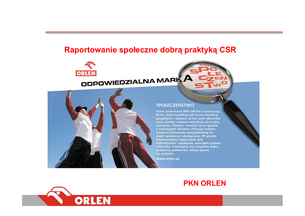 Raportowanie społeczne dobrą praktyką CSR PKN ORLEN Raportowanie społeczne w PKN ORLEN Cele: • Raportowanie jako integralna część strategii CSR Koncernu • Potwierdzenie transparentności firmy we wszystkich obszarach jej funkcjonowania • Odpowiedzialne kształtowanie relacji z interesariuszami (rzetelna komunikacja) • Wzmocnienie wizerunku Koncernu jako firmy odpowiedzialnej, prowadzącej otwarty dialog z otoczeniem ZałoŜenia: • Otwarty i przyjazny sposób komunikowania kwestii najbardziej istotnych z punktu widzenia interesariuszy • Wykorzystanie róŜnorodnych kanałów komunikacji • Szerokie gremium odbiorców • MoŜliwość informacji zwrotnej Ewolucja raportów społecznych PKN ORLEN • Raportowanie społeczne PKN ORLEN jest procesem, który podlega stałej ewaluacji. Pierwsze raporty Koncernu dotyczyły głównie zaangaŜowania społecznego, obecnie raportowany jest pełen zakres podejmowanych działań CSR skierowanych do szerokiego grona interesariuszy • Od 2008 roku raporty społeczne przygotowywane są w oparciu o międzynarodowe standardy GRI • Publikacje wydawane są w cyklu rocznym, prezentują zagadnienia i działania najwaŜniejsze dla Koncernu i jego interesariuszy w danym roku • Opracowanie dokumentu poprzedzają szerokie konsultacje, w które zaangaŜowane jest liczne grono interesariuszy Koncernu. Rezultatem dialogu jest zidentyfikowanie głównych – z punktu widzenia spółki i interesariuszy – zagadnień i problemów. Oceniona w ten sposób istotność poszczególnych kwestii zrównowaŜonego rozwoju i odpowiedzialnego biznesu ma istotny wpływ na zawartość raportu Raport prezentuje działania realizowane przez PKN ORLEN. Wybrane informacje o Grupie ORLEN mają za zadanie zaprezentować skalę jej działania i kierunki rozwoju • Wiarygodność i weryfikacja danych • Dane prezentowane w raportach pochodzą z systemów gwarantujących jakość i rzetelność gromadzonych informacji. NaleŜą do nich m.in.: • • system czasu rzeczywistego wspierającego procesy produkcyjne, połączony bezpośrednio z systemami automatyki przemysłowej hurtownia danych dla systemu zintegrowanego wykorzystywanego w PKN ORLEN, zawierająca dane o przebiegu i parametrach procesów produkcyjnych specjalizowany moduł systemu zintegrowanego wykorzystywanego w PKN ORLEN, słuŜący wsparciu obsługi procesów kadrowych, danych pracowników i współpracowników system do wspomagania audytu Galileo, który – obok gromadzenia informacji – pozwala równieŜ zarządzać audytem wewnętrznym oraz dokumentami roboczymi dane dotyczące ochrony środowiska, uzyskiwane dzięki stałemu monitorowaniu procesów produkcyjnych i technologicznych, prowadzonemu zgodnie z wdroŜonymi Systemami Zarządzania Dane finansowe pochodzą z jednostkowych sprawozdań finansowych za dany rok, podlegających badaniu przez niezaleŜnego biegłego rewidenta Treści zawarte w raportach bazują na procedurach i innych regulacjach wewnętrznych Koncernu 11 lat historii, 6 raportów społecznych Terminowość i cykliczność raportowania społecznego wyróŜnia Polski Koncern Naftowy ORLEN na polskim rynku 11 lat historii, 6 raportów społecznych 2002 Partnerstwo i odpowiedzialność „Naszą misją jest budowanie nowej równowagi pomiędzy wymiarem ekonomicznym, ekologicznym i społecznym” 2004 Odpowiedzialność społeczna Koncernu „Sukces gospodarczy Koncernu powinien łączyć się z troską o warunki Ŝycia i stan środowiska” 11 lat historii, 6 raportów społecznych 2005-2006 „Nasze zaangaŜowanie w budowanie równowagi pomiędzy interesem ekonomicznym, a wyzwaniami ekologicznymi i społecznymi (…) stanowi integralną część strategii Koncernu i zostało odzwierciedlone w wyznawanych przez nas wartościach dotyczących odpowiedzialności i poszanowania sąsiedztwa” 2007 „Zawsze, gdy nas potrzebujesz” WyróŜnienie w konkursie „Raporty społeczne 2008” za najlepiej sporządzony raport z zakresu społecznej odpowiedzialności biznesu w opinii internautów 11 lat historii, 6 raportów społecznych 2008 Zawsze, gdy nas potrzebujesz „DąŜąc do uzyskania pozycji regionalnego lidera, chcemy zapewnić naszym akcjonariuszom długofalowy wzrost wartości Firmy poprzez oferowanie naszym klientom najwyŜszej jakości produktów i usług. Jako Firma transparentna, wszelkie działania realizujemy z zachowaniem zasad ładu korporacyjnego i społecznej odpowiedzialności biznesu, troszcząc się o rozwój naszych pracowników i dbając o środowisko naturalne” • Raport zgodny ze standardami Global Reporting Initiatives (GRI G3) – odwołanie zarówno na poziomie liczby wskaźników, jak i kompletności tematów • Dwa wyróŜnienia w konkursie „Raporty Społeczne 2009” za najlepiej sporządzony raport z zakresu społecznej odpowiedzialności biznesu • Wpływ i oddziaływanie produktów PKN ORLEN na szeroko rozumiane otoczenie 11 lat historii, 6 raportów społecznych 2009 Odpowiedzialna marka „Zawsze, gdy nas potrzebujesz” • Raport sporządzony zgodnie z wytycznymi GRI G3, na poziomie B • Zintegrowanie (podobnie jak w roku 2008) kwestii społecznych i środowiskowych, dotychczas raportowanych odrębnie – moŜliwość porównań prezentowanych w kolejnych latach wskaźników • Prezentacja strategicznych, z punktu widzenia CSR, obszarów działania PKN OLREN Dlaczego warto raportować? Korzyści dla firmy • MoŜliwość podsumowania, oceny i weryfikacji podejmowanych oraz planowanych działań • Identyfikacja istotnych obszarów i elementów społecznej odpowiedzialności • MoŜliwość dialogu z interesariuszami zewnętrznymi i wewnętrznymi • Jawność i przejrzystość informacji - wzmocnienie wizerunku firmy odpowiedzialnej, rzetelnie komunikującej się z otoczeniem • Wzrost konkurencyjności i wartości firmy Korzyści dla interesariuszy • • • Szansa na lepsze poznanie firmy Uzyskanie wiarygodnego źródła informa