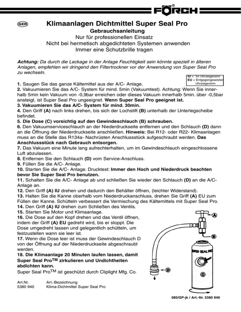 GER Klimaanlagen Dichtmittel Super Seal Pro Gebrauchsanleitung Nur für professionellen Einsatz Nicht bei hermetisch abgedichteten Systemen anwenden Immer eine Schutzbrille tragen Achtung: Da durch die Leckage in der Anlage Feuchtigkeit sein könnte speziell in älteren Anlagen, empfehlen wir dringend den Filtertrockner vor der Anwendung von Super Seal Pro zu wechseln. IU = Im Uhrzeigersinn EU = Entgegengesetzter Uhrzeigersinn 1. Saugen Sie das ganze Kältemittel aus der A/C- Anlage. 2. Vakuumieren Sie das A/C- System für mind. 5min (Vakuumtest). Achtung: Wenn Sie innerhalb 5min kein Vakuum von -0,9bar erreichen oder dieses Vakuum innerhalb 5min. über -0,5bar ansteigt, ist Super Seal Pro ungeeignet. Wenn Super Seal Pro geeignet ist. 3. Vakuumieren Sie das A/C- System für mind. 30min. 4. Den Griff (A) nach links drehen, bis sich der Lochstift (B) unterhalb der Unterlegscheibe befindet. 5. Die Dose (C) vorsichtig auf den Gewindeschlauch (B) schrauben. 6. Den Vakuumserviceschlauch an der Niederdruckseite entfernen und den Schlauch (D) dann an die Öffnung der Niederdruckseite anschließen. Hinweis: Bei R12- oder R22- Klimaanlagen muss an die Stelle das R134a- Nachrüsten Anschlussstück aufgeschraubt werden. Das Anschlussstück nach Gebrauch entsorgen. 7. Das Vakuum eine Minute lang aufrechterhalten, um im Gewindeschlauch eingeschlossene Luft abzulassen. 8. Entfernen Sie den Schlauch (D) vom Service-Anschluss. 9. Füllen Sie die A/C- Anlage. 10. Starten Sie die A/C- Anlage. Drucktest: Immer den Hoch und Niederdruck beachten bevor Sie Super Seal Pro benutzen. 11. Schalten Sie die A/C- Anlage ab und schließen Sie wieder den Schlauch (D) an die A/CAnlage an. 12. Den Griff (A) IU drehen und dadurch den Behälter öffnen, (leichter Widerstand). 13. Halten Sie die Kanne oberhalb vom Niederdruckanschluss, drehen Sie Griff (A) EU zum Füllen der Kanne. Schütteln verbessert die Vermischung des Kältemittels mit Super Seal Pro. 14. Den Griff (A) IU drehen zum Schließen des Ventils. 15. Starten Sie Motor und Klimaanlage. 16. Die Dose auf den Kopf drehen und das Ventil öffnen, indem der Griff (A) EU gedreht wird, bis er stoppt. Die Dose umgedreht lassen und gelegentlich schütteln, um festzustellen wann sie leer ist. 17. Wenn die Dose leer ist muss der Gewindeschlauch D von der Öffnung auf der Niederdruckseite abgeschraubt werden. 18. Die Klimaanlage 20 Minuten laufen lassen, damit Super Seal ProTM zirkulieren und Undichtheiten abdichten kann. Super Seal ProTM ist geschützt durch Cliplight Mfg. Co. Art.Nr. 5380 940 Art.-Bezeichnung Klima-Dichtmittel Super Seal Pro 085/GP-jk / Art.-Nr. 5380 940 CZE Těsnicí prostředek na klimatizace Super Seal Pro Návod k použití Pouze pro profesionální použití Nepoužívejte u hermeticky utěsněných systémů Při práci vždy noste ochranné brýle Upozornění: Protože při netěsnosti v klimatizaci může být obzvláště ve starším systému vlhko, naléhavě doporučujeme před použitím prostředku Super Seal Pro vyměnit filtr-sušič. VH = ve směru hodinových ručiček PH = proti směru hodinových ručiček 1. Odsajte ze systému A/C všechnu chladicí kapalinu. 2. Vakuujte systém A/C po dobu min. 5 min. (vakuový test). Upozornění: Pokud do 5 min. nedosáhnete vakua -0,9 bar nebo toto vakuum do 5 min. stoupne nad -0,5 bar, je Super Seal Pro nevhodný. Když je Super Seal Pro vhodný: 3. Vakuujte systém A/C po dobu min. 30 min. 4. Otáčejte držadlem (A) doleva, až se bude kolík (B) nacházet pod podložkou. 5. Našroubujte opatrně nádobku (C) na hadici se závitem (B). 6. Na nízkotlaké straně odpojte vakuovou servisní hadici a potom do otvoru na této straně zapojte hadici (D). Poznámka: U klimatizací R12 nebo R22 se na toto místo musí našroubovat propojovací kus R134a (dodatečná výbava). Po použití propojovací kus zlikvidujte. 7. Po dobu jedné minuty udržujte vakuum, abyste z hadice se závitem vypustili vzduch. 8. Odpojte hadici (D) od servisní přípojky. 9. Naplňte systém A/C. 10. Spusťte systém A/C. Tlaková zkouška: Vždy před použitím prostředku Super Seal Pro zkontrolujte vysoký a nízký tlak. 11. Vypněte systém A/C a připojte k němu opět hadici (D). 12. Otevřete nádobku otočením držadla (A) VH (lehký odpor). 13. Podržte nádržku nad nízkotlakou přípojkou a otočte držadlem (A) PH, abyste nádržku naplnili. Zatřesením zlepšíte promíchání chladicího média a prostředku Super Seal Pro. 14. Zavřete ventil otočením držadla (A) VH. 15. Spusťte motor a klimatizaci. 16. Otočte nádobku vzhůru dnem a otevřete ventil otočením držadla (A) PH až na doraz. Nechte nádobku převrácenou a občas jí zatřeste, abyste zjistili, kdy bude prázdná. 17. Po vyprázdnění nádobky se hadice se závitem (D) musí vyšroubovat z otvoru na nízkotlaké straně. 18. Nechte běžet klimatizaci 20 minut, aby prostředek Super Seal ProTM mohl cirkulovat a utěsnit netěsnosti. Super Seal ProTM je chráněn společností Cliplight Mfg. Co. Číslo výr. 5380 940 Označení výrobku Těsnicí prostředek na klimatizace Super Seal Pro 2 DAN Klimaanlægs tætningsmiddel Super Seal Pro Brugsanvisning Kun til professionel brug Må ikke anvendes ved hermetisk tætnede systemer Brug altid beskyttelsesbriller Advarsel: Da der gennem lækager kan komme fugt i anlægget specielt i gamle anlæg, anbefaler vi indtrængende at filtertøreren skiftes inden anvendelse af Super Seal Pro IU = med uret 1. Sug alt kølemiddel ud af A/C- anlægget. EU = mod uret 2. Vakuumer A/C- systemet i mindst 5min (Vakuumtest). Advarsel: når du inden for 5 min. ingen vakuum fra -0,9bar opnår eller dette vakuum inden for 5min. overstiger -0,5bar, er Super Seal Pro uegnet. Når Super Seal Pro er egnet. 3. Vakuumer A/C- System i mindst 30min. 4. Drej håndtaget (A) mod venstre, til hulstiften (B) befinder sig nedenfor skiven. 5. Skru forsigtigt dåsen (C) på gevindslangen (B). 6. Vakuumserviceslangen fjer