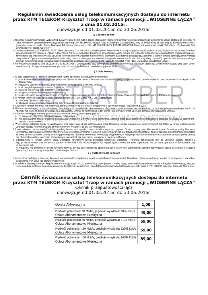 Regulamin świadczenia usług telekomunikacyjnych dostepu do internetu przez KTM TELEKOM Krzysztof Trzop w ramach promocji „WIOSENNE ŁĄCZA” z dnia 01.03.2015r. obowiązuje od 01.03.2015r. do 30.06.2015r. § 1 Zasady ogólne 1. Niniejszy Regulamin Promocji „WIOSENNE ŁĄCZA” z dnia 01.03.2015 r. (dalej „Regulamin Promocji”) określa warunki promocyjnego świadczenia usługi dostępu do internetu na rzecz Abonentów usług telekomunikacyjnych przez firmę KTM TELEKOM Krzysztof Trzop z siedzibą w Czarnej Górze, przy ul. Podgórskiej 15 wpisanej do Ewidencji Działalności Gospodarczej przez wójta Gminy Bukowina Tatrzańska pod nr-em 41/06, NIP 734-251-48-75, REGON 120267368, która jest właścielem marki “TatraFiber - Podhalańska Sieć Światłowodowa” (dalej „Operator”) 2. Z niniejszej Promocji „WIOSENNE ŁĄCZA” (dalej „Promocja”) na warunkach określonych w Regulaminie Promocji mogą skorzystać osoby fizyczne, osoby fizyczne prowadzące działalność gospodarczą zgodnie z ustawą z dnia 2 lipca 2004 r. o swobodzie działalności gospodarczej, osoby prawne lub jednostki organizacyjne nieposiadające osobowości prawnej zamieszkałe, lub chcące korzystać z usługi na terenie na którym Opeartor ma możliwości techniczne świadczenia usługi (dalej „Abonenci”), które w okresie obowiązywania Promocji będą zawierać Operatorem umowę o świadczenie usług telekomunikacyjnych w zakresie dostępu do Internetu w formie pisemnej (dalej „Umowa”), zgodnie z obowiązującym Regulaminem świadczenia usług telekomunikacyjnych dostępu do Internetu przez firmę KTM TELEKOM Krzysztof Trzop (dalej „Regulamin świadczenia Usług”). 3. Promocja obowiązuje od dnia 01.03.2015 r. do 30.06.2015 r. Operator zastrzega sobie prawo do odwołania Promocji w każdym czasie bez podawania przyczyn, przy czym odwołanie Promocji nie wpływa na prawa nabyte przez uczestników Promocji przed dniem jej odwołania. § 2 Opis Promocji 1. W celu skorzystania z Promocji konieczne jest łączne spełnienie następujących warunków: a. przedłożenie dokumentów wymaganych przez Operatora do zawarcia Umowy oraz wyrażenie zgody na sporządzenie i przechowywanie przez Operatora kserokopii tychże dokumentów; b. pozytywna ocena wiarygodności płatniczej osoby ubiegającej się o zawarcie Umowy; c. brak zaległości płatniczych wobec Operatora; d. zawarcie Umowy na czas określony - 24 miesięcy; e. akceptacja warunków niniejszego Regulaminu; f. wyrażenie zgody na wystawianie oraz przesyłanie drogą elektroniczną przez Operatora obrazu dokumentów rozliczeniowych lub faktur w formie elektronicznej. 2. W ramach Promocji osoba spełniająca warunki opisane w § 1 ust 2 oraz w § 2 ust. 1, otrzymuje: a. obniżoną Opłatę aktywacyjną; b. obniżoną Opłatę abonamentową przez czas trwania Okresu abonamentowego; 3. Abonent w ramach Promocji ma możliwość zawarcia Umowy na warunkach określonych w cenniku promocji “WIOSENNE ŁĄCZA” 4. Umowa zawierana jest na czas określony - 24 miesięcy. Po wygaśniećiu okresu umowy, ulega ona przedłużeniu na czas nieokreślony, na tych samych warunkach cenowych o ile Abonent nie złoży na piśmie oświadczenia o rozwiązaniu umowy co najmniej na jeden Okres Rozliczeniowy przed upływem terminu obowiązywania umowy. 5. Abonent zawierający Umowę, przez cały czas trwania Umowy, obowiązany jest do: a. terminowego uiszczania należności na rzecz Operatora; b. nie dokonywania zmiany prędkości na niższą niż wybrana w Umowie w czsie jej trwania. Abonent może bez dodatkowych opłat zmienić prędkośc na wyższą w każdym momencie trwania umowy. 6. W przypadku cofnięcia zgody na wystawianie oraz przesyłanie drogą elektroniczną przez Operatora obrazu dokumentów rozliczeniowych lub faktur w formie elektronicznej, Operator obciąży Abonenta Opłatą abonamentową w wysokości 19 zł z VAT/miesięcznie 7. Z zastrzeżeniem postanowień § 3 niniejszego Regulaminu, w przypadku rozwiązania Umowy przed upływem Okresu Umowy przez Abonenta lub przez Operatora z winy Abonenta, Operatorowi przysługuje roszczenie z tego tytułu w wysokości określonej w Umowie jako równowartość ulgi przyznanej Abonentowi, pomniejszonej o proporcjonalną jej wartość za okres od dnia zawarcia Umowy do dnia jej rozwiązania. Żądanie zwrotu ulgi nie dotyczy przypadków, w których przepisy prawa uprawniają Abonenta do rozwiązania Umowy bez obowiązku zapłaty roszczenia stanowiącego ekwiwalent ulgi przyznanej w związku z zawarciem Umowy. 8. Udostępniony w ramach Umowy przez Operatora Abonentowi sprzęt pozostaje własnością Operatora i Abonent zobowiązany jest do używania sprzętu zgodnie z jego przeznaczeniem oraz do zwrotu sprzętu w terminie 7 dni od rozwiązania lub wygaśnięcia Umowy, na adres Operatora, lub do biura operatora w Zakopanem przy ul. Kościuszki 2/8. W przypadku nie dotrzymania przez Abonenta terminu zwrotu udostępnionego sprzętu lub jego utraty albo uszkodzenia, Abonent zobowiązany będzie do zapłaty, na żądanie Operatora, kary umownej w wysokości określonej w Cenniku. § 3 Postanowienia końcowe 1. Abonent korzystający z niniejszej Promocji ma możliwość korzystania z innych usług lub ofert promocyjnych Operatora, chyba, że co innego wynika ze szczególnych warunków świadczenia tych usług lub ofert promocyjnych. 2. W zakresie nieuregulowanym Regulaminem Promocji, w tym w zakresie definicji pojęć pisanych wielką literą, a nie zdefiniowanych odmiennie w Regulaminie Promocji, zastosowanie znajdują postanowienia obowiązującego Regulaminu świadczenia Usług telekomunikacyjnych dostępu do Internetu przez KTM TELEKOM Krzysztof Trzop dla Abonentów. Cennik świadczenia usług telekomunikacyjnych dostepu do internetu przez KTM TELEKOM Krzysztof Trzop w ramach promocji „WIOSENNE ŁĄCZA” Cennik przepustowości łącz obowiązuje od 01.03.2015r. do 30.06.2015r. Opłata Aktywacyjna 1,00
