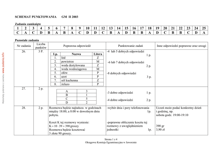 SCHEMAT PUNKTOWANIA GM II 2003 Zadania zamknięte 1 C 2 A 3 C 4 D Pozostałe zadania Liczba Nr zadania punktów 26. 3 P. 27. 28. 2 p. 2 p. 5 B 6 A 7 B 8 A 9 C 10 D 11 D 12 C Poprawna odpowiedź Lp. 1. 2. 3. 4. 5. 6. 7. 8. Nazwa lód powietrze woda destylowana woda wodociągowa ołów azot sól kuchenna żelazo A B C D 13 B 14 A 15 D 16 B 17 B 18 A Punktowanie zadań Litera Z M Z M P P Z P 3 1 5 2 19 D 20 C 21 B 22 B 23 C 24 D Inne odpowiedzi poprawne oraz uwagi -4 lub 5 dobrych odpowiedzi 1 p. -6 lub 7 dobrych odpowiedzi 2 p. -8 dobrych odpowiedzi 3 p. -3 dobre odpowiedzi 1 p. -4 dobre odpowiedzi 2 p. Rozmowa będzie najtańsza w godzinach między 18:00, a 8:00 w dowolnym dniu pobytu. -wybór dnia i pory telefonowania 1p. Koszt K tej rozmowy wyniesie: K = 10 ⋅ 39 = 390 groszy Rozmowa będzie kosztować 3 złote 90 groszy. -poprawne obliczenie kosztu tej rozmowy z uwzględnieniem jednostki 1p. Strona 1 z 4 Okręgowa Komisja Egzaminacyjna w Jaworznie 25 A Uczeń może podać konkretny dzień i godzinę, np. sobota godz. 19:00-19:10 390 gr 3,90 zł 29. 1 p. pomidory -poprawna odpowiedź 1 p. 30. 1 p. pomidory -poprawna odpowiedź 1 p. 31. 2 p. s f o -dodrze zaznaczony odcinek przedstawiający zakres tolerancji pH sałaty 1 p. p 1 32. 2 3 4 2 p. 2 2s at ⇒ a= 2 t 2 po przekształceniu: 2 ⋅ 1m a= = 2 m / s2 2 1s s= droga po 3 sekundach: 2 m / s2 ⋅ 9 s2 s= = 9m 2 5 6 7 8 pH -obliczenie przyspieszenia z uwzględnieniem jednostki 1p. -obliczenie drogi po 3 sekundach i prawidłowe wpisanie go do tabeli 1 p. -jeśli droga obliczona jest bez jednostki, ale wynik prawidłowo wpisany do tabeli 1 p. -jeżeli droga obliczona jest prawidłowo i wyrażona z jednostką, ale nie zapisana do tabeli 1p -jeśli droga obliczona jest bez jednostki, i wynik nie wpisany do tabeli 0 p. Strona 2 z 4 Okręgowa Komisja Egzaminacyjna w Jaworznie at 2 2 po podstawieniu danych: a ⋅1 1= ⇒ a = 2 m / s2 2 droga po 3 sekundach: 2⋅ 9 s= = 9m 2 lub obliczenie drogi według zasady: s 01 : s 02 : s 03 : ... : s0 n = 12 : 2 2 : 32 : ... : n 2 s= s 03 = 32 = 9m 33. 1 p. -poprawnie narysowany wykres 1 p. s [m] s [m] 8 8 6 6 4 4 2 2 0 34. 2 p. s= t= 35. 2 p. 0 1 2 3 4 2s at 2 ⇒ t2 = ⇒ t= a 2 5 6 2s a 2 ⋅ 100 m = 100 s 2 = 10 s 2 m / s2 m – masa srebra 12 g – 100 % m – 92,5 % 12 ⋅ 92,5 m= = 11,1 g 100 Naszyjnik zawiera 11,1 g srebra. t[s] 1 2 3 4 5 6 t[s] -jeżeli w wyniku błędu w obliczeniach uczeń narysuje konsekwentnie wykres funkcji rosnącej 1 p. -poprawna metoda obliczanie czasu potrzebnego na pokonanie 100 m drogi 1 p. -poprawny wynik z jednostką 1 p. -poprawna metoda obliczania masy srebra 1 p. -poprawny wynik z jednostką 1 p. Strona 3 z 4 Okręgowa Komisja Egzaminacyjna w Jaworznie s= at 2 2 2 m / s2 ⋅ t 2 ⇒ t 2 = 100 2 t = 100 = 10 s 100 m = x – masa srebra x = 92,5% ⋅ 12 x = 0,925 ⋅ 12 x = 11,1 g lub 1000 g – 925 g 12 g – x 12 ⋅ 925 x= = 11,1 g 1000 36. 37. 3 p. 6 p. P – suma mocy urządzeń: P = 2200 + 1710 = 3910 W P =U ⋅I P 3910 = 17 A I= = U 230 I >16 A Wniosek: Bezpiecznik nie wytrzyma obciążenia 17 A. Opis niewiadomych: x – cena biletu za wypożyczenie kajaka na jedną godzinę y – cena biletu za wypożyczenie żaglówki na jedną godzinę -poprawna metoda obliczania natężenia prądu 1 p. 2200 + 1710 = 17 A 230 -poprawny wynik z jednostką 1 p. lub -sformułowanie wniosku 3910 = 17 A 230 1 p. Punktacja rozwiązania za pomocą Opis niewiadomych: x – cena biletu za wypożyczenie układu równań: -opis niewiadomych 1 p. żaglówki na jedną godzinę 0,6 x – cena biletu za wypożyczenie -ułożenie układu równań 2 p. kajaka na jedną godzinę (za każde poprawnie ułożone równanie po 1 p.) ⎧18 x + 8 y = 188 ⎨ ⎩ 0,6 y = x po podstawieniu za x: -poprawna metoda rozwiązywania układu równań 1 p. -poprawne rozwiązanie układu i udzielenie odpowiedzi 1 p. 18 ⋅ 0,6 y + 8 y = 188 10,8 y + 8 y = 188 Punktacja rozwiązania za pomocą równania: -opis niewiadomej 1 p. 18,8 y = 188 y = 10 zł x = 0,6 ⋅ 10 = 6 zł Odp.: Jedna godzina pływania kajakiem kosztuje 6 zł, a jedna godzina pływania żaglówką 10 zł. -ustalenie związku miedzy czasem pływania kajakiem i żaglówką a ceną 1 p. -ułożenie równania 1 p. -poprawna metoda rozwiązania równania 1 p. -poprawne obliczenia Strona 4 z 4 Okręgowa Komisja Egzaminacyjna w Jaworznie 1 p. 8 x + 18 ⋅ 0,6 x = 188 po rozwiązaniu równania: x = 10 zł 0,6 x = 0,6 ⋅ 10 = 6 zł Odp. jak w metodzie układu równań.