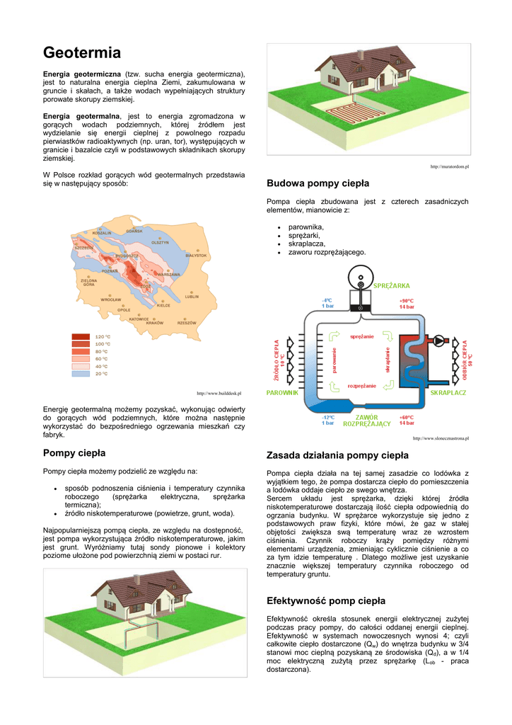 Geotermia Energia geotermiczna (tzw. sucha energia geotermiczna), jest to naturalna energia cieplna Ziemi, zakumulowana w gruncie i skałach, a także wodach wypełniających struktury porowate skorupy ziemskiej. Energia geotermalna, jest to energia zgromadzona w gorących wodach podziemnych, której źródłem jest wydzielanie się energii cieplnej z powolnego rozpadu pierwiastków radioaktywnych (np. uran, tor), występujących w granicie i bazalcie czyli w podstawowych składnikach skorupy ziemskiej. http://muratordom.pl W Polsce rozkład gorących wód geotermalnych przedstawia się w następujący sposób: Budowa pompy ciepła Pompa ciepła zbudowana jest z czterech zasadniczych elementów, mianowicie z: parownika, sprężarki, skraplacza, zaworu rozprężającego. http://www.builddesk.pl Energię geotermalną możemy pozyskać, wykonując odwierty do gorących wód podziemnych, które można następnie wykorzystać do bezpośredniego ogrzewania mieszkań czy fabryk. http://www.slonecznastrona.pl Pompy ciepła Zasada działania pompy ciepła Pompy ciepła możemy podzielić ze względu na: Pompa ciepła działa na tej samej zasadzie co lodówka z wyjątkiem tego, że pompa dostarcza ciepło do pomieszczenia a lodówka oddaje ciepło ze swego wnętrza. Sercem układu jest sprężarka, dzięki której źródła niskotemperaturowe dostarczają ilość ciepła odpowiednią do ogrzania budynku. W sprężarce wykorzystuje się jedno z podstawowych praw fizyki, które mówi, że gaz w stałej objętości zwiększa swą temperaturę wraz ze wzrostem ciśnienia. Czynnik roboczy krąży pomiędzy różnymi elementami urządzenia, zmieniając cyklicznie ciśnienie a co za tym idzie temperaturę . Dlatego możliwe jest uzyskanie znacznie większej temperatury czynnika roboczego od temperatury gruntu. sposób podnoszenia ciśnienia i temperatury czynnika roboczego (sprężarka elektryczna, sprężarka termiczna); źródło niskotemperaturowe (powietrze, grunt, woda). Najpopularniejszą pompą ciepła, ze względu na dostępność, jest pompa wykorzystująca źródło niskotemperaturowe, jakim jest grunt. Wyróżniamy tutaj sondy pionowe i kolektory poziome ułożone pod powierzchnią ziemi w postaci rur. Efektywność pomp ciepła Efektywność określa stosunek energii elektrycznej zużytej podczas pracy pompy, do całości oddanej energii cieplnej. Efektywność w systemach nowoczesnych wynosi 4; czyli całkowite ciepło dostarczone (Qw) do wnętrza budynku w 3/4 stanowi moc cieplną pozyskaną ze środowiska (Qd), a w 1/4 moc elektryczną zużytą przez sprężarkę (Lob - praca dostarczona).