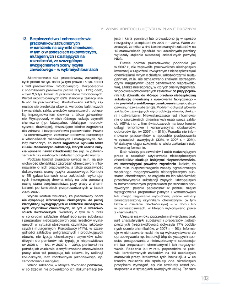 V. WYNIKI KONTROLI UJĘTYCH W PLANIE ROCZNYM 13. Bezpieczeństwo i ochrona zdrowia pracowników zatrudnionych w narażeniu na czynniki chemiczne, w tym o własnościach rakotwórczych, mutagennych i działających na rozrodczość, ze szczególnym uwzględnieniem oceny ryzyka zawodowego – w wybranych branżach Skontrolowano 431 pracodawców, zatrudniających ponad 40 tys. osób (w tym prawie 16 tys. kobiet i 148 pracowników młodocianych). Bezpośrednio z chemikaliami pracowało prawie 9 tys. (17%) osób, w tym 2,5 tys. kobiet i 5 pracowników młodocianych. Wśród skontrolowanych 62% stanowiły zakłady małe (do 49 pracowników). Kontrolowano zakłady zajmujące się produkcją obuwia, wyrobów kaletniczych i rymarskich, szkła, wyrobów ceramicznych, poligrafią, impregnowaniem drewna, a także galwanizernie. Występowały w nich różnego rodzaju czynniki chemiczne (np. łatwopalne, działające neurotoksycznie, drażniące), stwarzające istotne zagrożenia dla zdrowia i bezpieczeństwa pracowników. Prawie 1/3 kontrolowanych zakładów stosowała substancje o własnościach rakotwórczych i mutagennych. Należy zaznaczyć, że istota zagrożenia wynikała także z ilości stosowanych substancji, których roczne zużycie wynosiło nawet kilkadziesiąt ton (np. w galwanizerniach czy niektórych zakładach poligraficznych). Podczas kontroli zwracano uwagę m.in. na prawidłowość identyfikacji zagrożeń chemicznych, informowanie o nich pracowników, a także poprawność dokonywania oceny ryzyka zawodowego. Kontrole w 56 galwanizerniach oraz zakładach wykonujących impregnację drewna miały na celu ponowną ocenę stanu bezpieczeństwa przy pracy z chemikaliami, po kontrolach przeprowadzonych w latach 2006–2007. Wyniki kontroli wskazują, że pracodawcy nadal nie dysponują informacjami niezbędnymi do pełnej identyfikacji występujących w zakładzie niebezpiecznych czynników chemicznych, w tym o właściwościach rakotwórczych. Świadczy o tym m.in. brak w co drugim zakładzie aktualnego spisu substancji i preparatów niebezpiecznych oraz rejestrów wymaganych w sytuacji stosowania czynników rakotwórczych i mutagennych. Pracodawcy (41%), w szczególności zakładów poligraficznych i produkujących obuwie, nie typują chemicznych czynników szkodliwych do pomiarów lub typują je nieprawidłowo (w 2006 r. – 18%, w 2007 r. – 30%), ponieważ nie potrafią ich właściwie identyfikować na stanowiskach pracy, albo też postępują tak celowo, by uniknąć koniecznych, lecz kosztownych przedsięwzięć, np. zamontowania wentylacji. Wśród zakładów, w których dokonano pomiarów, w co trzecim nie prowadzono ich dokumentacji (re- jestr i karta pomiaru) lub prowadzono ją w sposób niezgodny z przepisami (w 2007 r. – 20%). Warto zaznaczyć, że tylko w 4% kontrolowanych zakładów na 13 stanowiskach (spośród 751 ocenianych) pomiary wykazały stężenie substancji szkodliwych powyżej NDS. Prawie połowa pracodawców, podobnie jak w 2007 r., nie zapewniła pracownikom niezbędnych informacji o zagrożeniu związanym z niebezpiecznymi chemikaliami, w tym o działaniu rakotwórczym i mutagennym, m.in. nie oznakowano znakami ostrzegawczymi magazynów (bądź oznakowano nieprawidłowo), a także miejsc pracy, w których one występowały. W połowie kontrolowanych zakładów co piąty pojemnik lub zbiornik, do którego przelano niebezpieczną substancję chemiczną z opakowania fabrycznego – nie posiadał prawidłowego oznakowania (znak ostrzegawczy, nazwa substancji). Problem dotyczył głównie zakładów zajmujących się produkcją obuwia, drukarni i galwanizerni. Niewystarczające jest informowanie o zagrożeniach chemicznych osób spoza zakładu (60%), np. z firm świadczących na jego terenie usługi remontowe i konserwacyjne; dostawców; odbiorców itp. (w 2007 r. – 51%). Ponadto nie informowano pracowników o sposobie postępowania w sytuacjach awaryjnych (33%, w 2007 r. – 20%). W dalszym ciągu szkolenia w wielu zakładach traktowane są formalnie. Brak wiedzy pracowników i osób nadzorujących prace o zasadach użytkowania niebezpiecznych chemikaliów skutkuje kolejnymi nieprawidłowościami stwarzającymi poważne zagrożenia. Należą do nich m.in. nieprzestrzeganie zasady ograniczonego wspólnego magazynowania niebezpiecznych substancji chemicznych, ze względu na ich właściwości; przechowywanie substancji żrących, łatwopalnych w nieoznakowanych pojemnikach po środkach spożywczych; palenie papierosów w pobliżu miejsc występowania preparatów palnych i wybuchowych lub miejsc zagrożenia wybuchem; pranie odzieży zanieczyszczonej czynnikami chemicznymi (w tym także o działaniu rakotwórczym) – w domu lub w pomieszczeniach, w których wykonywano prace z chemikaliami. Częściej niż w roku poprzednim stwierdzano brak kart charakterystyki substancji i preparatów niebezpiecznych (nieprawidłowość dotyczyła 17% poddanych ocenie chemikaliów, w 2007 r. – 9%). Informacje w nich zawarte nadal nie są wykorzystywane do opracowywania np. instrukcji bhp dotyczących sposobu postępowania z niebezpiecznymi substancjami lub preparatami chemicznymi i ich magazynowania. Podobnie jak w roku poprzednim, w połowie kontrolowanych zakładów, na 1/3 ocenianych stanowisk pracy, brakowało tych instrukcji, a w co trzecim zakładzie nie spełniały one określonych przepisami wymagań, np. nie zawierały zasad postępowania w sytuacjach awaryjnych (33%). Ten sam 103 SPRAWOZDANIE GIP Z DZIAŁALNOŚCI PIP W 2008 r. problem dotyczy instrukcji składowania, załadunku oraz transportu substancji i preparatów niebezpiecznych. Brak udokumentowanej oceny ryzyka zawodowego stwierdzono w 20% kontrolowanych zakładów (w 2006 r. – 14%, w 2007 r. – 22%). Nieprawidłowość dotyczyła 13% ocenianych stanowisk pracy (w 2007 r. – 12%). Podkreślić należy, że nadal w 2/3 kontrolowanych zakładów ocena ta, dla ponad połowy stanowisk pracy, dokonywana był