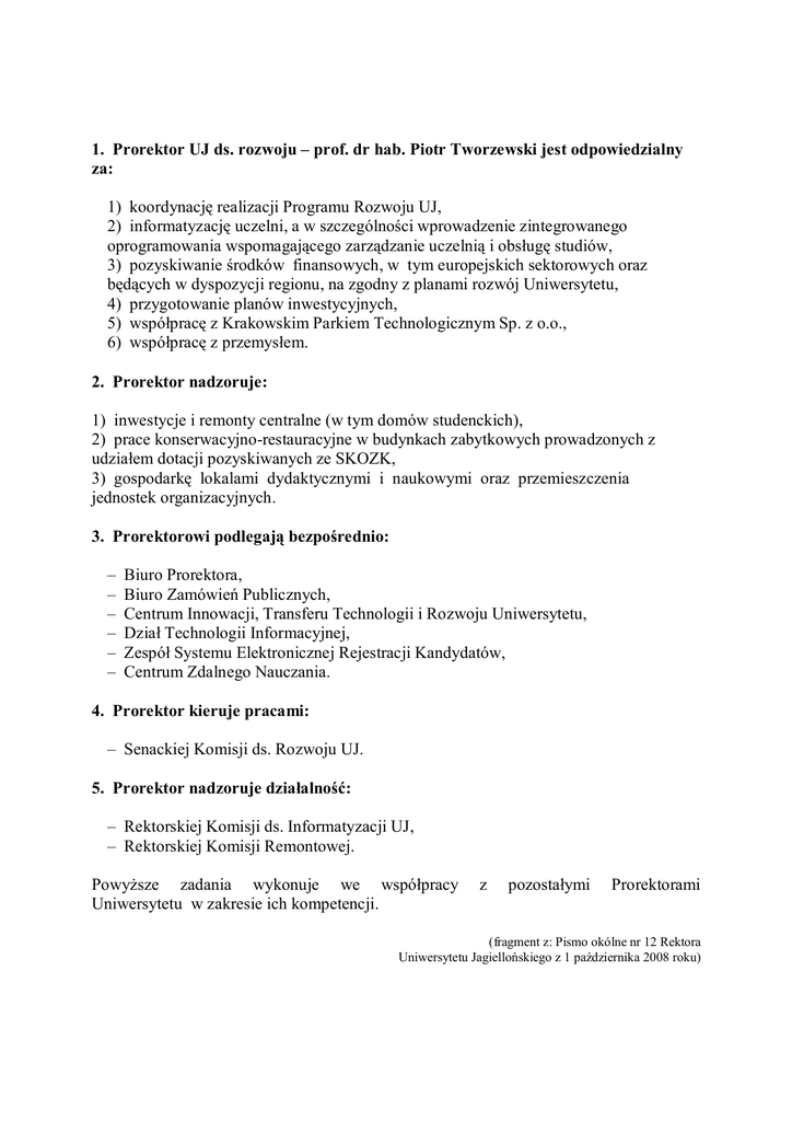 1. Prorektor UJ ds. rozwoju – prof. dr hab. Piotr Tworzewski jest odpowiedzialny za: 1) koordynację realizacji Programu Rozwoju UJ, 2) informatyzację uczelni, a w szczególności wprowadzenie zintegrowanego oprogramowania wspomagającego zarządzanie uczelnią i obsługę studiów, 3) pozyskiwanie środków finansowych, w tym europejskich sektorowych oraz będących w dyspozycji regionu, na zgodny z planami rozwój Uniwersytetu, 4) przygotowanie planów inwestycyjnych, 5) współpracę z Krakowskim Parkiem Technologicznym Sp. z o.o., 6) współpracę z przemysłem. 2. Prorektor nadzoruje: 1) inwestycje i remonty centralne (w tym domów studenckich), 2) prace konserwacyjno-restauracyjne w budynkach zabytkowych prowadzonych z udziałem dotacji pozyskiwanych ze SKOZK, 3) gospodarkę lokalami dydaktycznymi i naukowymi oraz przemieszczenia jednostek organizacyjnych. 3. Prorektorowi podlegają bezpośrednio: – – – – – – Biuro Prorektora, Biuro Zamówień Publicznych, Centrum Innowacji, Transferu Technologii i Rozwoju Uniwersytetu, Dział Technologii Informacyjnej, Zespół Systemu Elektronicznej Rejestracji Kandydatów, Centrum Zdalnego Nauczania. 4. Prorektor kieruje pracami: – Senackiej Komisji ds. Rozwoju UJ. 5. Prorektor nadzoruje działalność: – Rektorskiej Komisji ds. Informatyzacji UJ, – Rektorskiej Komisji Remontowej. Powyższe zadania wykonuje we współpracy Uniwersytetu w zakresie ich kompetencji. z pozostałymi Prorektorami (fragment z: Pismo okólne nr 12 Rektora Uniwersytetu Jagiellońskiego z 1 października 2008 roku)