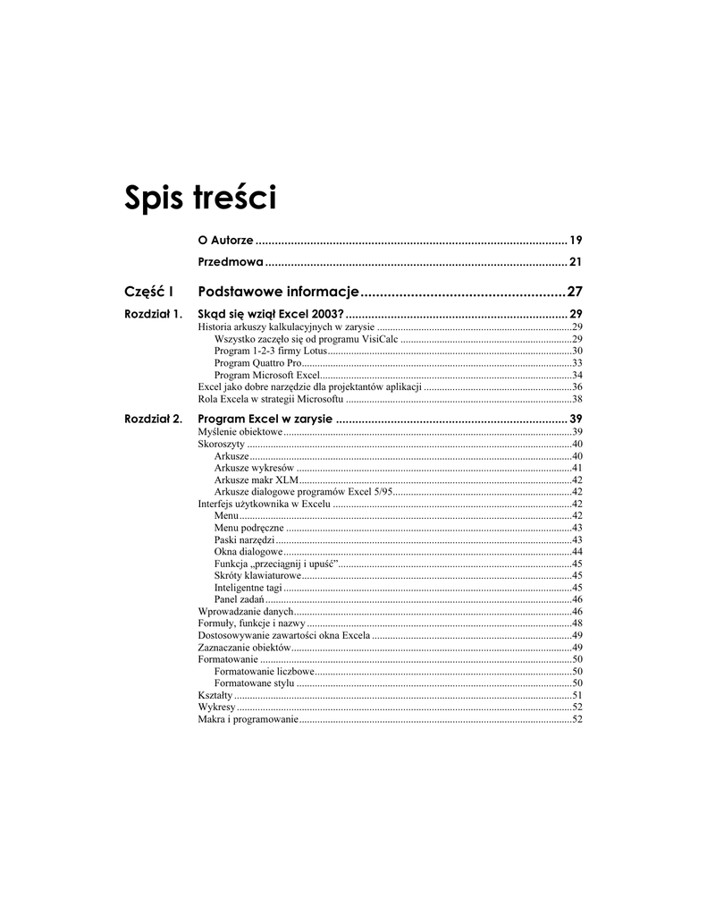 5RKUVTGħEK ! Historia arkuszy kalkulacyjnych w zarysie ...........................................................................29 Wszystko zaczęło się od programu VisiCalc ..................................................................29 Program 1-2-3 firmy Lotus..............................................................................................30 Program Quattro Pro........................................................................................................33 Program Microsoft Excel.................................................................................................34 Excel jako dobre narzędzie dla projektantów aplikacji .........................................................36 Rola Excela w strategii Microsoftu .......................................................................................38 "# Myślenie obiektowe ...............................................................................................................39 Skoroszyty .............................................................................................................................40 Arkusze............................................................................................................................40 Arkusze wykresów ..........................................................................................................41 Arkusze makr XLM.........................................................................................................42 Arkusze dialogowe programów Excel 5/95.....................................................................42 Interfejs użytkownika w Excelu ............................................................................................42 Menu................................................................................................................................42 Menu podręczne ..............................................................................................................43 Paski narzędzi ..................................................................................................................43 Okna dialogowe...............................................................................................................44 Funkcja „przeciągnij i upuść”..........................................................................................45 Skróty klawiaturowe........................................................................................................45 Inteligentne tagi ...............................................................................................................45 Panel zadań ......................................................................................................................46 Wprowadzanie danych...........................................................................................................46 Formuły, funkcje i nazwy ......................................................................................................48 Dostosowywanie zawartości okna Excela .............................................................................49 Zaznaczanie obiektów............................................................................................................49 Formatowanie ........................................................................................................................50 Formatowanie liczbowe...................................................................................................50 Formatowane stylu ..........................................................................................................50 Kształty ..................................................................................................................................51 Wykresy .................................................................................................................................52 Makra i programowanie.........................................................................................................52 4 Excel 2003 PL. Programowanie w VBA. Vademecum profesjonalisty Dostęp do bazy danych ..........................................................................................................53 Arkuszowe bazy danych..................................................................................................53 Zewnętrzne bazy danych .................................................................................................55 Funkcje internetowe...............................................................................................................55 Funkcje związane z językiem XML ......................................................................................56 Narzędzia analizy...................................................................................................................56 Konspekty........................................................................................................................56 Automatyczne sumy częściowe.......................................................................................56 Dodatek Analysis ToolPak ..............................................................................................56 Tabele przestawne ...........................................................................................................57 Dodatek Solver ................................................................................................................58 Dodatki...................................................................................................................................58 Zgodność wersji.....................................................................................................................58 Opcje ochrony........................................................................................................................58 Ochron