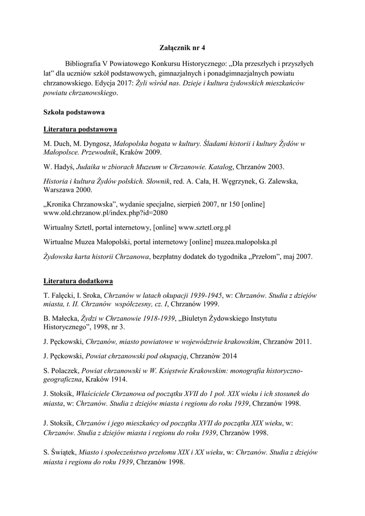 Załącznik nr 4 Bibliografia V Powiatowego Konkursu Historycznego: „Dla przeszłych i przyszłych lat” dla uczniów szkół podstawowych, gimnazjalnych i ponadgimnazjalnych powiatu chrzanowskiego. Edycja 2017: Żyli wśród nas. Dzieje i kultura żydowskich mieszkańców powiatu chrzanowskiego. Szkoła podstawowa Literatura podstawowa M. Duch, M. Dyngosz, Małopolska bogata w kultury. Śladami historii i kultury Żydów w Małopolsce. Przewodnik, Kraków 2009. W. Hadyś, Judaika w zbiorach Muzeum w Chrzanowie. Katalog, Chrzanów 2003. Historia i kultura Żydów polskich. Słownik, red. A. Cała, H. Węgrzynek, G. Zalewska, Warszawa 2000. „Kronika Chrzanowska”, wydanie specjalne, sierpień 2007, nr 150 [online] www.old.chrzanow.pl/index.php?id=2080 Wirtualny Sztetl, portal internetowy, [online] www.sztetl.org.pl Wirtualne Muzea Małopolski, portal internetowy [online] muzea.malopolska.pl Żydowska karta historii Chrzanowa, bezpłatny dodatek do tygodnika „Przełom”, maj 2007. Literatura dodatkowa T. Falęcki, I. Sroka, Chrzanów w latach okupacji 1939-1945, w: Chrzanów. Studia z dziejów miasta, t. II. Chrzanów współczesny, cz. I, Chrzanów 1999. B. Małecka, Żydzi w Chrzanowie 1918-1939, „Biuletyn Żydowskiego Instytutu Historycznego”, 1998, nr 3. J. Pęckowski, Chrzanów, miasto powiatowe w województwie krakowskim, Chrzanów 2011. J. Pęckowski, Powiat chrzanowski pod okupacją, Chrzanów 2014 S. Polaczek, Powiat chrzanowski w W. Księstwie Krakowskim: monografia historycznogeograficzna, Kraków 1914. J. Stoksik, Właściciele Chrzanowa od początku XVII do 1 poł. XIX wieku i ich stosunek do miasta, w: Chrzanów. Studia z dziejów miasta i regionu do roku 1939, Chrzanów 1998. J. Stoksik, Chrzanów i jego mieszkańcy od początku XVII do początku XIX wieku, w: Chrzanów. Studia z dziejów miasta i regionu do roku 1939, Chrzanów 1998. S. Świątek, Miasto i społeczeństwo przełomu XIX i XX wieku, w: Chrzanów. Studia z dziejów miasta i regionu do roku 1939, Chrzanów 1998. Z. Wojas, Chrzanów średniowieczny i nowożytny do połowy XVII wieku, w: Chrzanów. Studia z dziejów miasta i regionu do roku 1939, Chrzanów 1998. W pamięci i w sercu – Chrzanów we wspomnieniach Berka Grajowera, „Chrzanowskie Zeszyty Muzealne”, 2011, vol. 3. W. Wyzina, Kierków. Zabytek za kamiennym murem, Chrzanów 2005. F. Zacny, Żydzi w Chrzanowie w XVII i XVIII wieku, w: Chrzanów. Studia z dziejów miasta i regionu do roku 1939, Chrzanów 1998. Andrzej Żbikowski, Żydzi, seria: A to Polska właśnie, Warszawa 1997. Szkoła gimnazjalna Literatura podstawowa jak szkoły podstawowe oraz: B. Małecka, Żydzi w Chrzanowie 1918-1939, „Biuletyn Żydowskiego Instytutu Historycznego”, 1998, nr 3. Trzebinia. Zarys dziejów miasta i regionu, pod red. Feliksa Kiryka, Kraków 1994. F. Zacny, Żydzi w Chrzanowie w XVII i XVIII wieku, w: Chrzanów. Studia z dziejów miasta i regionu do roku 1939, Chrzanów 1998. Literatura dodatkowa jak szkoły podstawowe Szkoły ponadgimnazjalne Literatura podstawowa jak szkoły podstawowe i gimnazjalne oraz: M. Leś–Rudnicka, Historia Libiąża do 1939 roku [online] http://www.libiaz.pl/components/download/send.php?pos_id=125 S. P. De Vries Mzn., Obrzędy i symbole Żydów, Kraków 1999. A. Żbikowski, Żydzi, seria: A to Polska właśnie, Warszawa 1997. Literatura dodatkowa jak szkoły podstawowe i gimnazjalne oraz H. Dobrowolski, Chrzanów w XVII i XVIII w., w: Ziemia chrzanowska i Jaworzno. Monografia, pod red. J. Lewandowskiej, Jaworzno 1969. H. Dobrowolski, Okres porozbiorowy i czasy najnowsze, w: Ziemia chrzanowska i Jaworzno. Monografia, pod red. J. Lewandowskiej, Jaworzno 1969. Najbardziej wyczerpującym opracowaniem tego zagadnienia będzie wydana przez Muzeum w Chrzanowie do końca br. książka pt. Żydzi chrzanowscy 1848-1946. Proponujemy, zwłaszcza młodszym uczestnikom konkursu, zapoznanie się z mniej obszernymi pozycjami, poruszającymi jednak problematykę konkursową wybiórczo. Literatura jest dostępna w bibliotekach gminnych oraz częściowo na portalach internetowych. Niektóre materiały będą udostępnione do pobrania na stronie internetowej Muzeum w Chrzanowie. W pierwszej połowie stycznia 2017 r. w Muzeum w Chrzanowie będzie miała miejsce sesja popularno-naukowa poświęcona żydowskim mieszkańcom Chrzanowa, a po 20 stycznia odbędzie się spotkanie promujące w/w pozycję książkową.