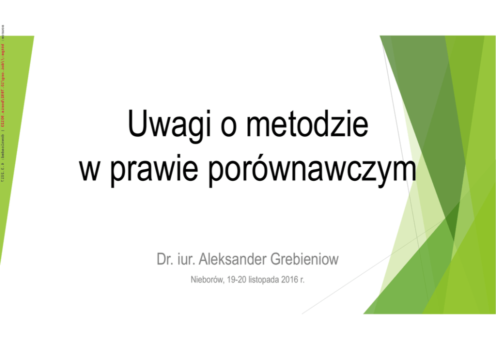 7102.3.4 :dedaolnwod | 32109.sirob/2987.01/gro.iod//:sptth :ecruos Uwagi o metodzie w prawie porównawczym Dr. iur. Aleksander Grebieniow Nieborów, 19-20 listopada 2016 r. Przegląd treści I. II. III. IV. Czym jest prawo porównawcze? Wielość celów i metod 1. Multi-axial approach 2. Metoda(y) funkcjonalna(e) (Zweigert/Kötz) Perspektywa prawnoporównawcza (horyzontalna) 1. Macro-comparison. „Geografia prawna” 2. Micro-comparison: problem terminologiczny 3. Dialektyka prawa porównawczego Perspektywa historyczna (wertykalna) 1. Prawo rzymskie jako tertium comparationis 2. Laesio enormis: ilustracja Podsumowanie i dyskusja 2 skutki prawne wyzysku perspektywa prawnoporównawcza perspektywa historyczna 3 Kombinacja perspektyw (multi-axial approach) ujęcie diachroniczne/wertykalne ujęcie synchroniczne / horyzontalne History involves comparison. Comparison involves history. 4 I. Czym jest prawo porównawcze? nauka czy metoda (→wielość metod)? Comparative law, droit comparé, diritto comparato, Rechtsvergleichung I.1. Multi-axial approach (vide: poprzedni slajd) I.2. Metoda(y) funkcjonalna(e) (K. Zweigert/H. Kötz, R. Michaels) poddawana poważnej krytyce (J. Gordley, S. Piek, E. Weinrib, E. Örücü), jak z demokracją - nikt nie wymyślił dotychczas niczego lepszego, najodpowiedniejsza dla materii prawnej instytucjonalnie i terminologicznie zróżnicowanej, funkcję stanowi pewna sytuacja faktyczna, praktyczny problem prawny, ekwiwalentność badanych zjawisk. 5 II.1. „Geografia prawna”: eklektyczne porządki prawne macro-comparison Civil Law Tradition moderni sistemi di civil law tra influenze francesi e tedesche (A. Gambaro/R. Sacco) V. Constantinesco/Th. Kadner-Graziano: „some derived legal systems („Tochterrechte“) may achieve a level of originality which requires taking them into consideration...” 6 6 Skutki prawne wyzysku w perspektywie historycznej §138 (2) BGB (1900) art. 21 CO (1911) art. 22 Progetto It-Fr (1927) art. 42 KZ (1933) art. 1447,1448, 1450 CCIt (1942) art. 388 KC (1964) art. 3:54 NBW (1992) 1900 nieważność/wzruszalność sądowe miarkowanie świadczeń złożone sankcje prawne 7 2014 II.2. Micro-comparison. Terminologia porównywanie obiektów tej samej kategorii (wyznaczonej przez funkcję) – problem prawny, analiza prawa obcego dokonuje się metodą dogmatyczną, systematyzacja materiału prawnego wg klucza dogmatycznego (nieważność, wzruszalność, modyfikacja etc...). laesio enormis, C. 4.44.2 (Diocl. et Maxim. a.285) die Wucher, §138 Abs. 2 BGB die Übervorteilung, Art. 21 OR azione generale per lesione, Art. 1448 CCIt misbruik van omstedigheden, Art. 3:44(4) NBW unfair exploitation (common law) 8 II.3. Dialektyka prawa porównawczego Proces porównywania (metoda systematyczna): zebranie materiału, obiektywne opisanie praw obcych (Länderberichte), zestawienie w celu porównania, wnioski. A. Tschentscher: (1) to tak nie działa, panuje dowolność metodologiczna (2) „Integration von Beschreibung und Bewertung” 9 III.1. Prawo rzymskie jako punkt odniesienia (tertium comparationis) «[…] une notion générale commune correcte, autorisant la comparaison en tant que tertium comparationis» V. Knapp (1968) tertium comparationis Pichonnaz, Zwalve, Koschembahr . oryginalne ujęcie Koschembahr-Łyskowskiego 10 III.2. Laesio enormis jako ilustracja Laesio enormis: C. 4.44.2 (Diocl. et Maxim. a. 285), 8 (Idem, a. 293) obiektywna nieekwiwalentność świadczeń przyczyna leżąca wewnątrz stosunku prawnego (endogene Leistungsstörung) instytucja prawa rzymskiego nakłada się jako problem prawny na rolę funkcji w znaczeniu jaki nadali jej K. Zweigert/H. Kötz 11 IV. Podsumowanie i dyskusja, literatura U. KISCHEL, Die Rechtsvergleichung, München 2015 M. MÜLLER-CHEN/CHR. MÜLLER/C. WIDMER LÜCHINGER (Hrsg.), Comparative Private Law, Zurich/St. Gall 2015 TH. KADNER GRAZIANO THOMAS, Rechtsvergleichung lehren und lernen – Ein Vorschlag aus Genf, ZEuP 22 (2014), 204 ff. E. ÖRÜCÜ, Methodology of comparative law in: J.M. SMITS (Hrsg.), Elgar Encyclopaedia of Comparative Law, Cheltenham / Northampton 2012, 442 ff. A. TSCHENTSCHER, Dialektische Rechtsvergleichung — Zur Methode der Komparistik im öffentlichen Recht, JuristenZeitung 62 (2007), 807 ff. M. REINMANN, Rechtsvergleichung und Rechtsgeschichte im Dialog, ZEuP 7 (1999), 496 ff. D. JOHNSTON, Roman Law, Comparative Law and Legal History, ZEuP 7 (1999), 560 ff. F. SCHMIDT, The Need for a Multi-Axial Method in Comparative Law, in: FS Zweigert, Tübingen 1981, 525 ff. 12