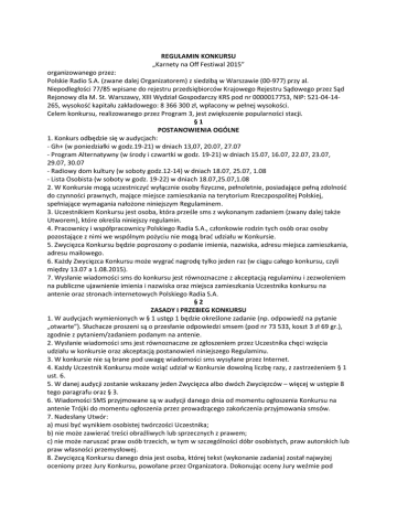 REGULAMIN KONKURSU „Karnety na Off Festiwal 2015” organizowanego przez: Polskie Radio S.A. (zwane dalej Organizatorem) z siedzibą w Warszawie (00-977) przy al. Niepodległości 77/85 wpisane do rejestru przedsiębiorców Krajowego Rejestru Sądowego przez Sąd Rejonowy dla M. St. Warszawy, XIII Wydział Gospodarczy KRS pod nr 0000017753, NIP: 521-04-14265, wysokość kapitału zakładowego: 8 366 300 zł, wpłacony w pełnej wysokości. Celem konkursu, realizowanego przez Program 3, jest zwiększenie popularności stacji. §1 POSTANOWIENIA OGÓLNE 1. Konkurs odbędzie się w audycjach: - Gh+ (w poniedziałki w godz.19-21) w dniach 13,07, 20.07, 27.07 - Program Alternatywny (w środy i czwartki w godz. 19-21) w dniach 15.07, 16.07, 22.07, 23.07, 29.07, 30.07 - Radiowy dom kultury (w soboty godz.12-14) w dniach 18.07, 25.07, 1.08 - Lista Osobista (w soboty w godz. 19-22) w dniach 18.07,25.07,1.08 2. W Konkursie mogą uczestniczyć wyłącznie osoby fizyczne, pełnoletnie, posiadające pełną zdolność do czynności prawnych, mające miejsce zamieszkania na terytorium Rzeczpospolitej Polskiej, spełniające wymagania nałożone niniejszym Regulaminem. 3. Uczestnikiem Konkursu jest osoba, która prześle sms z wykonanym zadaniem (zwany dalej także Utworem), które określa niniejszy regulamin. 4. Pracownicy i współpracownicy Polskiego Radia S.A., członkowie rodzin tych osób oraz osoby pozostające z nimi we wspólnym pożyciu nie mogą brać udziału w Konkursie. 5. Zwycięzca Konkursu będzie poproszony o podanie imienia, nazwiska, adresu miejsca zamieszkania, adresu mailowego. 6. Każdy Zwycięzca Konkursu może wygrać nagrodę tylko jeden raz (w ciągu całego konkursu, czyli między 13.07 a 1.08.2015). 7. Wysłanie wiadomości sms do konkursu jest równoznaczne z akceptacją regulaminu i zezwoleniem na publiczne ujawnienie imienia i nazwiska oraz miejsca zamieszkania Uczestnika konkursu na antenie oraz stronach internetowych Polskiego Radia S.A. §2 ZASADY I PRZEBIEG KONKURSU 1. W audycjach wymienionych w § 1 ustęp 1 będzie określone zadanie (np. odpowiedź na pytanie „otwarte”). Słuchacze proszeni są o przesłanie odpowiedzi smsem (pod nr 73 533, koszt 3 zł 69 gr.), zgodnie z pytaniem/zadaniem podanym na antenie. 2. Wysłanie wiadomości sms jest równoznaczne ze zgłoszeniem przez Uczestnika chęci wzięcia udziału w konkursie oraz akceptacją postanowień niniejszego Regulaminu. 3. W konkursie nie są brane pod uwagę wiadomości sms wysyłane przez Internet. 4. Każdy Uczestnik Konkursu może wziąć udział w Konkursie dowolną liczbę razy, z zastrzeżeniem § 1 ust. 6. 5. W danej audycji zostanie wskazany jeden Zwycięzca albo dwóch Zwycięzców – więcej w ustępie 8 tego paragrafu oraz § 3. 6. Wiadomości SMS przyjmowane są w audycji danego dnia od momentu ogłoszenia Konkursu na antenie Trójki do momentu ogłoszenia przez prowadzącego zakończenia przyjmowania smsów. 7. Nadesłany Utwór: a) musi być wynikiem osobistej twórczości Uczestnika; b) nie może zawierać treści obraźliwych lub sprzecznych z prawem; c) nie może naruszać praw osób trzecich, w tym w szczególności dóbr osobistych, praw autorskich lub praw własności przemysłowej. 8. Zwycięzcą Konkursu danego dnia jest osoba, której tekst (wykonanie zadania) został najwyżej oceniony przez Jury Konkursu, powołane przez Organizatora. Dokonując oceny Jury weźmie pod uwagę oryginalność, pomysłowość, wartość artystyczną tekstu. W określonych dniach zostaną wskazani dwaj Zwycięzcy w danej audycji – więcej w § 3. 9. Imię i nazwisko Zwycięzcy (wraz z miejscowością) zostaną ogłoszone w audycji, w której rozgrywany był konkurs. §3 NAGRODY 1. Nagrodą w konkursie dla Zwycięzcy jest podwójny karnet na cały Off Festival 2015 (7-9.08.2015, Katowice, Dolina trzech Stawów). Wartość jednej nagrody to: 320 (słownie: trzysta dwadzieścia złotych) brutto. Nagrody zostaną przyznane zgodnie z poniższym planem: - Gh+ (w poniedziałki w godz.19-21) w dniach 13,07, 20.07, 27.07 pięć podwójnych karnetów w każdej audycji - Program Alternatywny (w środy i czwartki w godz. 19-21) w dniach 15.07, 16.07, 22.07, 23.07, 29.07, 30.07 pięć podwójnych karnetów w każdej audycji - Radiowy dom kultury (w soboty godz.12-14) w dniach 18.07, 25.07, 1.08 pięć podwójnych karnetów w każdej audycji - Lista Osobista (w soboty w godz. 19-22) w dniach 18.07,25.07,1.08 pięć podwójnych karnetów w każdej audycji 2. Nagrody nie podlegają wymianie na ekwiwalent pieniężny lub rzeczowy. 3. Zwycięzcy udostępnią Organizatorowi swoje dokładne dane, które posłużą do przekazania nagrody w terminie od 13 lipca do 1 sierpnia 2015 roku. 4. Nagrody nie są objęte podatkiem od wygranej. §4 DANE OSOBOWE 1. Administratorem danych osobowych przetwarzanych w związku z realizacją Konkursu jest Organizator. 2. Dane osobowe przekazane Organizatorowi przez Uczestników Konkursu będą przetwarzane przez Organizatora wyłącznie w celu realizacji Konkursu i doręczenia nagród. Podanie danych osobowych jest dobrowolne, jednak ich niepodanie uniemożliwia otrzymanie nagrody w Konkursie. Każdy Uczestnik Konkursu posiada prawo wglądu do swoich danych osobowych, do ich poprawiania oraz żądania ich usunięcia. Dane osobowe będą przetwarzane zgodnie z przepisami ustawy z dnia 29 sierpnia 1997 r. o ochronie danych osobowych (tj.: Dz.U. z 2002r. Nr 101, poz. 926 z późn. zm.) na co każdy Uczestnik Konkursu wyraża zgodę. §5 PRAWA AUTORSKIE 1. Uczestnik Konkursu oświadcza, że Utwór zgłoszony do Konkursu został stworzony samodzielnie przez Uczestnika i jest wolny od praw i roszczeń osób trzecich, w tym dotyczących praw autorskich i pokrewnych oraz że ponosi wobec Organizatora odpowiedzialność z tego tytułu, zwalniając go z wszelkich roszczeń osób trzecich. 2.Z chwilą wysłania Utworu do Konkursu Uczestnik udziela bez wynagrodzenia nieograniczonej czasowo i t