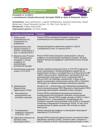 Protokół nr 4/2014 z posiedzenia (telekonferencji) Zarządu PZOS w dniu 4 listopada 2014 r. Uczestnicy: Jerzy Antonowicz, Ludomir Parfianowicz, Ryszard Chachurski, Paweł Biederman, Paweł Morawski (od pkt. 2), Piotr Cych (od pkt. 2) Nieobecni: Kalikst Sobczyński Zaproszeni goście: nie brali udziału Przebieg posiedzenia Notatki 1. Wykaz spraw Prezes PZOS przedstawił Zarządowi wykaz spraw przewidzianych do rozpatrzenia na posiedzeniu. przewidzianych do rozpatrzenia na posiedzeniu. 2. Zatwierdzenie przez Zarząd protokołu nr 3/2014 z posiedzenia w dniu 10 czerwca 2014 r. 3. Złożenie przez Prezesa PZOS sprawozdania Zarządowi z decyzji podjętych od poprzedniego posiedzenia Zarządu. 4. Rozpatrzenie propozycji zmian w CTZ 2015. 5. Zatwierdzenie Regulaminów Sędziowskich PZOS. 6. Wprowadzenie wynagrodzenia dla kontrolera zawodów. 7. Przedstawienie wstępnych propozycji CTZ 2016 - 2017. 8. Ogłoszenie konkursu na trenerów kadry Narodowej w BnO i Zarząd jednogłośnie zatwierdził protokół nr 3/2014 z posiedzenia w dniu 10 czerwca 2014 r. Prezes PZOS złożył Zarządowi sprawozdanie z decyzji podjętych od poprzedniego posiedzenia Zarządu. Nie było żadnych decyzji wymagających zatwierdzenia przez Zarząd PZOS. Zarząd rozpatrzył propozycje zmian w CTZ 2015 zgłoszone przez organizatorów. Zarząd jednogłośnie zgodził się na proponowane zmiany, w szczególności na zmianę terminu MP i MPM w Nocnym BnO i Sztafetowym Sprinterskim BnO przy zastrzeżeniach dotyczących terenu rozgrywania MP w Nocnym BnO (do dalszego rozpatrzenia), a także wyraził zgodę na ewentualne dostosowanie terminu MP w Orientacji Precyzyjnej do międzynarodowego kalendarza zawodów. Zarząd (5 za, 1 wstrzymujący się) zatwierdził przedstawione przez przewodniczącego GKS Regulaminy Sędziowskie PZOS proponując jednocześnie niewielkie zmiany edycyjne. Prezes PZOS przedstawił propozycję wprowadzenia wynagrodzenia dla kontrolerów zawodów wyznaczanego przez PZOS. Zarząd PZOS podjął uchwałę nr 8/2014 z dnia 4 listopada 2014 r. o wprowadzeniu wynagrodzenia dla kontrolera zawodów wyznaczanego przez PZOS w wysokości określonej w Regulaminie Finansowym PZOS. W roku 2015 wynagrodzenie to będzie wynosiło 200 zł brutto za każdy dzień pracy. Zarząd zapoznał się wstępnie z propozycjami dotyczącymi kalendarza CTZ 2016-2017. Zarząd PZOS postanowił ogłosić konkurs na trenerów Kadry Narodowej: seniorów w BnO, juniorów w BnO, seniorów w RJnO, juniorów w RJnO, którzy poprowadzą te kadry w roku Strona 1 z 4 Protokół nr 4/2014 z posiedzenia (telekonferencji) Zarządu PZOS w dniu 4 listopada 2014 r. RJnO. 9. Omówienie nadesłanych propozycji poprawek i zmian w regulaminach i przepisach PZOS. 10. Omówienie kontroli obsługi systemu SportIdent. 11. Propozycje zmian w regulaminach Systemu Sportu Młodzieżowego w roku 2015. 12. Omówienie zaproszenia Jana Cegiełki do prac w ramach komisji MTBO IOF. 13. Zapoznanie się z propozycją przepisów przygotowanych przez Komisję Kartograficzną PZOS. 14. Kurs instruktorów Orientacji Sportowej. 2015. Zarząd zapoznał się z otrzymanymi propozycjami poprawek i zmian w regulaminach i przepisach PZOS. Regulaminy i przepisy PZOS na rok 2015 zostaną opublikowane do 31 grudnia 2014. R. Chachurski przedstawił propozycję wprowadzenia do przepisów PZOS regulacji dotyczących kontroli obsługi systemu SI. Odpowiednie zapisy istnieją w formie zaleceń dla Advisorów IOF, a także w przepisach niektórych krajów. Ewentualne zmiany w przepisach zostaną wprowadzone do 31 grudnia 2014 r. Zarząd postanowił kontynuować prace na d regulaminami SSM 2015. Ewentualne zmiany w przepisach zostaną wprowadzone do 31 grudnia 2014 r. Zarząd omówił pismo IOF w sprawie zaproszenia Jana Cegiełki do prac w komisji MTBO IOF. Sprawę postanowiono skonsultować z biurem IOF. Zarząd zapoznał się z propozycją przepisów przygotowanych przez Komisję Kartograficzną PZOS, które regulują m.in. sprawy wykonywania map na zawody CTZ i RTZ, uzyskiwania numerów katalogowych, archiwizację map, itd. Przepisy skierowano do dalszych prac, i zostaną one wprowadzone do 31 grudnia 2014 r. Zarząd zapoznał się z organizacją kursu dla instruktorów Orientacji Sportowej. Ze względu na małą liczbę zgłoszeń zdecydowano o nierozpoczynaniu kursu we wcześniej planowanym terminie, jak również o nieodwoływaniu go, ale o przesunięciu terminu kursu na późniejszy termin, które był wcześniej terminem rezerwowym. 15. Składki członkowskie. R. Chachurski przedstawił propozycję wprowadzenia do Regulaminu Finansowego PZOS zasad narastania co kwartał składki członkowskiej za dany rok w przypadku nieopłacenia jej w przewidzianym w RF terminie (31 grudnia). Pozwoliłoby to na łatwiejsze planowanie przychodów i wydatków PZOS, a także wyeliminowało sytuacje, w których niektórzy członkowie opłacają składki raz na 2 lata, gdy grozi im skreślenie z listy członków PZOS. Ewentualne zmiany zostaną wprowadzone do 20 grudnia 2014 r. 16. Sytuacja w RJnO L. Parfianowicz przedstawił sytuację aktualnie panującą w RJnO. Podsumował Mistrzostwa Świata w RJnO przeprowadzone w Białymstoku, podkreślając ich wysoką ocenę przez zawodników (oficjalna ocena przez IOF nie została jeszcze przedstawiona). Podkreślił duże zasługi Igora Strona 2 z 4 Protokół nr 4/2014 z posiedzenia (telekonferencji) Zarządu PZOS w dniu 4 listopada 2014 r. Błachuta oraz znaczący udział w organizacji przedstawicieli Lasów Państwowych, w tym w szczególności nadleśniczego Waldemara Sieradzkiego. Wysoko ocenił także prace kartograficzne wykonane przez Tomasza Nitscha. Omawiając szerzej sytuację w RJnO w Polsce L. Parfianowicz podkreślił potrzebę prowadzenia dalszych prac mających na celu odbudowę tej dyscypliny. Wskazał na potrzebę odchudzenia Regulaminów Sportowych RJnO. Pozytywnie ocenił pracę Tomasza Nitscha, który pełnił funkcję Sędziego Gł