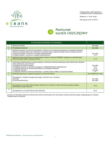 Taryfa prowizji i opłat bankowych w ESBANKU Banku Spółdzielczym Załącznik nr 18 do Taryfy Obowiązuje od 24.10.2012 r. Rachunek biznES OSZCZĘDNY WYSZCZEGÓLNIENIE CZYNNOŚCI 1. Otwarcie rachunku bez opłat 2. Prowadzenie rachunku bez opłat Realizacja przelewu na rachunki prowadzone w Banku lub na rachunki prowadzone w pozostałych bankach złoŜone w placówce Banku lub realizowane za pośrednictwem elektronicznego systemu obsługi rachunku *: a) pierwszy przelew z rachunku w miesiącu kalendarzowym b) kolejny przelew z rachunku w miesiącu kalendarzowym bez opłat 10 zł Realizacja dyspozycji Klienta za pośrednictwem systemu rozliczeń SORBNET składana za pośrednictwem elektronicznego systemu obsługi rachunku 15 zł 3. 4. 5. 6. Automatyczne jednorazowe lub stałe przelewy z rachunku w terminie wskazanym przez Klienta (tzw. Zlecenie stałe) realizowane przez Internet: a) przyjęcie lub zmiana zlecenia b) realizacja zlecenia na rachunki prowadzone w ESBANKU Banku Spółdzielczym* c) realizacja zlecenia na rachunki prowadzone w pozostałych bankach* d) odwołanie zlecenia e) realizacja zlecenia w terminie późniejszym, z powodu braku środków na rachunku Klienta Realizacja dyspozycji z wpływów bieŜących na rachunek Klienta bez opłat 10 zł 10 zł bez opłat 5 zł bez dodatkowych opłat 7. Sporządzenie i wysłanie wyciągu zbiorczego z rachunku raz w miesiącu: a) pocztą b) pocztą elektroniczną bez opłat bez opłat 8. 9. Sporządzenie na wniosek Klienta odpisu dokumentu do rachunku, historii rachunku powyŜej miesiąca, potwierdzenia salda rachunku 10 zł Sporządzenie na wniosek Klienta opinii bankowej 30 zł * prowizja za realizację przelewów pobierana jest zbiorczo pierwszego dnia roboczego miesiąca kalendarzowego następującego po miesiącu, którego dotyczy rozliczenie ESBANK Bank Spółdzielczy – Taryfa rachunków oszczędnościowych 1