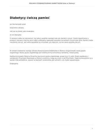 POLSKIE STOWARZYSZENIE DIABETYKÓW Koło w Złotoryi Diabetycy ćwiczą pamieć Jan Kochanowski pisał: Szlachetne zdrowie, nikt się nie dowie, jako smakujesz, aż sie zepsujesz. O zdrowie trzeba się zatroszczyć, nie tylko o wnętrze naszego ciała ale również o umysł. Często zapominamy o prostych rzeczach, kręcimy się w kółko, próbujemy zapisywać wszystko na kartkach niczym plan dnia. Pamieć trzeba nieustanie ćwiczyć. Jest wiele sposobów np; krzyżówki, gry logiczne, czy też nauka języków obcych. W ramach krzewienia naszego zdrowia Stowarzyszenie Diabetyków w Złotoryi zorganizowało naukę języka angielskiego. Nauka języka angielskiego jest świetną formą komunikacji werbalnej i towarzyskiej. Spotkania prowadzi Malwina Durachta nauczyciel języka angielskiego, grupa liczy 11 osób. Dzięki współpracy i uprzejmości Przychodni Rejonowej w Złotoryi uczestnicy mogą się uczyć w sali Przychodni. Zajęcia prowadzone są w bardzo miłej atmosferze, zawsze na twarzach uczestników jest uśmiech, a to chyba najważniejsze. Dziękujemy 1