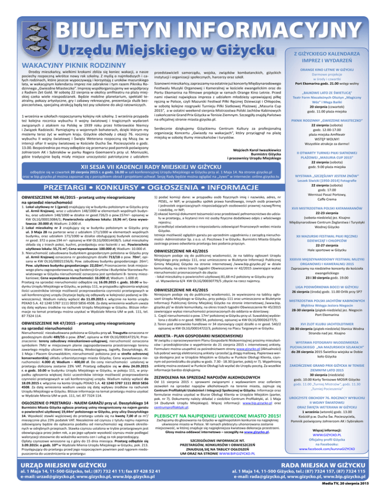 BIULETYN INFORMACYJNY Urzędu Miejskiego w Giżycku WAKACYJNY PIKNIK RODZINNY Drodzy mieszkańcy, wielkimi krokami zbliża się koniec wakacji, a nasze pociechy rozpoczną wkrótce nowy rok szkolny. Z myślą o najmłodszych i całych rodzinach, które jeszcze wypoczywają i korzystają z uroków mazurskiego lata, w wakacyjnym kalendarzu imprez nie zabraknie i tym razem Pikniku Rodzinnego „Gwiezdne Miasteczko”. Imprezę współorganizujemy we współpracy z Radiem Zet Gold. W sobotę 22 sierpnia w okolicy amfiteatru na plaży miejskiej czeka wiele niespodzianek. Będzie mobilne planetarium, spektakl teatralny, pokazy artystyczne, gry i zabawy rekreacyjne, prezentacja służb bezpieczeństwa, specjalną atrakcją będą też psy szkolone do akcji ratowniczych. 1 września w szkołach rozpoczynamy kolejny rok szkolny. 1 września przypada też kolejna rocznica wybuchu II wojny światowej i tragicznych wydarzeń związanych z atakiem na Polskę w 1939 roku przez hitlerowskie Niemcy i Związek Radziecki. Pamiętajmy o wojennych bohaterach, dzięki którym my możemy teraz żyć w wolnym kraju. Giżyckie obchody z okazji 76. rocznicy wybuchu II wojny światowej i Święta Weterana rozpoczną się Mszą św. w intencji ofiar II wojny światowej w Kościele Ducha Św. Pocieszyciela o godz. 13.00. Bezpośrednio po mszy odbędzie się przemarsz pod pomnik poświęcony żołnierzom AK i Sybiraków w parku Rogera Goemaere’a przy ul. Moniuszki, gdzie tradycyjnie będą miały miejsce uroczystości patriotyczne z udziałem przedstawicieli samorządu, wojska, związków kombatanckich, giżyckich instytucji i organizacji społecznych, harcerzy oraz szkół. Szanowni mieszkańcy, zapraszamy na ostatnie już koncerty Międzynarodowego Festiwalu Muzyki Organowej i Kameralnej w kościele ewangelickim oraz do Portu Ekomarina na filmowe projekcje w ramach Orange Kino Letnie. Przed nami również największa impreza z udziałem młodzieży uprawiającej piłkę ręczną w Polsce, czyli Mazurski Festiwal Piłki Ręcznej Dziewcząt i Chłopców, w sobotę kolejne rozgrywki Turnieju Piłki Siatkowej Plażowej „Masuria Cup 2015”, a w ostatni weekend sierpnia Mistrzostwa Polski Jachtów Kabinowych i zakończenie Grand Prix Giżycka w Tenisie Ziemnym. Szczegóły znajdą Państwo na oficjalnej stronie miasta gizycko.pl. Serdecznie dziękujemy Giżyckiemu Centrum Kultury za profesjonalną organizację Koncertu „Gwiazdy na wakacjach”, który przyciągnął na plażę miejską w sobotę tłumy mieszkańców i turystów. Wojciech Karol Iwaszkiewicz Burmistrz Giżycka i pracownicy Urzędu Miejskiego XII SESJA VII KADENCJI RADY MIEJSKIEJ W GIŻYCKU odbędzie się w czwartek 20 sierpnia 2015 r. o godz. 16.00 w sali konferencyjnej Urzędu Miejskiego w Giżycku przy al. 1 Maja 14. Na stronie gizycko.pl oraz w bip.gizycko.pl można zapoznać się z porządkiem obrad i projektami uchwał. Sesję Rady będzie można oglądać na „żywo” w internecie: online.gizycko.tv. PRZETARGI • KONKURSY • OGŁOSZENIA • INFORMACJE OBWIESZCZENIE NR 46/2015 - przetarg ustny nieograniczony na sprzedaż nieruchomości 1.Lokal użytkowy nr 1 (garaż) znajdujący się w budynku położonym w Giżycku przy ul. Armii Krajowej, wraz z udziałem 148/1000 w elementach wspólnych budynku, oraz udziałem 148/1000 w działce nr geod.726/3 o pow.157m2- opisanej w KW OL1G/00013084/1; Powierzchnia użytkowa lokalu: 19,96 m2; Cena wywoławcza: 20.000 zł; Wadium: 2.000 zł. 2.Lokal mieszkalny nr 2 znajdujący się w budynku położonym w Giżycku przy ul. 3 Maja 28 na parterze wraz z udziałem 171/1000 w elementach wspólnych budynku, oraz udziałem 171/1000 w działce obsługującej budynek oznaczonej nr geod. 372 o pow.194 m2- opisanej w KW OL1G/00014438/5. Lokal mieszkalny składa się z trzech pokoi, kuchni, przedpokoju oraz łazienki z wc. Powierzchnia użytkowa lokalu: 55,71 m2; Cena wywoławcza: 100.000 zł; Wadium: 10.000 zł. 3. Nieruchomość zabudowana budynkiem gospodarczym położona w Giżycku przy ul. Armii Krajowej oznaczona nr geodezyjnym działki 713/18 o pow. 70m2, opisana w KW OL1G/00021156/6; Pow. zabudowy budynku gospodarczego: 26m2; Pow. użytkowa budynku gospodarczego: 22,02m2; Przeznaczenie: brak miejscowego planu zagospodarowania, wg Ewidencji Gruntów i Budynków Starostwa Powiatowego w Giżycku nieruchomość oznaczona jest symbolami B- tereny mieszkaniowe; Cena wywoławcza nieruchomości: 16.000 zł; Wadium: 1.600 zł; Przetarg na sprzedaż nieruchomości odbędzie się 16.09.2015 r. godz. 10.00 w budynku Urzędu Miejskiego w Giżycku, w pokoju 111, w przypadku zgłoszenia większej ilości uczestników istnieje możliwość przeprowadzenia czynności przetargowych w sali konferencyjnej urzędu (licytacje będą się odbywały w kolejności podanej w Obwieszczeniu). Wadium należy wpłacić do 11.09.2015 r. włącznie na konto urzędu PEKAO S.A. 42 1240 5787 1111 0010 5856 4508. Za datę wniesienia wadium uważa się datę wpływu środków na rachunek Urzędu Miejskiego w Giżycku. Bliższe informacje na temat przetargu można uzyskać w Wydziale Mienia UM w pok. 111, tel. 87 7324 114. OBWIESZCZENIE NR 47/2015 - przetarg ustny nieograniczony na sprzedaż nieruchomości Nieruchomość niezabudowana położona w Giżycku przy ul. Traugutta oznaczona nr geodezyjnym działki 489/55 o pow. 27m2, opisana w KW OL1G/00014725/4; Przeznaczenie: tereny zabudowy mieszkaniowo-usługowej, nieruchomość oznaczona symbolem 7MU w miejscowym planie zagospodarowania przestrzennego terenu zawartego między ulicami: Warszawską, Wodociągową, Jagiełły, Daszyńskiego, Al. 1 Maja i Placem Grunwaldzkim; nieruchomość położona jest w strefie ochronnej konserwatorskiej układu urbanistycznego miasta Giżycka; Cena wywoławcza nieruchomości: 4.000 zł; Wadium – 400,00 zł. Do ceny nieruchomości ustalonej w przetargu doliczony zostanie 23% VAT. Przetarg odbędzie się w dniu 24.09.2015 r. o godz. 10.00 w budynku Urzędu Mi