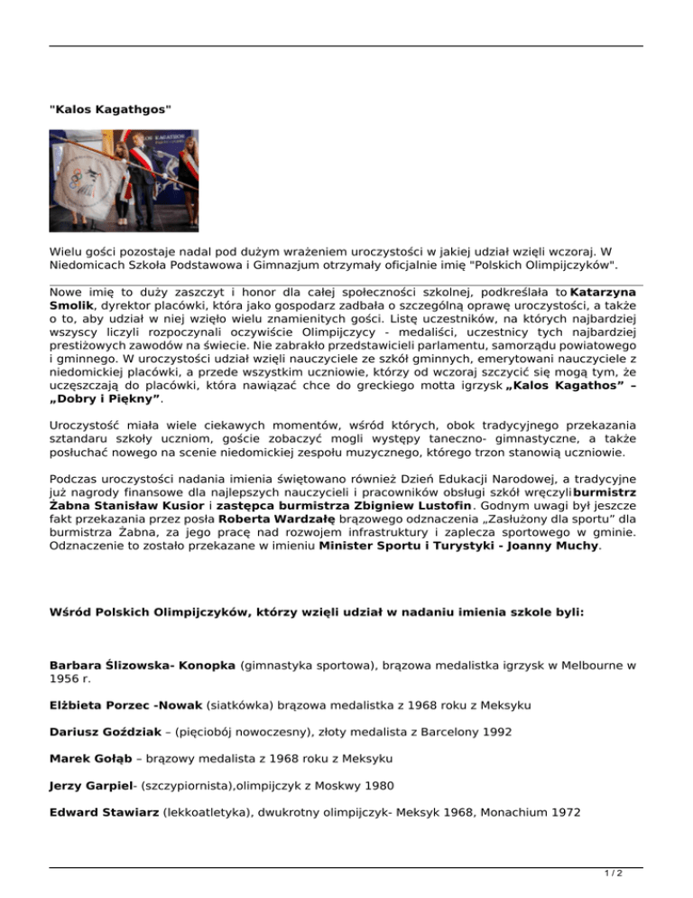 "Kalos Kagathgos" Wielu gości pozostaje nadal pod dużym wrażeniem uroczystości w jakiej udział wzięli wczoraj. W Niedomicach Szkoła Podstawowa i Gimnazjum otrzymały oficjalnie imię "Polskich Olimpijczyków". Nowe imię to duży zaszczyt i honor dla całej społeczności szkolnej, podkreślała to Katarzyna Smolik, dyrektor placówki, która jako gospodarz zadbała o szczególną oprawę uroczystości, a także o to, aby udział w niej wzięło wielu znamienitych gości. Listę uczestników, na których najbardziej wszyscy liczyli rozpoczynali oczywiście Olimpijczycy - medaliści, uczestnicy tych najbardziej prestiżowych zawodów na świecie. Nie zabrakło przedstawicieli parlamentu, samorządu powiatowego i gminnego. W uroczystości udział wzięli nauczyciele ze szkół gminnych, emerytowani nauczyciele z niedomickiej placówki, a przede wszystkim uczniowie, którzy od wczoraj szczycić się mogą tym, że uczęszczają do placówki, która nawiązać chce do greckiego motta igrzysk „Kalos Kagathos” – „Dobry i Piękny”. Uroczystość miała wiele ciekawych momentów, wśród których, obok tradycyjnego przekazania sztandaru szkoły uczniom, goście zobaczyć mogli występy taneczno- gimnastyczne, a także posłuchać nowego na scenie niedomickiej zespołu muzycznego, którego trzon stanowią uczniowie. Podczas uroczystości nadania imienia świętowano również Dzień Edukacji Narodowej, a tradycyjne już nagrody finansowe dla najlepszych nauczycieli i pracowników obsługi szkół wręczyliburmistrz Żabna Stanisław Kusior i zastępca burmistrza Zbigniew Lustofin. Godnym uwagi był jeszcze fakt przekazania przez posła Roberta Wardzałę brązowego odznaczenia „Zasłużony dla sportu” dla burmistrza Żabna, za jego pracę nad rozwojem infrastruktury i zaplecza sportowego w gminie. Odznaczenie to zostało przekazane w imieniu Minister Sportu i Turystyki - Joanny Muchy. Wśród Polskich Olimpijczyków, którzy wzięli udział w nadaniu imienia szkole byli: Barbara Ślizowska- Konopka (gimnastyka sportowa), brązowa medalistka igrzysk w Melbourne w 1956 r. Elżbieta Porzec -Nowak (siatkówka) brązowa medalistka z 1968 roku z Meksyku Dariusz Goździak – (pięciobój nowoczesny), złoty medalista z Barcelony 1992 Marek Gołąb – brązowy medalista z 1968 roku z Meksyku Jerzy Garpiel- (szczypiornista),olimpijczyk z Moskwy 1980 Edward Stawiarz (lekkoatletyka), dwukrotny olimpijczyk- Meksyk 1968, Monachium 1972 1/2 oraz dr hab. inż. Zbigniew Porada – profesor Politechniki Krakowskiej, zastępca przewodniczącego Małopolskiej Rady Olimpijskiej Pani Katarzyna Dobrowolska – reprezentowała Zespół Szkół nr 51 w Krakowie im. Polskich Olimpijczyków. 2/2 Powered by TCPDF (www.tcpdf.org)