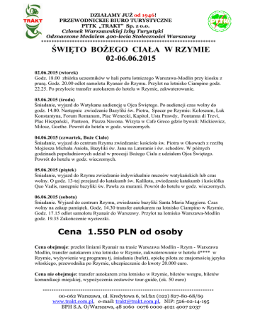 DZIAŁAMY JUŻ od 1946! PRZEWODNICKIE BIURO TURYSTYCZNE PTTK „TRAKT” Sp. z o.o. Członek Warszawskiej Izby Turystyki Odznaczone Medalem 400-lecia Stołeczności Warszawy ******************************************************************** ŚWIĘTO BOŻEGO CIAŁA W RZYMIE 02-06.06.2015 02.06.2015 (wtorek) Godz. 18.00 zbiórka uczestników w hali portu lotniczego Warszawa-Modlin przy kiosku z prasą. Godz. 20.00 odlot samolotu Ryanair do Rzymu. Przylot na lotnisko Ciampino godz. 22.25. Po przylocie transfer autokarem do hotelu w Rzymie, zakwaterowanie. 03.06.2015 (środa) Śniadanie, wyjazd do Watykanu audiencję u Ojca Świętego. Po audiencji czas wolny do godz. 14.00. Następnie zwiedzanie Bazyliki św. Piotra, Spacer po Rzymie: Koloseum, Łuk Konstantyna, Forum Romanum, Plac Wenecki, Kapitol, Usta Prawdy, Fontanna di Trevi, Plac Hiszpański, Panteon, Piazza Navona. Wizyta w Cafe Greco gdzie bywali: Mickiewicz, Miłosz, Goethe. Powrót do hotelu w godz. wieczornych. 04.06.2015 (czwartek, Boże Ciało) Śniadanie, wyjazd do centrum Rzymu zwiedzanie: kościoła św. Piotra w Okowach z rzeźbą Mojżesza Michała Anioła, Bazyliki św. Jana na Lateranie i św. schodów. W późnych godzinach popołudniowych udział w procesji Bożego Ciała z udziałem Ojca Świętego. Powrót do hotelu w godz. wieczornych. 05.06.2015 (piątek) Śniadanie, wyjazd do Rzymu zwiedzanie indywidualnie muzeów watykańskich lub czas wolny. O godz. 13-tej przejazd do katakumb św. Kaliksta, zwiedzanie katakumb i kościółka Quo Vadis, następnie bazyliki św. Pawła za murami. Powrót do hotelu w godz. wieczornych. 06.06.2015 (sobota) Śniadanie. Wyjazd do centrum Rzymu, zwiedzanie bazyliki Santa Maria Maggiore. Czas wolny na zakup pamiątek. Godz. 14.30 transfer autokarem na lotnisko Ciampino w Rzymie. Godz. 17.15 odlot samolotu Ryanair do Warszawy. Przylot na lotnisko Warszawa-Modlin godz. 19.35 Zakończenie wycieczki. Cena 1.550 PLN od osoby Cena obejmuje: przelot liniami Ryanair na trasie Warszawa Modlin - Rzym - Warszawa Modlin, transfer autokarem z/na lotnisko w Rzymie, zakwaterowanie w hotelu 4**** w Rzymie, wyżywienie wg programu tj. śniadania (bufet), opiekę pilota ze znajomością języka włoskiego, przewodnika po Rzymie, ubezpieczenie do kwoty 20.000 euro. Cena nie obejmuje: transfer autokarem z/na lotnisko w Rzymie, biletów wstępu, biletów komunikacji miejskiej, wypożyczenia zestawów tour-guide, (ok. 50 euro) ***************************************************************************** 00-062 Warszawa, ul. Kredytowa 6, tel.fax (022) 827-80-68/69 www.trakt.com.pl, e-mail: [email protected], NIP: 526-02-14-195 BPH S.A. O/Warszawa, 48 1060 0076 0000 4021 4007 2037