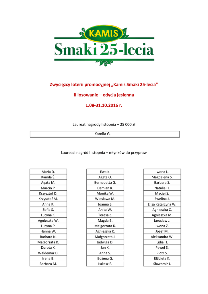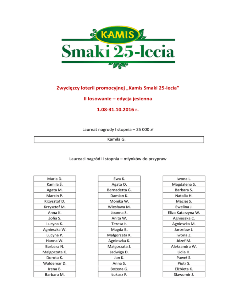 Zwycięzcy loterii promocyjnej „Kamis Smaki 25-lecia” II losowanie – edycja jesienna 1.08-31.10.2016 r. Laureat nagrody I stopnia – 25 000 zł Kamila G. Laureaci nagród II stopnia – młynków do przypraw Maria D. Kamila Ś. Agata M. Marcin P. Krzysztof D. Krzysztof M. Anna K. Zofia S. Lucyna K. Agnieszka W. Lucyna P. Hanna W. Barbara N. Małgorzata K. Dorota K. Waldemar D. Irena B. Barbara M. Ewa K. Agata O. Bernadetta G. Damian K. Monika W. Wiesława M. Joanna S. Anita W. Teresa Ł. Magda B. Małgorzata K. Agnieszka K. Małgorzata J. Jadwiga D. Jan K. Anna S. Bożena G. Łukasz F. Iwona L. Magdalena S. Barbara S. Natalia H. Maciej S. Ewelina J. Eliza Katarzyna W. Agnieszka C. Agnieszka M. Jarosław J. Iwona Z. Józef M. Aleksandra W. Lidia H. Paweł S. Piotr S. Elżbieta K. Sławomir J. Kinga J. Mirella J. Małgorzata B. Bartosz G. Katarzyna M. Emil G. Paweł B. Iwona R.-C. Agata T. Waldemar K. Anna D. Marek C. Maria W. Danuta W. Sylwia K. Ireneusz M. Paweł J. Lucyna K. Urszula C. Justyna Ś.-T. Rafał T. Roman I. Arkadiusz H. Agnieszka G. Lidia K. Tomasz S. Mariusz T. Paweł G. Ewa K. Dorota N. Dorota K. Joanna D. Marzena C. Ludwika C. Robert S. Weronika S. Teresa S. Dorota Ż. Katarzyna Ż. Paulina A. Małgorzata S. Damian W. Piotr G. Nicoletta K. Maria Ś. Anna M. Renata D. Magdalena G. Dominik M. Paweł D. Joanna G. Justyna J. Iwona G. Marzena J. Anna T. Joanna K. Izabela P. Sylwia W. Anna C. Anna F. Beata K. Grażyna W. Maria R. Marzena S. Zbigniew K. Kamil K. Maria K. Dorota P. Katarzyna Ś. Konrad O. Magdalena N. Joanna B. Zbigniew B. Małgorzata S. Marzena L. Izabella Ł. Iwona D. Artur S. Magdalena R. Joanna M. Urszula P. Aleksandra K. Stanisława M.-M. Andrzej P. Dorota B. Anna S. Milena J. Małgorzata C. Wojciech Z. Katarzyna L. Marta J. Renata B. Przemysław P. Anna G. Radosław M. Ewa G. Małgorzata G. Izabela M. Jolanta O. Ewelina K. Dariusz N. Sławomir Ś. Jarosław Ś. Bronisława W. Andrzej K. Zenobiusz Ś. Krystyna K. Stefania P. Tadeusz H. Emilia M.-W. Tomasz B. Paweł K. Maciej K. Sławomir B. Aneta G. Kamil T. Janusz K. Krzysztof R. Aneta W. Adam K. Ewa C. Elżbieta D. Paweł I. Radosław B. Andrzej L. Halina K. Iwona M. Krystian B. Jarosław J. Marzena D. Dorota J. Małgorzata L. Dorota M. Bartłomiej S. Jadwiga S. Olga S. Adam S. Dariusz F. Renata P. Agnieszka K. Tomasz I. Alina K. Marzena W. Halina I. Danuta M. Katarzyna S. Magdalena P. Edyta R. Alicja J. Emilia M. Anna B. Ewelina B. Marzena T. Julita S. Joanna J. Monika W. Grażyna P. Józef P. Sławomir S. Tomasz K. Maria B. Marta T. Patryk Ś. Kamil S. Monika D. Waldemar P. Agnieszka H. Marta C. Magda S. Janusz W. Izabela K. Michał K. Krzysztof T. Krzysztof J. Danuta D. Anna Ł. Anna K. Urszula S. Mirosław W. Krystyna W. Jerzy Z. Janina K. Katarzyna S. Sebastian O. Mariusz L. Katarzyna S. Krzysztof K. Beata M. Anna T. Beata D. Elżbieta K. Cecylia G. Magdalena K. Andrzej G. Urszula O. Gabriela L. Łukasz S. Arkadiusz S. Agnieszka S. Krystyna M. Michał K. Mariusz K. Artur M. Agnieszka Ł. Elżbieta P. Łukasz P. Waldemar L. Aneta G. Agnieszka W. Józef K. Kamil S. Adrian F. Anna B. Józef P. Ewa C. Michał W. Daria W. Magdalena T. Małgorzata C. Dorota P. Ilona K. Krzysztof U. Weronika A. Jolanta D. Anna W. Przemysław M. Agata K. Bożena S. Arkadiusz J. Anna P. Daniel D. Arkadiusz W. Marian M. Łukasz I. Katarzyna Z. Dorota K. Barbara Ś. Renata W. Oskar b. Paweł M. Ireneusz O. Maria S. Aleksandra G. Agnieszka B. Milena K. Ewa M. Katarzyna C. Mariusz B. Robert B. Celina H. Leszek W. Mariusz P. Monika G. Sławomir U. Małgorzata U. Teresa W. Edyta Z. Joanna S. Marcin W. Waldemar D. Beata W. Józef K. Agata H. Łucja L. Dariusz G. Monika G. Edyta C. Halina M. Elżbieta L. Piotr D. Marcin C. Izabela M. Anna S. Waldemar P. Anna S. Żaneta A. Mariusz O. Mariusz F. Dorota M. Aneta B. Michał O. Ewa T. Aneta W. Jolanta L. Karina L. Ewelina K.-C. Halina G. Dorota K. Piotr F. Elżbieta B. Barbara K. Kinga B. Ewa P. Renata P. Agnieszka W. Elżbieta W. Sylwia S. Renata B. Danuta R. Anna S. Krzysztof L. Marzena N. Bożena S. Katarzyna K. Agata B. Krzysztof Z. Monika B. Zbigniew G. Sylwia K. Kinga W. Julita Ł. Małgorzata I. Androna W. Lucyna W. Iwona B.-D. Anna P. Marian B. Mariusz L. Monika G. Magdalena Z. Edyta K.-R. Anna M. Marzena K. Aleksandra S. Marek R. Agnieszka Z. Paweł K. Adam T. Ewelina W. Damian K. Dorota S. Ewa S. Henryka B. Konrad M. Wojciech S. Bożena B. Włodzimierz N. Monika S. Michał K. Elżbieta K. Jacek F. Aleksandra K. Elżbieta L. Aneta B. Władysław B. Jadwiga B. Paweł L. Grażyna P. Elżbieta L. Elwira G. Helena M. Joanna K. Kinga B. Szczepan R. Bogusław S. Aleksandra K. Barbara N. Krystyna W. Adam R. Kamil J. Magdalena T. Grażyna D. Dorota M. Ewa K. Mariusz K. Wanda K. Agata M. Patryk K. Monika W. Lidia A.-W. Tomasz Z. Andrzej M. Michał S. Agata K. Renata P. Łukasz B. Joanna B. Wojciech F. Jacek S. Anna R. Ewelina K. Danuta H. Katarzyna A. Arkadiusz M. Aneta K. Łukasz K. Emilia J. Magdalena C. Magdalena K. Agnieszka M. Elżbieta J. Dorota P. Karolina K. Anna M. Ewelina C. Anna S. Joanna B. Ewa Ł. Anna G. Joanna G. Marzena B. Irena M. Iwona M. Michał S. Jolanta G. Magdalena B. Justyna B. Alina D. Paweł N. Jakub K. Monika C. Kamil S. Henryka F. Małgorzata W. Daniel S. Agnieszka S. Kamila P. Anna F. Agnieszka M. Aneta J. Agata Ś. Natalia S. Kinga K. Aleksandra K. Iwona G.-J. Krystyna A. Renata G. Marcin K. Justyna R. Paulina L. Dawid J. Iwona N. Jolanta K. Dorota T. Dominika W. Barbara Z. Ola I. Przemysław D. Paweł K. Maria F. Dominika G. Maria L. Ewa D. Jolanta B. Romuald B. Małgorzata H. Beata S.-M. Maria H. Agnieszka S. Agnieszka W. Aneta M. Maciej L. Sebastian N. Tadeusz M. Tomasz P. Krystyna S. Paulina G. Damian M. Agnieszka B. Katarzyna P. Witold Z. Antonina S. Dominik K. Trwa weryfikacja pozostałych laureatów. Patrycja J.-M. Sylwia W. Beata P. Maria F. Tomasz K. Agnieszka W. Marzena P.-T. Katarzyna S. Magdalena K. Małgorzata K. Katarzyna O. Grażyna L. Cz