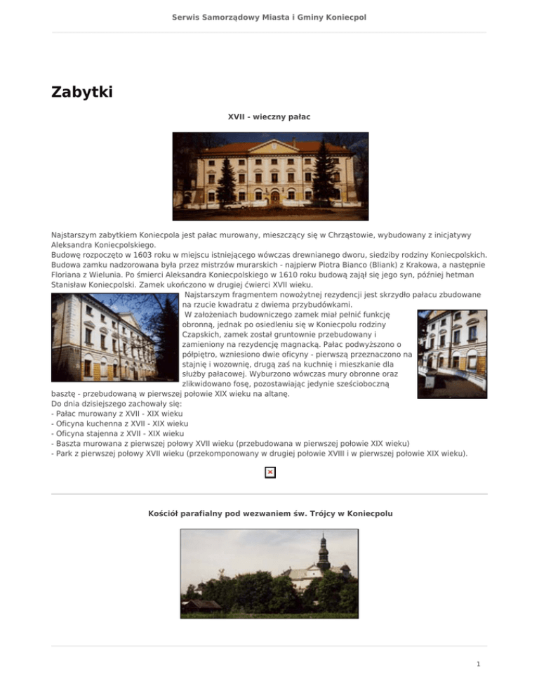 Serwis Samorządowy Miasta i Gminy Koniecpol Zabytki XVII - wieczny pałac Najstarszym zabytkiem Koniecpola jest pałac murowany, mieszczący się w Chrząstowie, wybudowany z inicjatywy Aleksandra Koniecpolskiego. Budowę rozpoczęto w 1603 roku w miejscu istniejącego wówczas drewnianego dworu, siedziby rodziny Koniecpolskich. Budowa zamku nadzorowana była przez mistrzów murarskich - najpierw Piotra Bianco (Bliank) z Krakowa, a następnie Floriana z Wielunia. Po śmierci Aleksandra Koniecpolskiego w 1610 roku budową zajął się jego syn, później hetman Stanisław Koniecpolski. Zamek ukończono w drugiej ćwierci XVII wieku. Najstarszym fragmentem nowożytnej rezydencji jest skrzydło pałacu zbudowane na rzucie kwadratu z dwiema przybudówkami. W założeniach budowniczego zamek miał pełnić funkcję obronną, jednak po osiedleniu się w Koniecpolu rodziny Czapskich, zamek został gruntownie przebudowany i zamieniony na rezydencję magnacką. Pałac podwyższono o półpiętro, wzniesiono dwie oficyny - pierwszą przeznaczono na stajnię i wozownię, drugą zaś na kuchnię i mieszkanie dla służby pałacowej. Wyburzono wówczas mury obronne oraz zlikwidowano fosę, pozostawiając jedynie sześcioboczną basztę - przebudowaną w pierwszej połowie XIX wieku na altanę. Do dnia dzisiejszego zachowały się: - Pałac murowany z XVII - XIX wieku - Oficyna kuchenna z XVII - XIX wieku - Oficyna stajenna z XVII - XIX wieku - Baszta murowana z pierwszej połowy XVII wieku (przebudowana w pierwszej połowie XIX wieku) - Park z pierwszej połowy XVII wieku (przekomponowany w drugiej połowie XVIII i w pierwszej połowie XIX wieku). Kościół parafialny pod wezwaniem św. Trójcy w Koniecpolu 1 Serwis Samorządowy Miasta i Gminy Koniecpol Wspaniałym zabytkiem miasta powstałym w XVII wieku jest kościół parafialny pod wezwaniem św. Trójcy. Zamiar wzniesienia świątyni w Koniecpolu podjęty został przez hetmana Stanisława Koniecpolskiego z chwilą otrzymania buławy polnej. Budowa jednak rozpoczęła się dopiero w 1633 roku, gdyż hetman Stanisław Koniecpolski w czasie wyprawy wojennej w 1620 roku dostał się do niewoli, z której powrócił w roku 1623. Kościół pod wezwaniem św. Trójcy to budowla wczesnobarokowa. Zbudowany został częściowo z cegły, a częściowo z kamienia cisowego, podobnie jak gzymsy wewnątrz i na zewnątrz kościoła. Świątynię zbudowano na rzucie prostokąta z prezbiterium zamkniętym ścianą prostą. Kościół posiada sklepienia kolebkowe, nad krzyżem transeptu - sklepienie kopulaste, natomiast w zakrystii kolebkowo - krzyżowe. Wokół kościoła biegnie mur z ozdobną bramą wraz z dzwonnicą i zegarnicą - umieszczonymi w narożach prostokąta od strony frontu. Warto zwrócić uwagę na bogate wnętrze świątyni. Składają się nań: - Ołtarz główny pochodzący prawdopodobnie z XVII wieku - Obraz św. Trójcy z XVII wieku - Osiem barokowych ołtarzy bocznych - Ambona barokowa datowana na połowę XVII wieku, rzeźbiona figurami świętych - Zacheuszki rokokowe z drugiej połowy XVII wieku, zapalane tylko podczas uroczystości konsekracji kościoła - Symboliczny nagrobek hetmana Stanisława Koniecpolskiego w formie sarkofagu z rzeźbą leżącego rycerza, wystawiony przez Henryka Potockiego - XIX - wieczna kopia obrazu Henryka Potockiego z XVII wieku przedstawiająca hetmana Stanisława Koniecpolskiego na koniu. W prawym dolnym rogu płótna umieszczony jest monogram H.P. (Henryk Potocki) jako tego, który pierwszy namalował portret hetmana, a nieco na prawo widnieje monogram C.N. (prawdopodobnie Cyprian Norwid) z datą 1841 rok. Kościół parafialny pod wezwaniem św. Michała Archanioła Kościół parafialny pod wezwaniem św. Michała Archanioła wzniesiony został w 1767 roku przez Michała Czapskiego, wojewodę malborskiego. Na początku XVI wieku w Chrząstowie znajdował się murowany kościół pod wezwaniem Świętych Apostołów Mateusza i Macieja. Prawdopodobnie był on bardzo zniszczony, gdyż w 1544 roku zawalił się. Na jego miejscu zbudowany został przez Koniecpolskich następny kościół, który istniał aż do XVII wieku. Dopiero w 1765 roku zniszczoną świątynię kazał rozebrać Michał Czapski i na jej miejscu wzniósł po dwóch latach nową, murowaną. Kościół św. Michała Archanioła to budowla późnobarokowa, otoczona starym murem z bramą od frontu i dzwonnicą za prezbiterium. Świątynia składa się z krótkiego, prostokątnego prezbiterium. Za prezbiterium znajduje się zakrystia ze skarbczykiem na pistule. Nawa wewnątrz kościoła zbudowana jest na rzucie prostokąta i podzielona pilastrami na dwa przęsła. W prezbiterium i nawie sklepienia są płaskie, natomiast w zakrystii - kolebkowe z lunetami. Okna kościoła umieszczone na szczycie mają kształt półkolisty, otoczone są profilowanymi obramówkami. Pozostałe okna mają kształt prostokątny, także profilowane obramowania. Dach świątyni jest dwuspadowy, kryty dachówką. Na szczycie znajduje się wieżyczka na sygnaturkę. Wnętrze kościoła nie jest tak bogate jak kościoła św. Trójcy: - W prawym bocznym ołtarzu - obraz Matki boskiej Bolesnej. To obraz barokowy, pochodzący z przełomu XVII - XVIII wieku - Kropielnica z dawnej głowicy jońskiej, z kieleckiego marmuru. Kropielnica pochodzi z pałacu. Jej powstanie datuje się na pierwszą połowę XVII wieku. 2 Serwis Samorządowy Miasta i Gminy Koniecpol - Późnobarokowe ławki (druga połowa XVIII wieku) - Późnobarokowa dzwonnica z drugiej połowy XVIII wieku wkomponowana od wschodu w mur kościoła. Dzwonnica jest murowana w formie wysmukłej, eliptycznie przesklepiona arkadami, ujętej pilastrami. W kościele znajdują się też tablice pamiątkowe rodziny Potockich. Dom mieszkalny z XVII wieku w Koniecpolu Przy południowej pierzei rynku pod obecnym numerem 14 zachował się do dnia dzisiejszego mieszczański dom mieszkalny z XVII wieku. Powstał on w latach